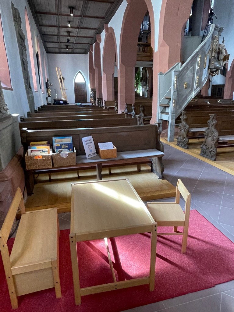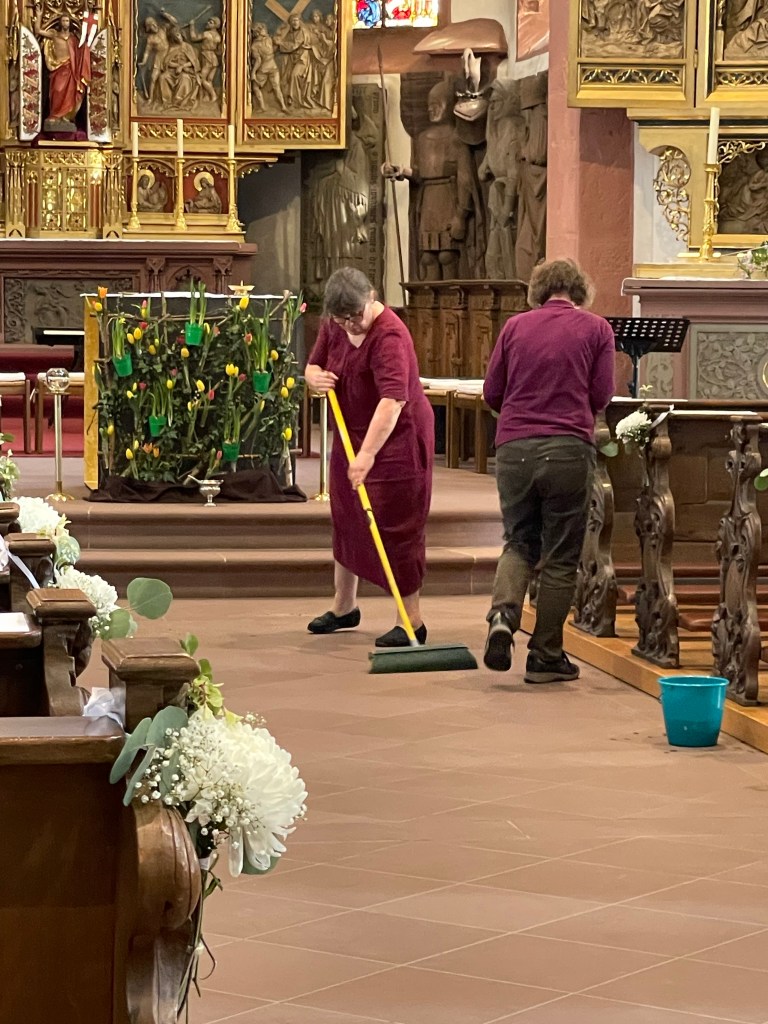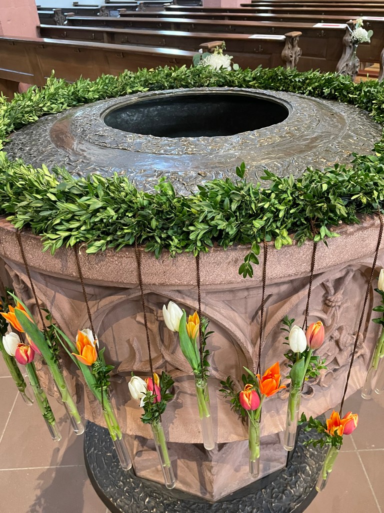 There were 2 women cleaning and preparing for a First Communion Service here tomorrow morning. Notice how the baptismal font is decorated with fresh-cut tulips.