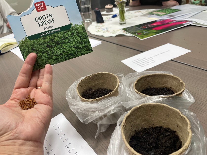 Today we worked on the German alphabet and we each got a cup of dirt and some Kresse seeds to plant. Next week we’ll be learning how to make Frankfurter Grüne Soße (green sauce) that’s traditionally served with boiled potatoes and hardboiled eggs. Kresse is one of the 7 traditional herbs ingredients in the sauce.