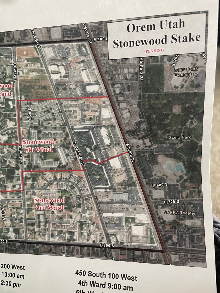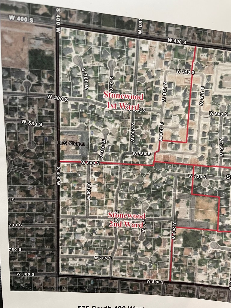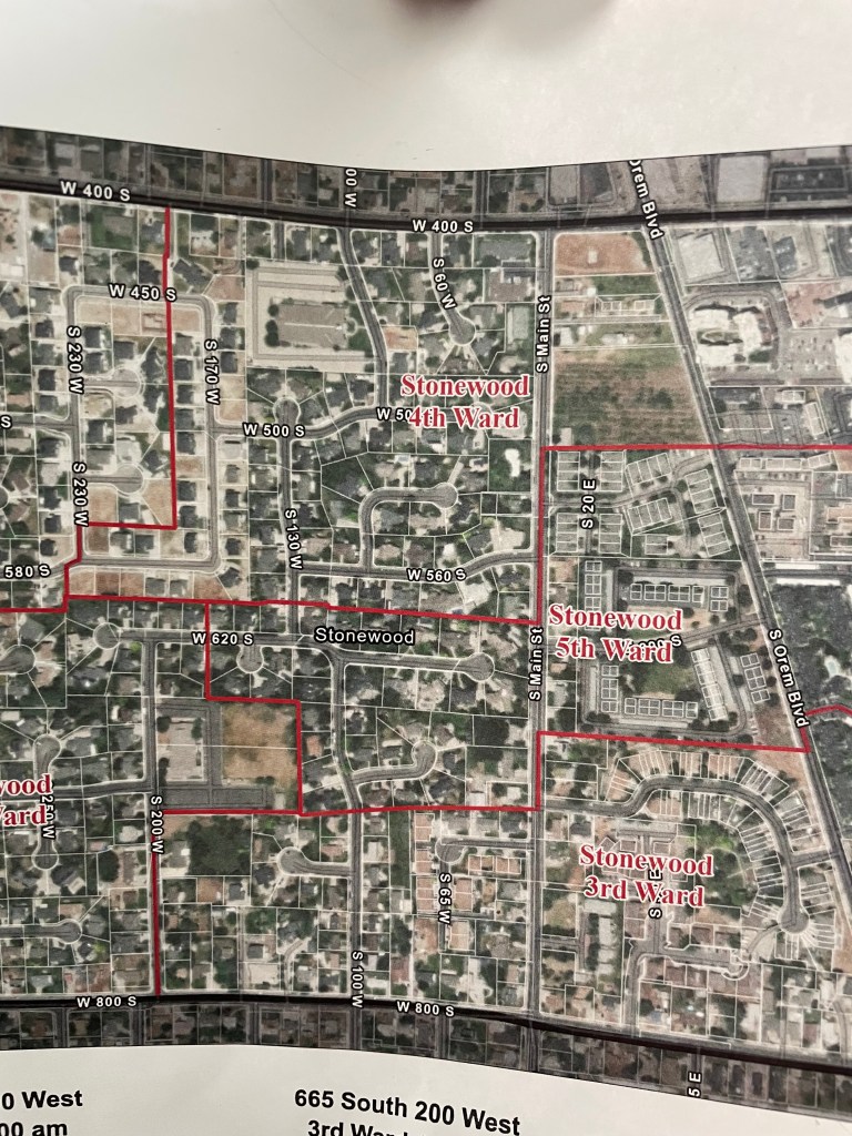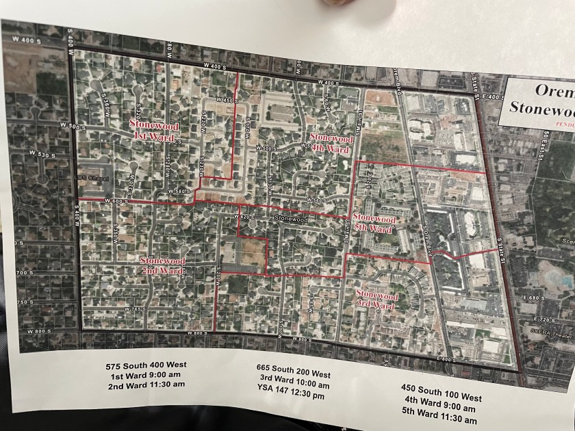 Sunday I got to attend our Stonewood 4th Ward. A couple of weeks ago all of the ward boundaries in our Stake were realigned. Every ward had changes. Here’s a map of our stake and the new ward boundaries.