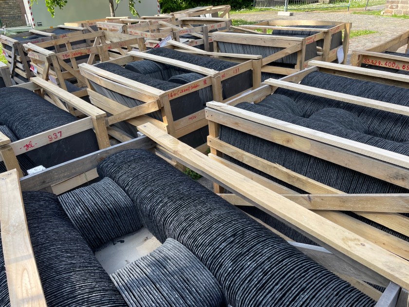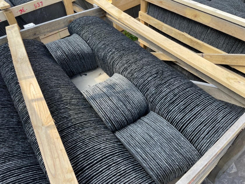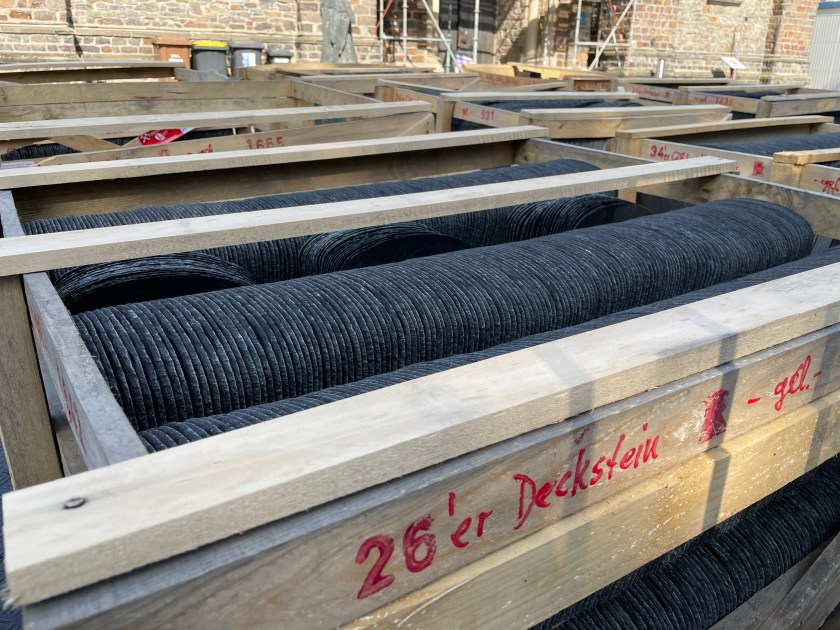 For me, the most interesting part was seeing these crates in the courtyard filled with slate tiles for a new roof.