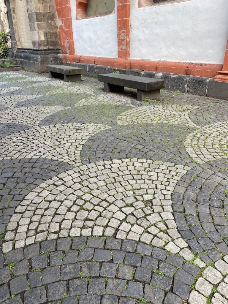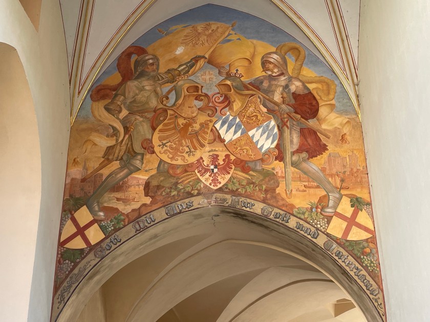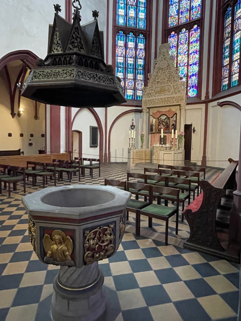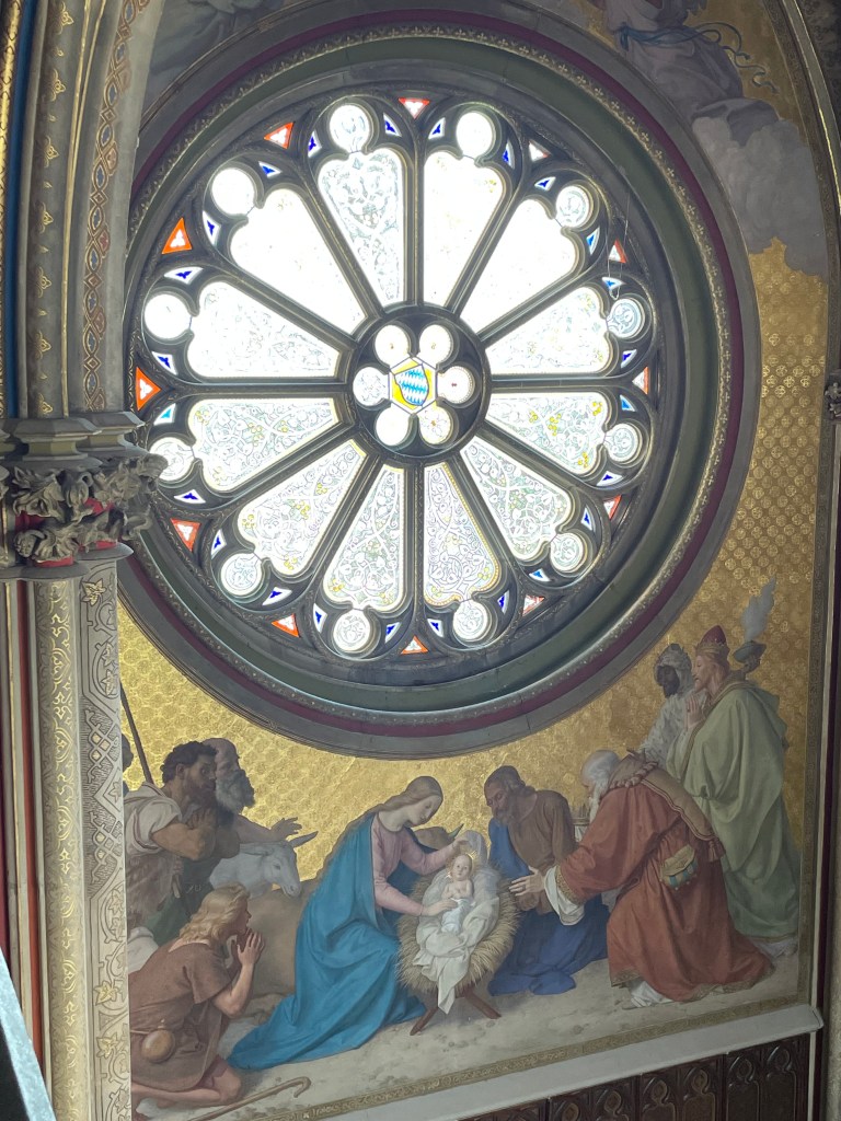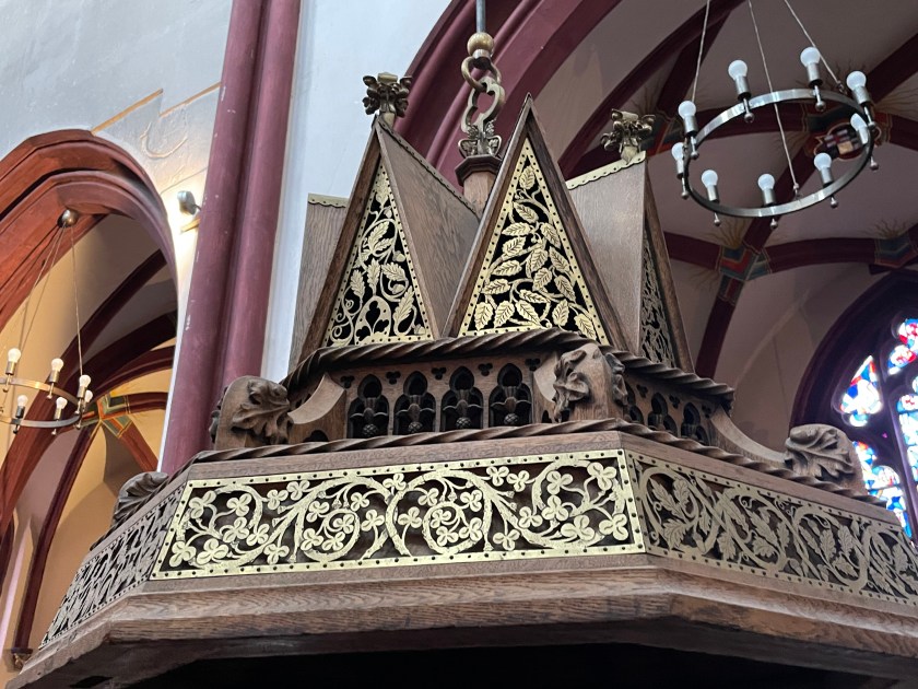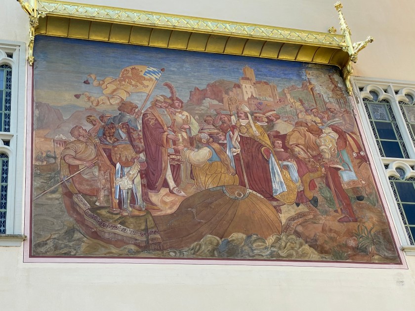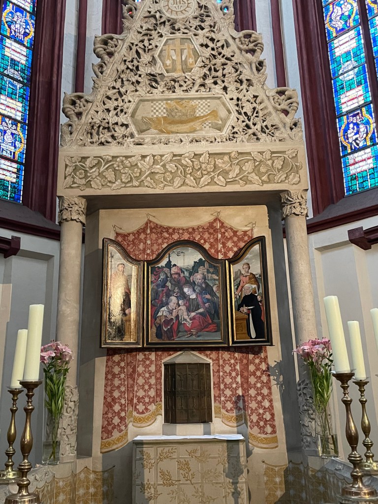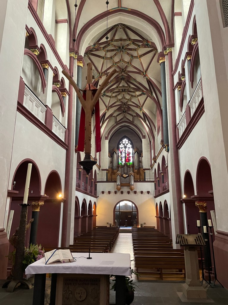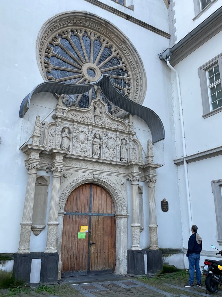 Here’s the history of this church–First built about 1180, added to in the 14oos, the baroque towers were added in 1693, badly damaged during the war in 1944, rebuilt by 1957, new choir windows in 1992, interior restoration in 2000.