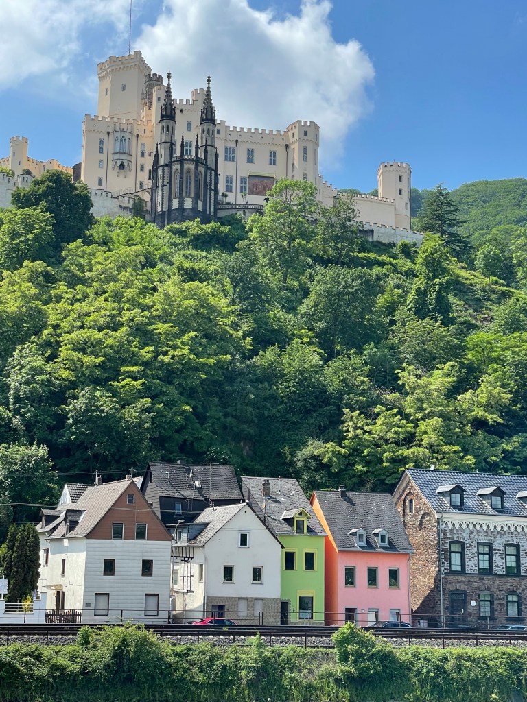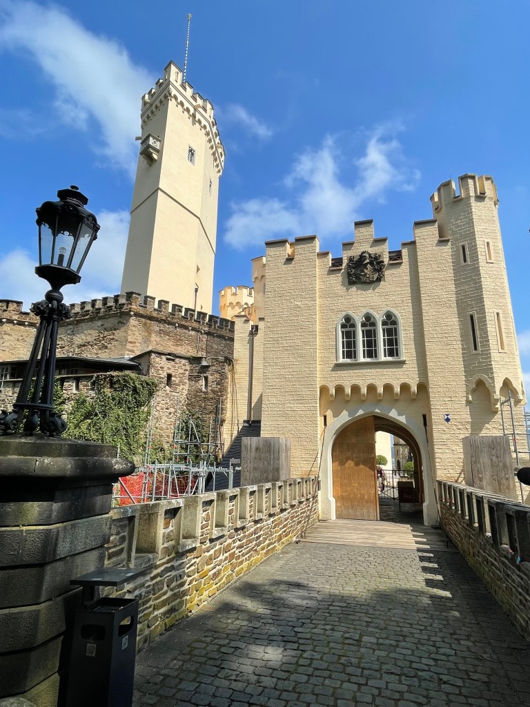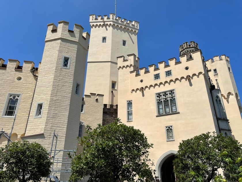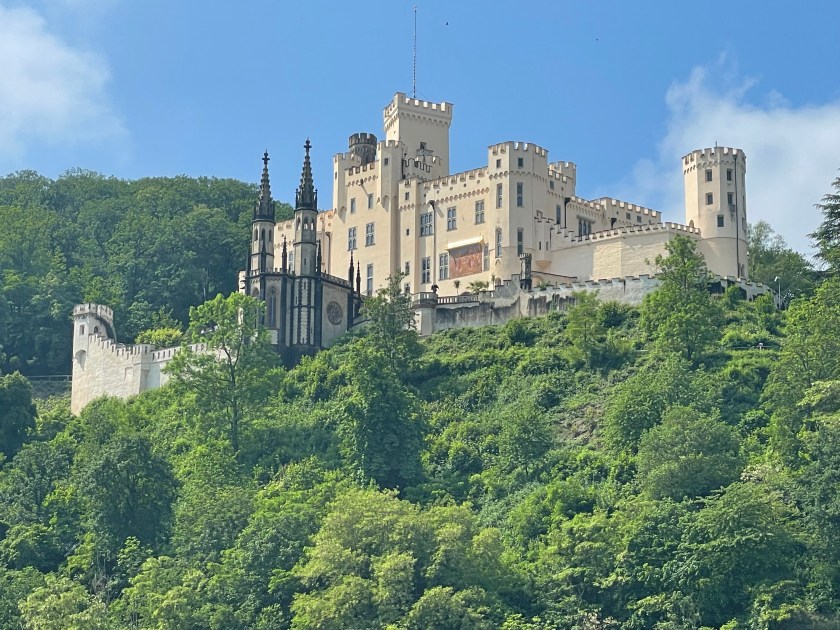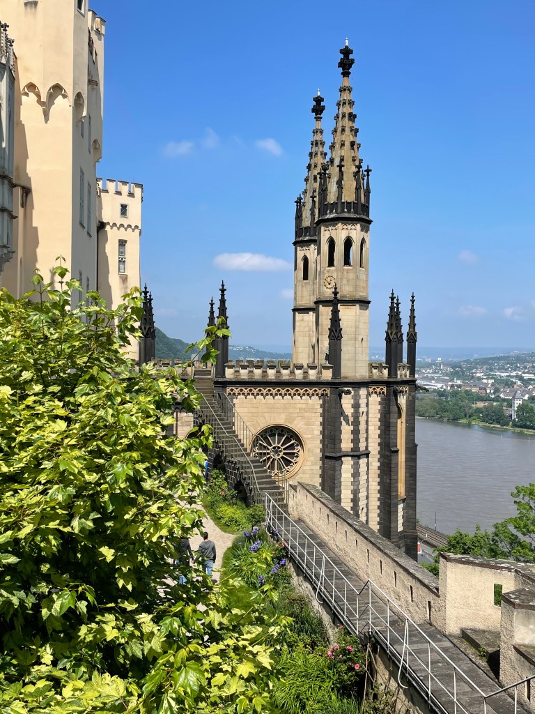 Wikipedia: Stolzenfels Castle is a former medieval fortress castle (“Burg”) turned into a palace, near Koblenz on the left bank of the Rhine, in the state of Rhineland-Palatinate, Germany. Stolzenfels was a ruined 13th-century castle, gifted to the Prussian crown prince, Frederick William in 1823. He had it rebuilt as a 19th-century palace in Gothic Revival style. Today, it is part of the UNESCO World Heritage Site Upper Middle Rhine Valley.