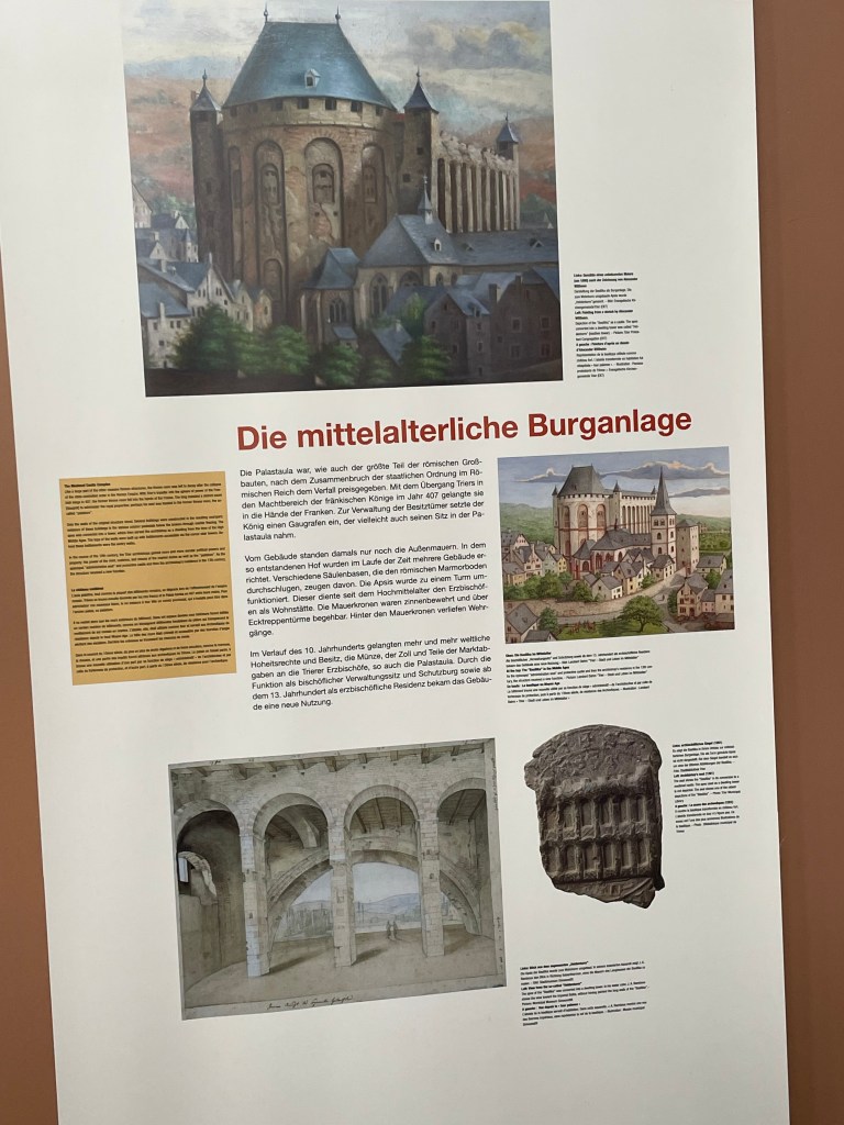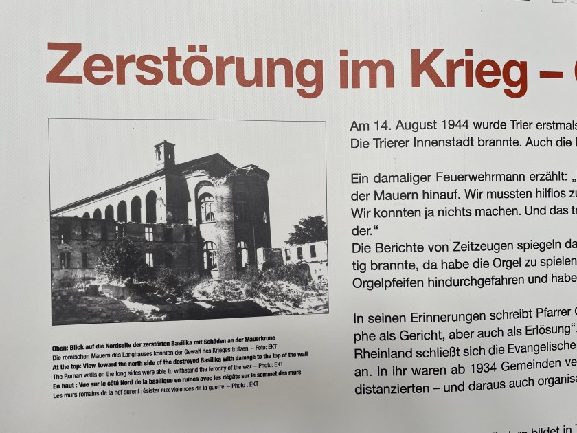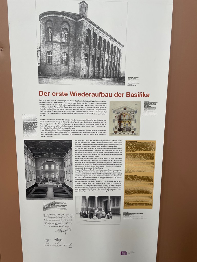 In the early Middle Ages, the burnt-out ruins came into the possession of the bishops of Trier . They converted them into a castle-like property. In 1614, the south and east walls were demolished and the rest was integrated into the new bishop’s residence, the Electoral Palace . Between 1844 and 1856, the church-like building was restored, consecrated on September 28, 1856 [2] and handed over “for all eternity” to the Protestant parish, which has used it as a church ever since. On August 14, 1944, the basilica was badly damaged by an American air raid and burned down completely. It was rebuilt in the 1950s. The interior design was reduced to exposed stone exterior walls and a wooden coffered ceiling.