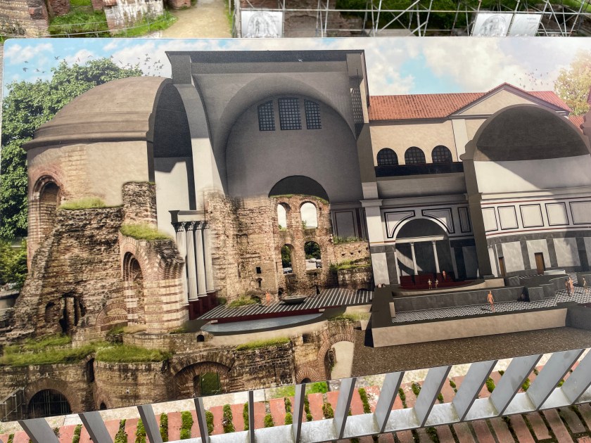 This tower was constructed to give a good view out over the bath complex. It was really remarkable. All this is located next to the palace quarter and the basilica. The visitor’s center had an animated film showing the development and use of the baths in this area. It was fascinating.