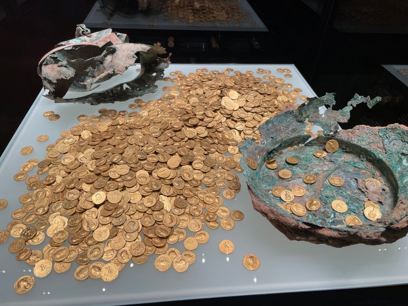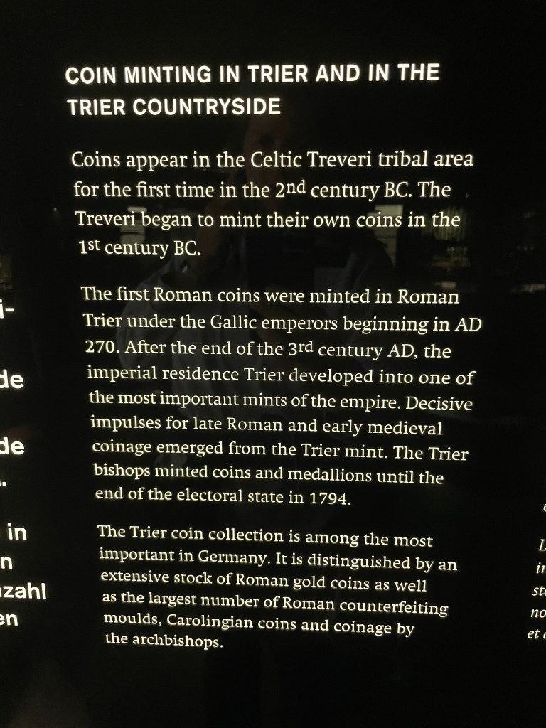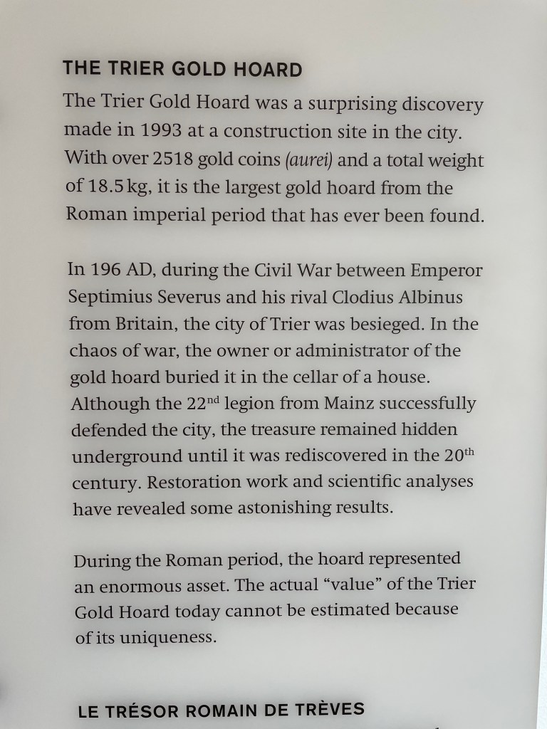 The “Trier Gold Hoard,” kept here in a vaulted room, is the largest Roman gold hoard ever discovered. Twenty-five hundred gold coins weighing 18.5 kilograms, were found during an excavation in 1993, nearly 1,800 years after it was hidden.