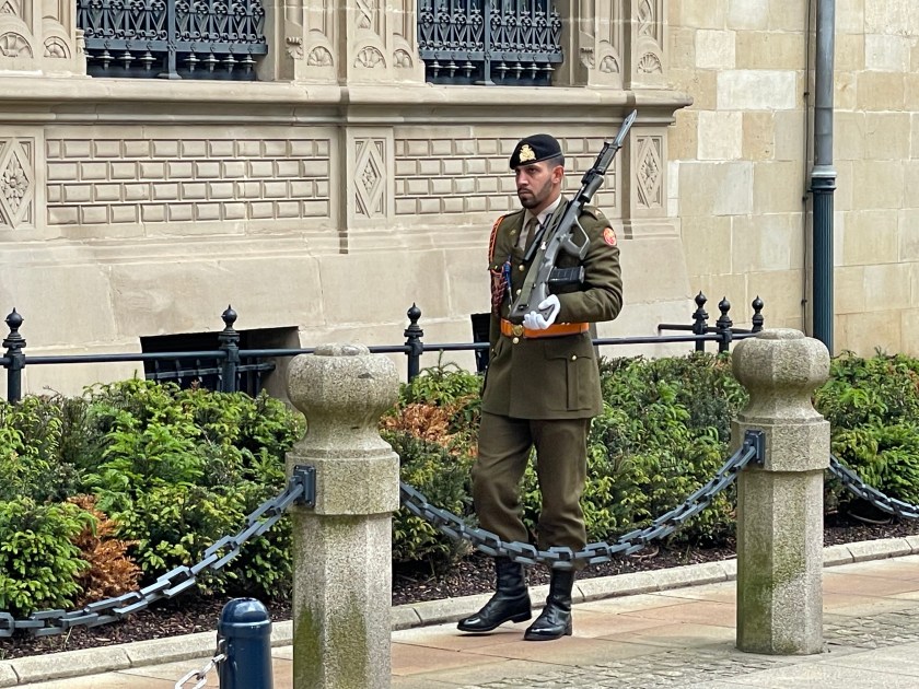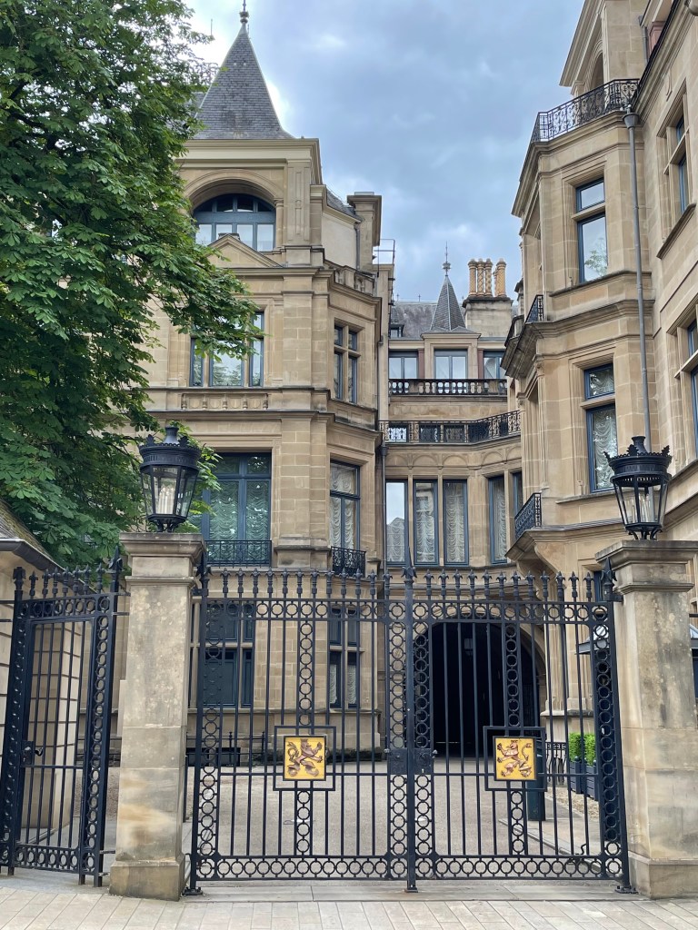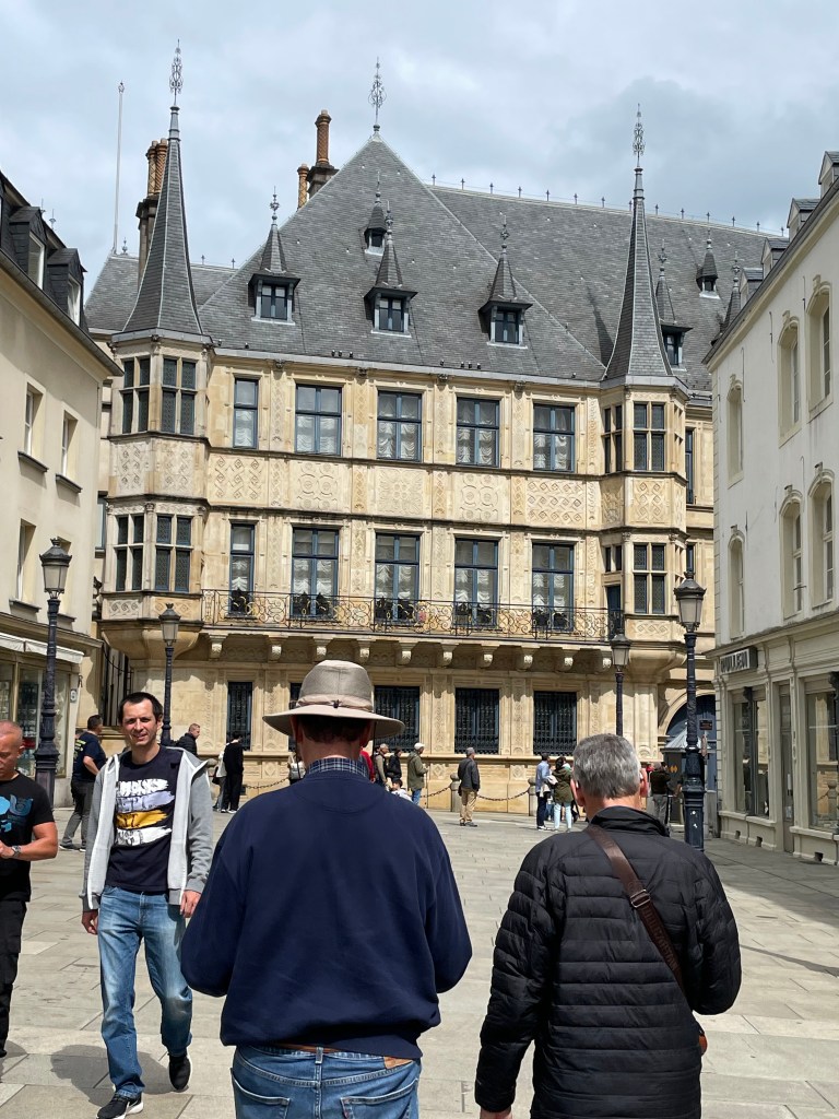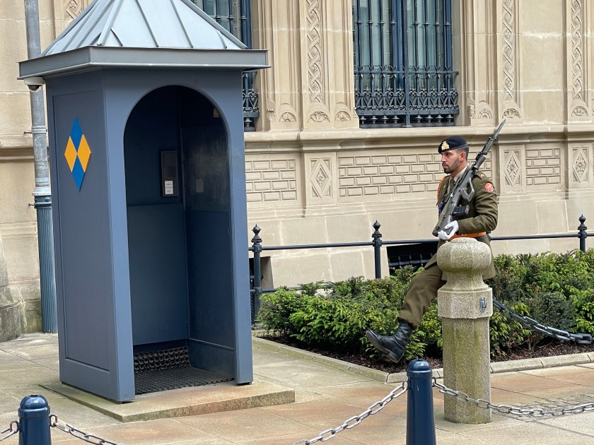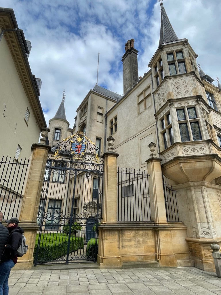 From the big plaza we went a block or two to see the Grand Palace of the Grand Duke and duchess of Luxembourg , Henri and Maria-Theresa. A very formal, stiff guard marched back and forth in front of the door. Next to that was Parliament (Chamber of Deputies).