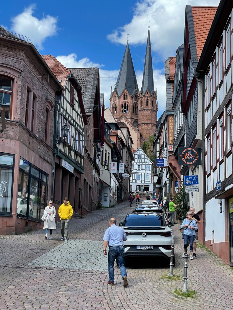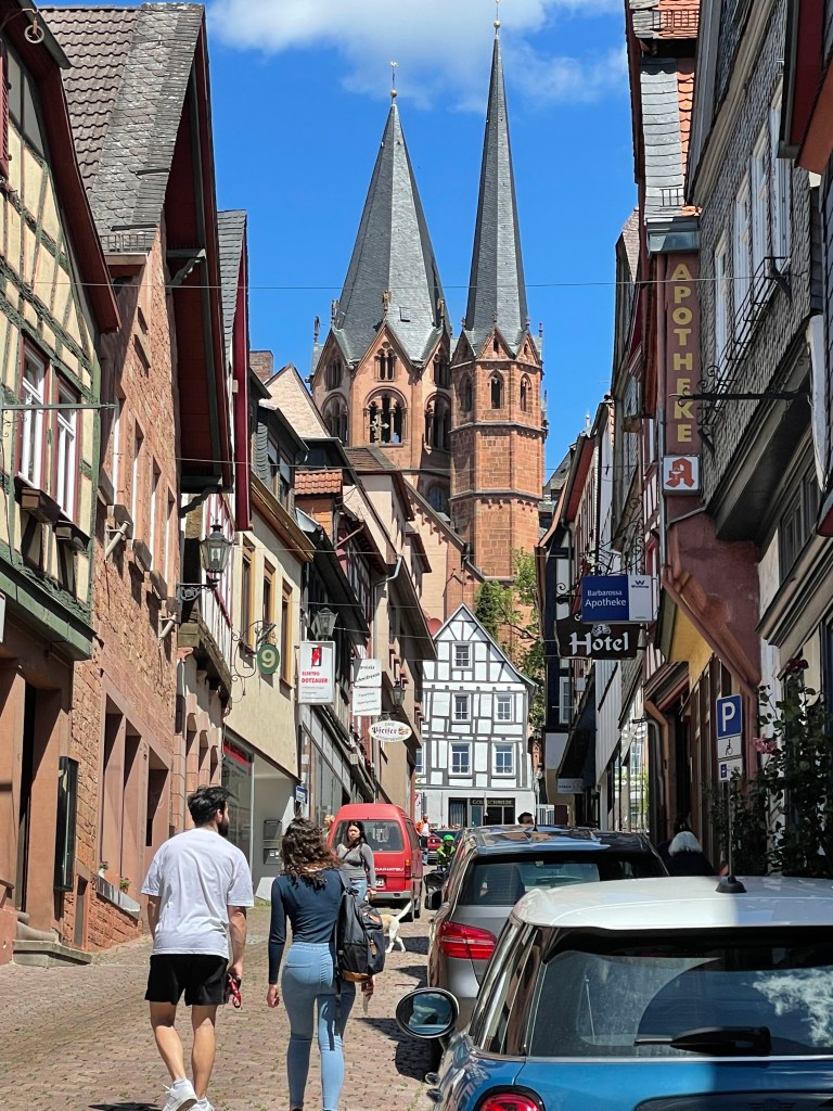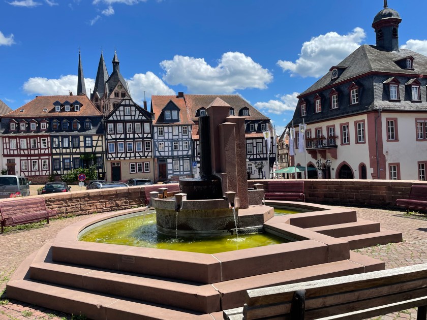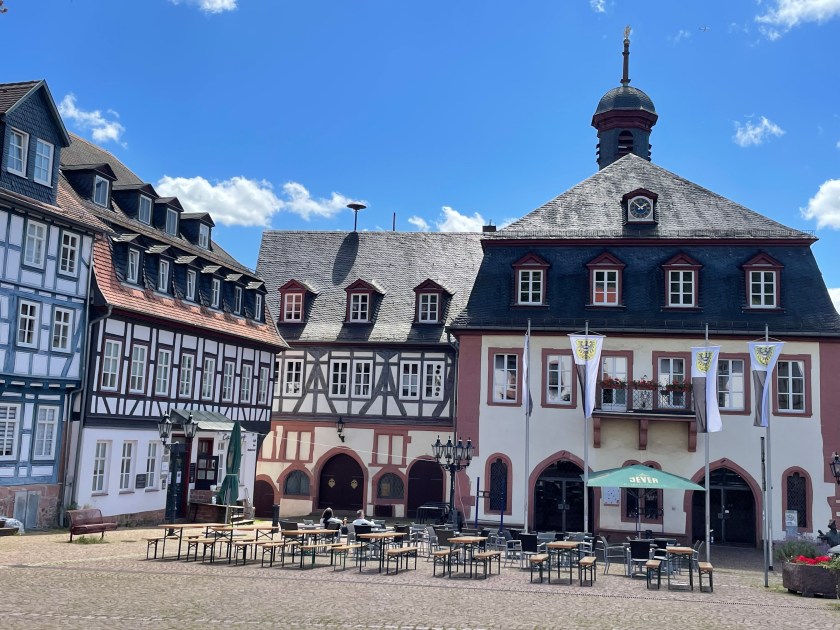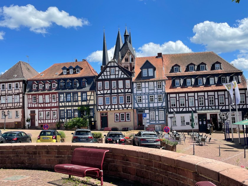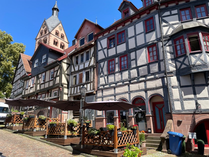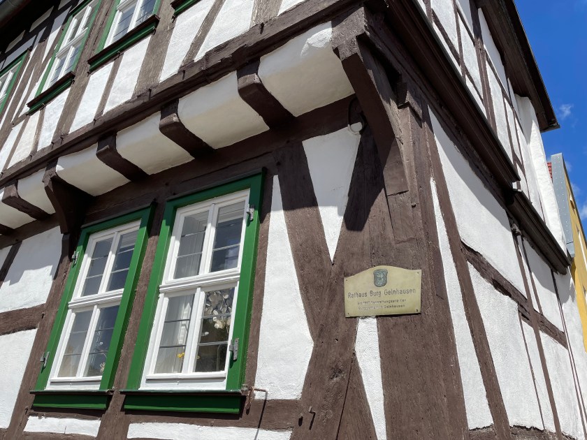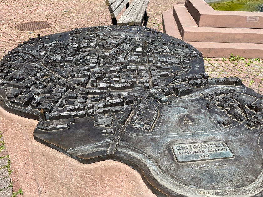 We spent a few hours wandering in Gelnhausen today. You can see how the river flows around the castle area we just visited. The ruins today are in yellow.