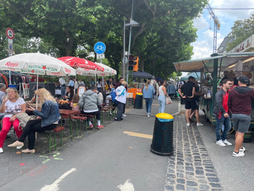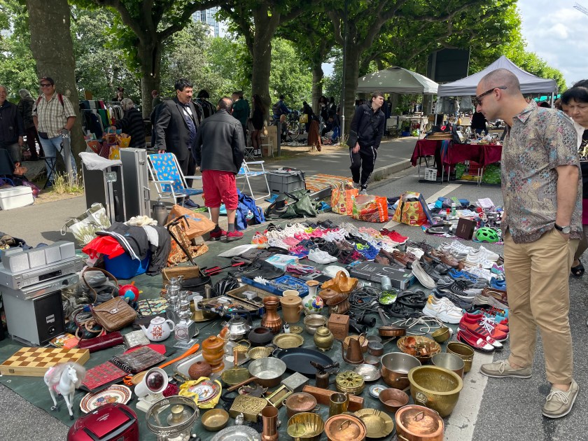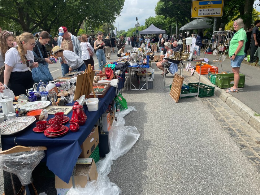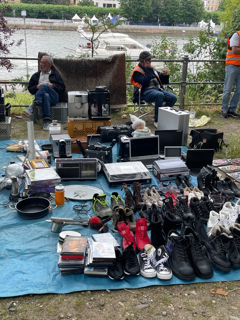 I suppose when most people live in apartments with no yards, there aren’t many yard sales on weekends. We happened upon this yard sale/ flea market event as we walked along the Main River today. It was pretty fun to look at all the junk. Of course we found one pile of treasures.