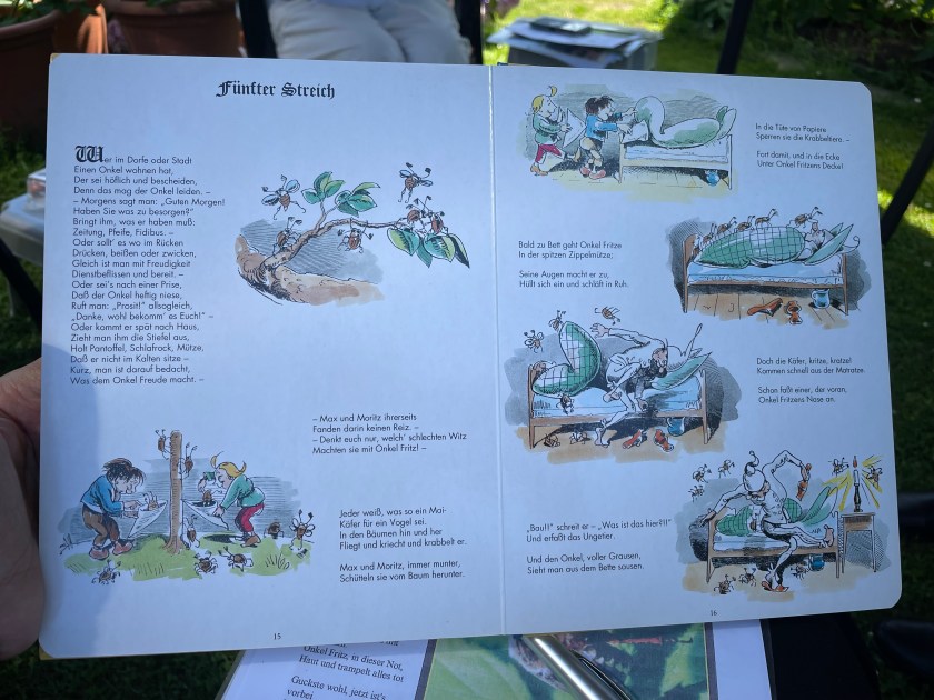 For the last couple of years I’ve been reading the names Max und Moritz in my German lessons. I had no idea who they were. Well, today I learned. Sis Enger taught us about these two pranksters from an old book written and illustrated by Wilhelm Busch in 1865 called “Max and Moritz: A Story of Seven Boyish Pranks” It’s an inventive, blackly humorous tale, told entirely in rhymed couplets, about two boys who play pranks.