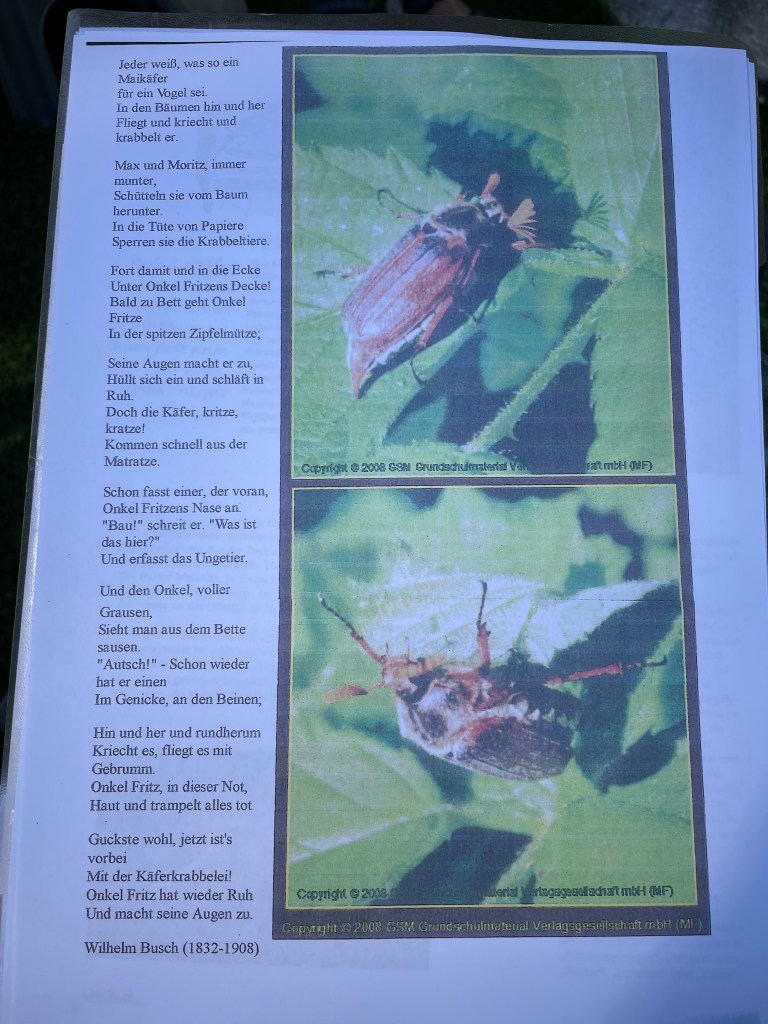 Our lesson was about May Beetles or Maikaefer (similar to our June Bugs). In the book, the boys collect bags full of May bugs, which they promptly deposit in their Uncle Fritz’s bed. Uncle Fritz is nearly asleep when he feels the bugs walking on his nose. Horrified, he goes into a frenzy, killing them all before going back to sleep.