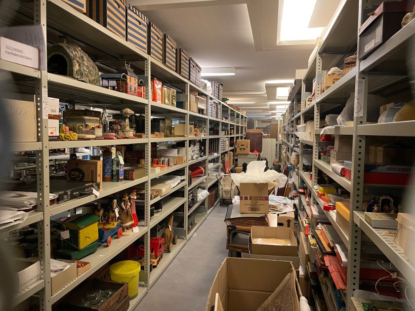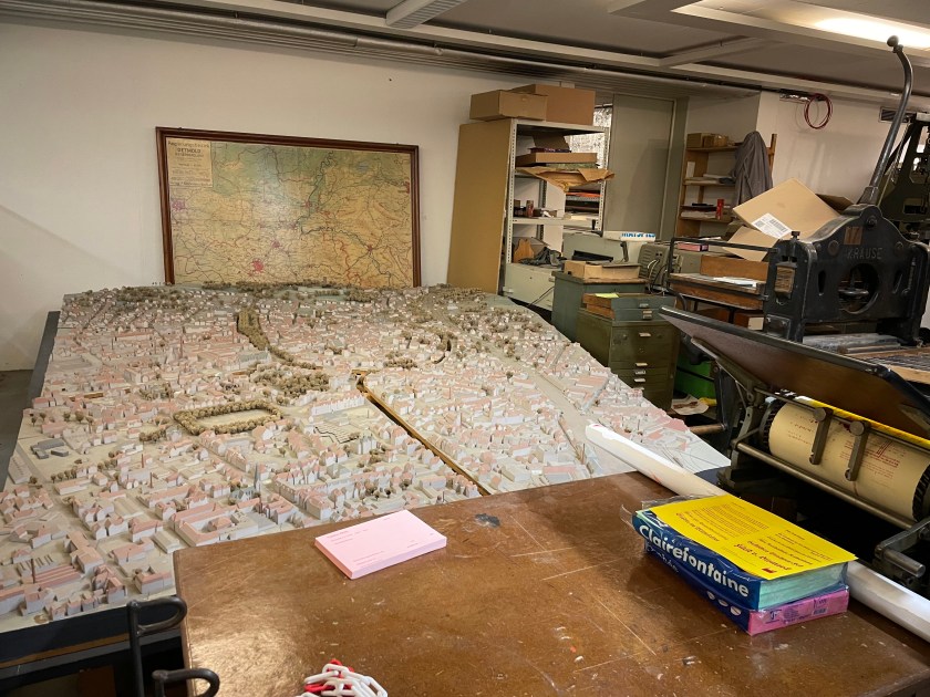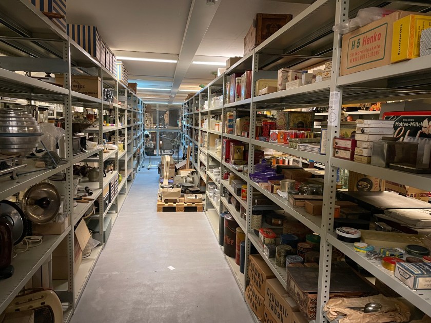 The museum was great–the best part was that they took us down into the underground storage areas of the museum where we saw rows and rows of shelves filled with treasures that may never see the light of day up above in the displays. They are working on a panorama of Bielefeld down here.