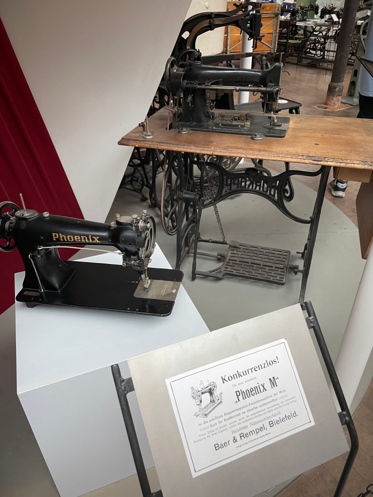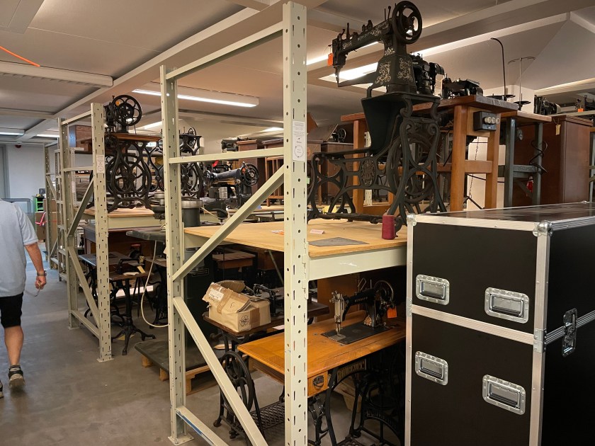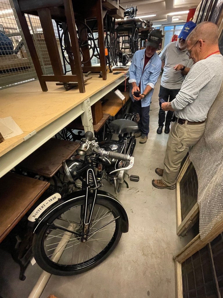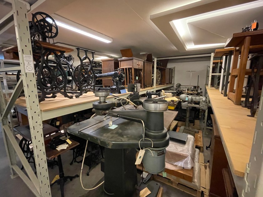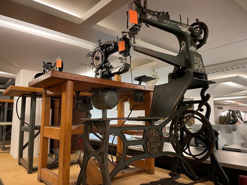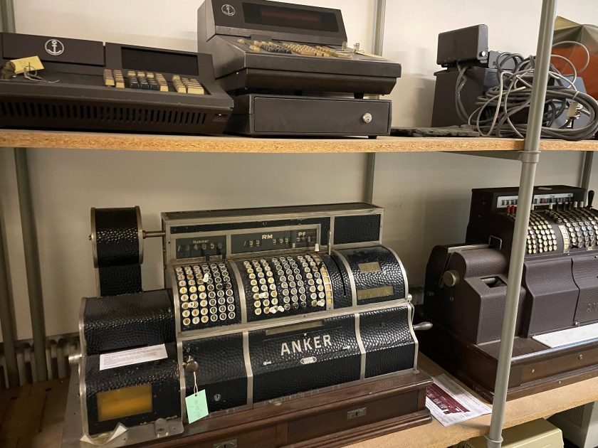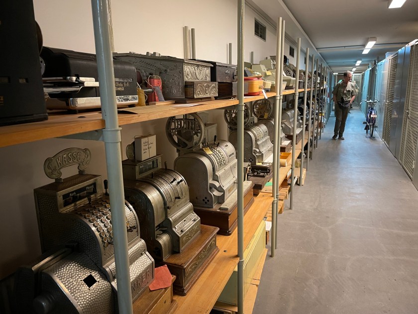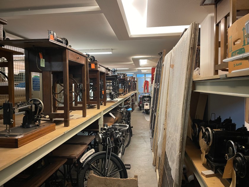 In the basement they showed us Bastert bicycles and motorcycles in their collections. Bielefeld had several factories–there was a big factory that made sewing machines, a factory that made adding machines, linen making factories with weavers, and factories where clothing was sewn. This basement storage area was filled with items from these factories through the years.