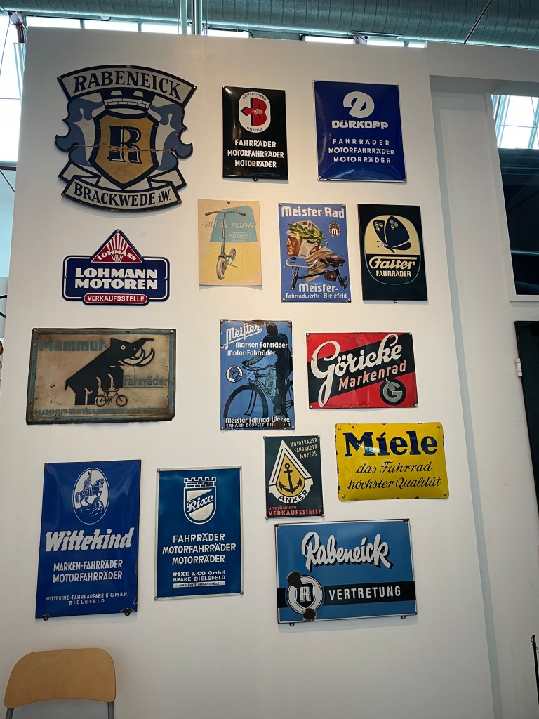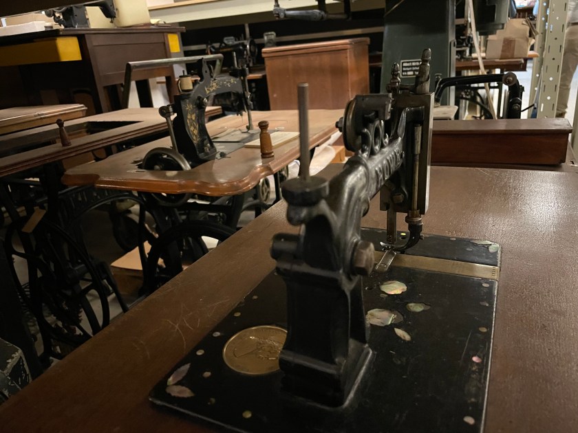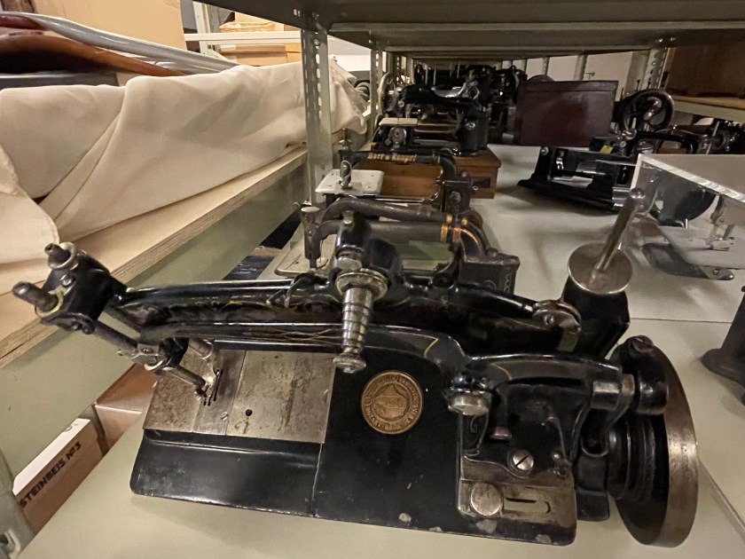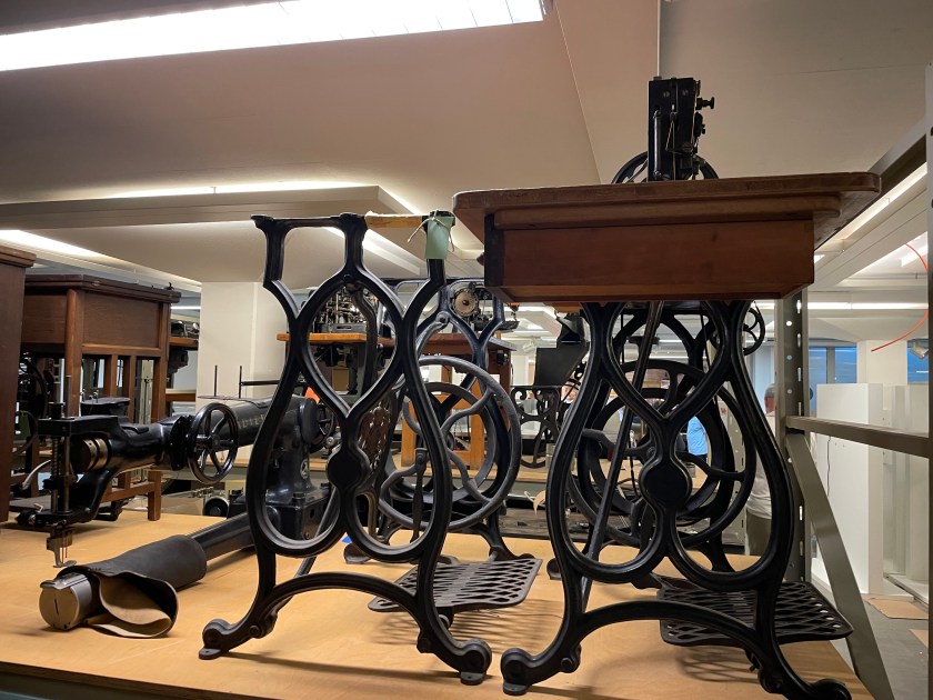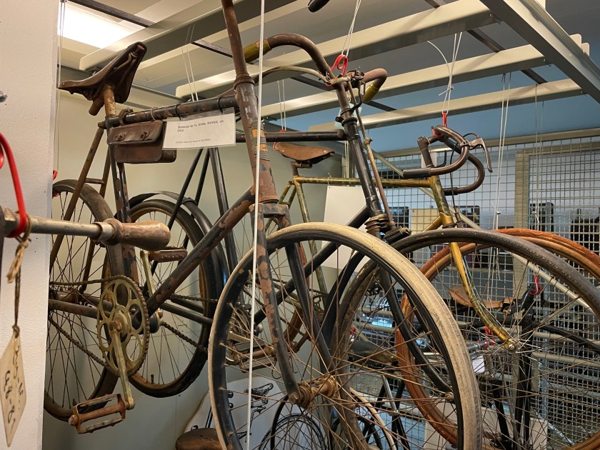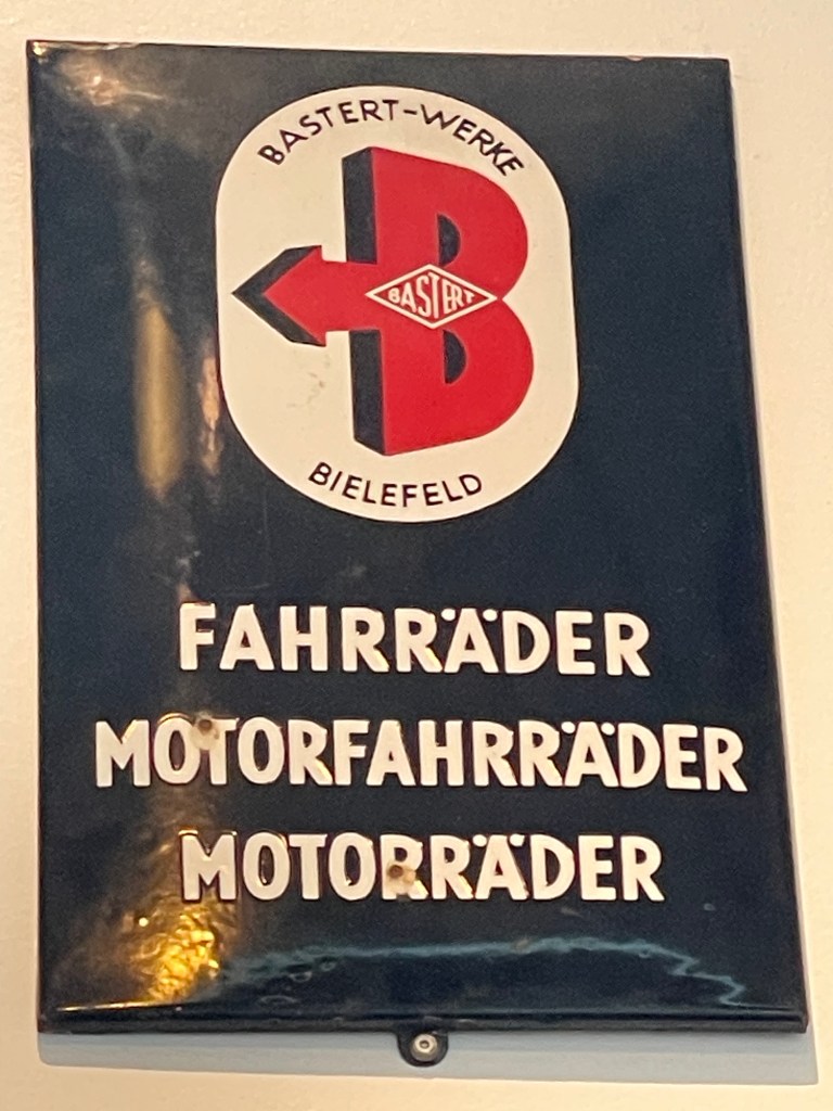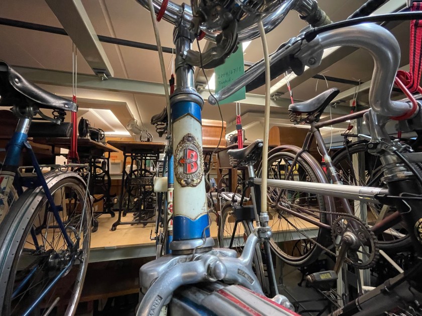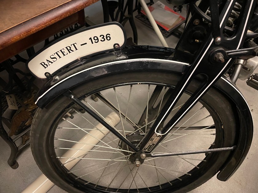 In the basement they showed us Bastert bicycles and motorcycles in their collections. Bielefeld had several factories–there was a big factory that made sewing machines, a factory that made adding machines, linen making factories with weavers, and factories where clothing was sewn. This basement storage area was filled with items from these factories through the years.