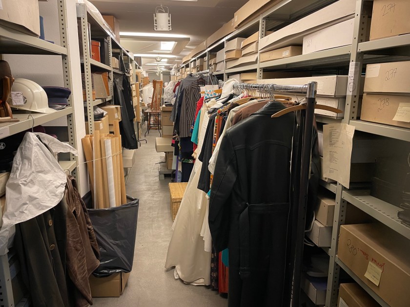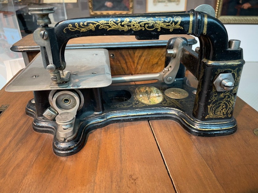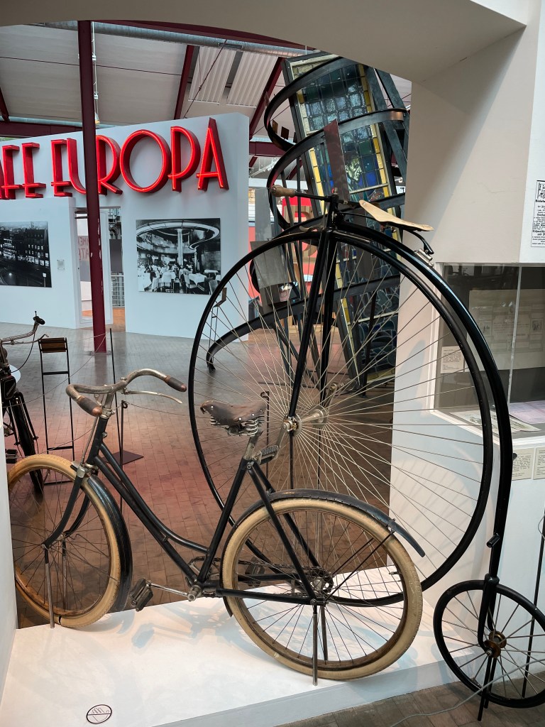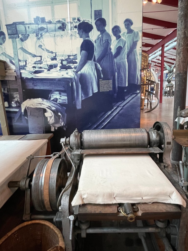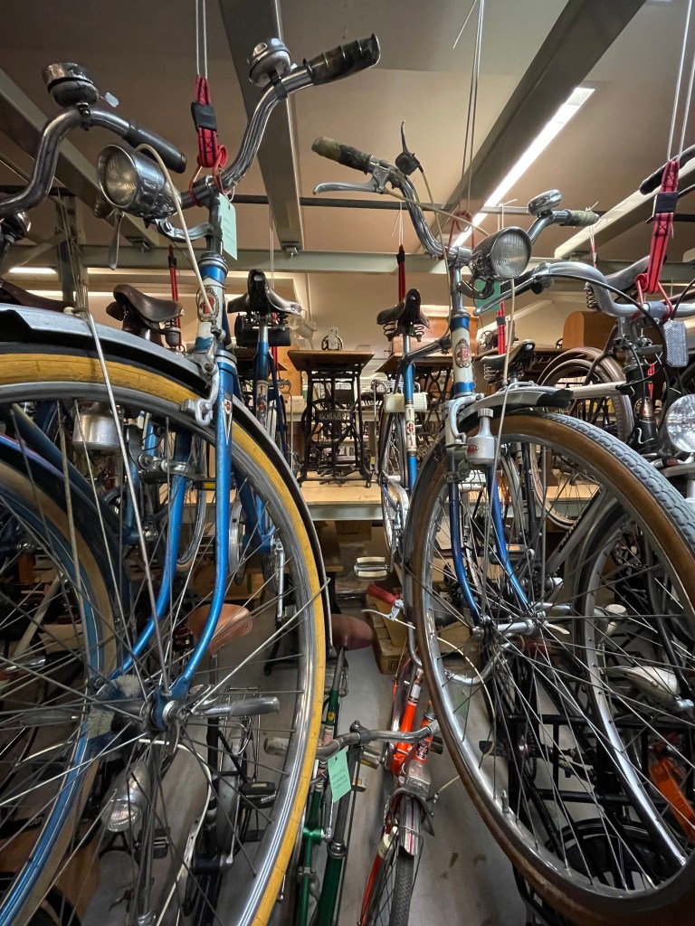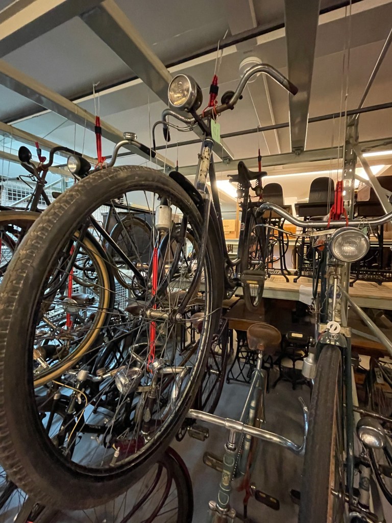 In the basement they showed us Bastert bicycles and motorcycles in their collections. Bielefeld had several factories–there was a big factory that made sewing machines, a factory that made adding machines, linen making factories with weavers, and factories where clothing was sewn. This basement storage area was filled with items from these factories through the years.