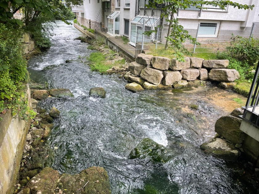 The water comes from mountains in the area, traveling underground for 4 days, before coming up in Paderborn. The water is clear and beautiful, but it has some chemicals in it that make it not safe for drinking. There are 6 different main streams that flow through the town from the springs to the river, which only runs a short distance before flowing (I think about 5 km) before flowing into the Lippe, which later flows into the Rhine.