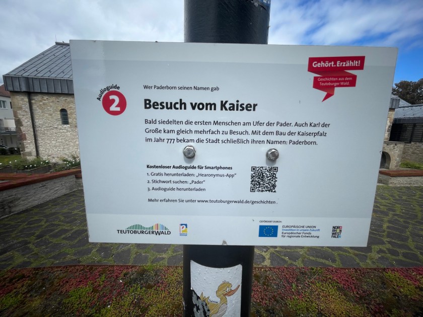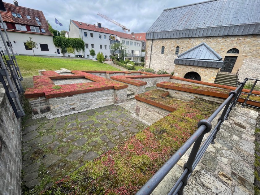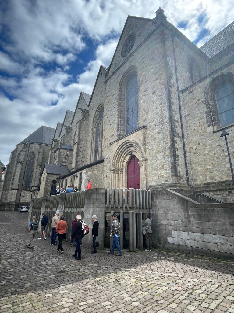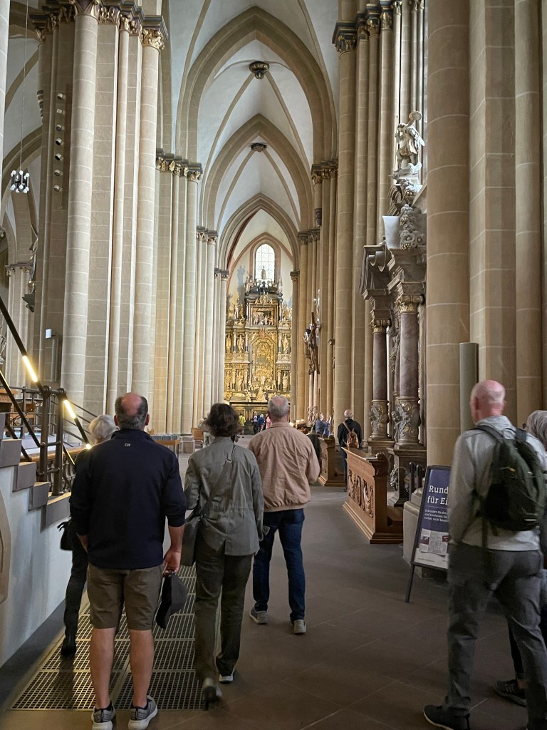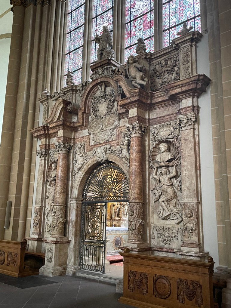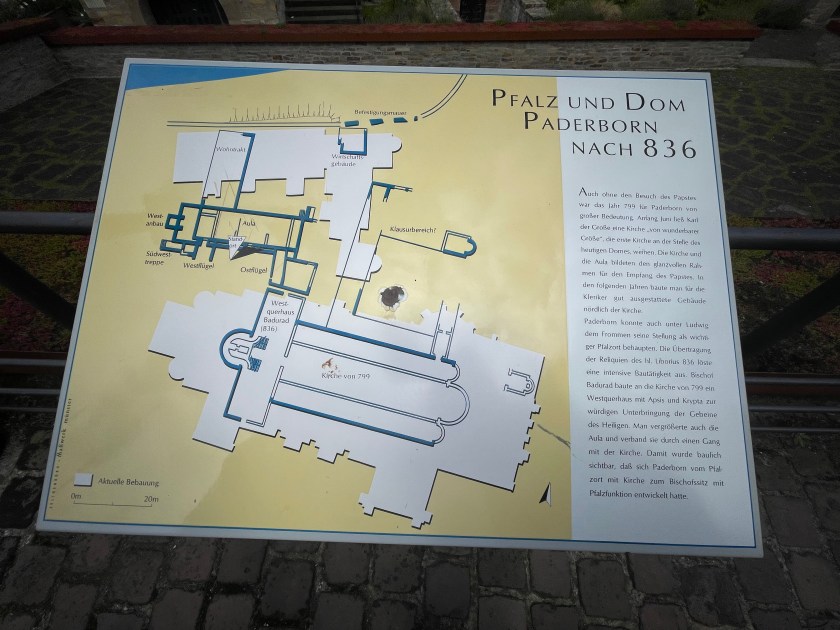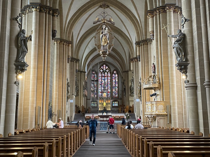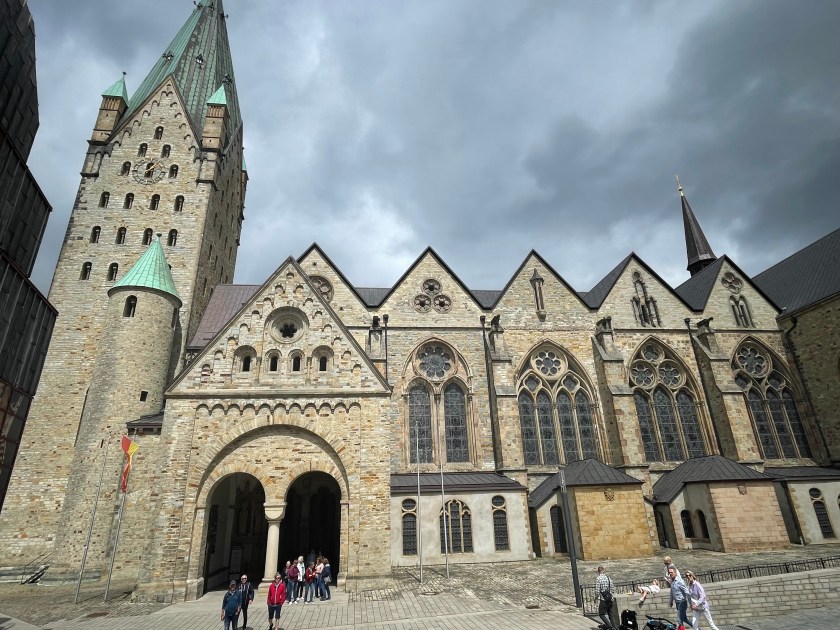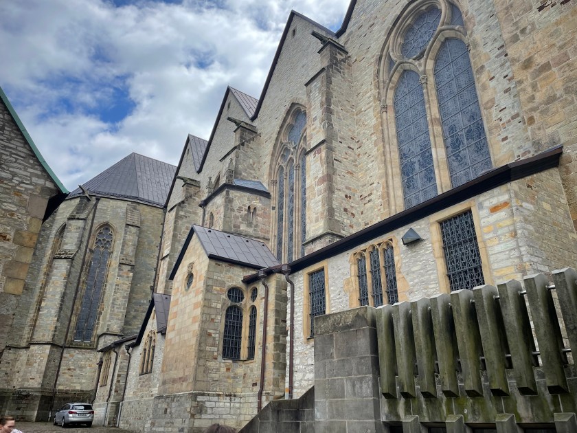 Volker took us to the Dom Cathedral in the center of town. It’s huge and it’s from the 1200s. The tower is 93 meters high, Romanesque, with a Gothic nave and windows. The crypt has a famous Saint in it, patron of the city. Outside the church are the foundation remains of a church owned or built (?) by Jerome, Napoleon’s brother.