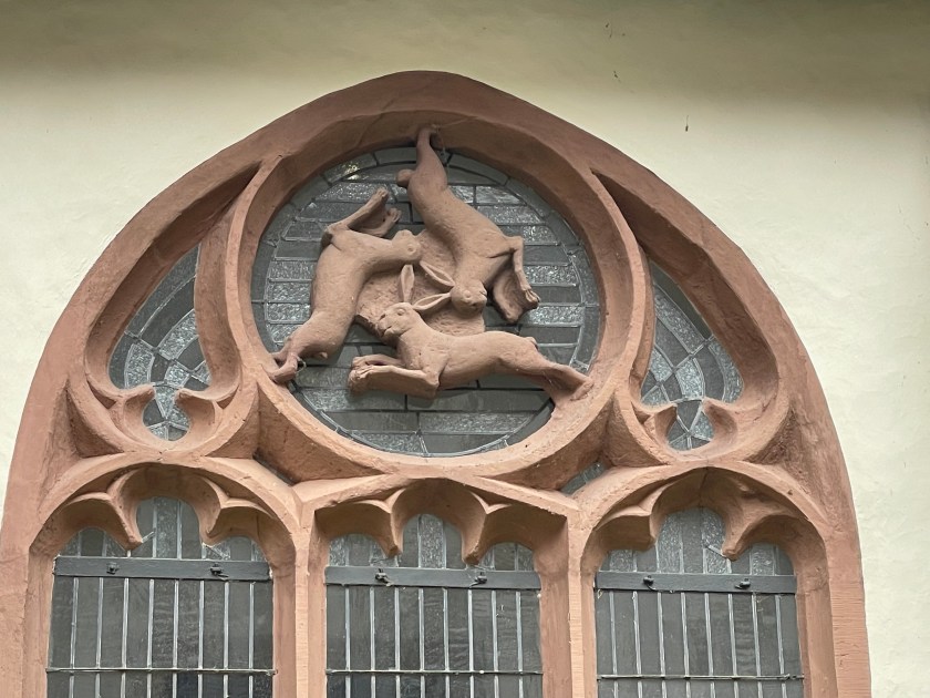 The “Three Hare’s Window” is one of the traditional symbols of Paderborn. The 3 rabbits’ ears come together in the middle and 3 ears look like each rabbit has 2 of them. It’s really creative. The three ears are arranged to form a triangle, with each pair of adjacent hares sharing an ear. The rabbits are chasing each other in a circle.