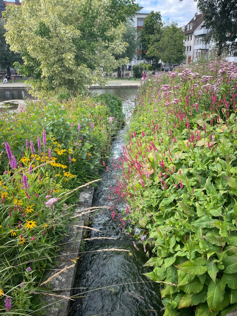 The city of Paderborn was founded in the 1200s, over the springs. Through the centuries, there have been lots of mills here and also breweries. At first they didn’t settle in the marshy wet areas, but it’s filled in and now there are beautiful walkways and nicely landscaped areas where the water and ponds are with lots of wildflowers and ducks.