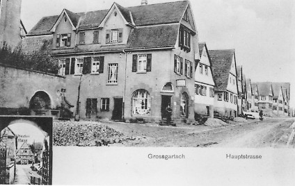 Here’s an old postcard of the Hauptstrasse, or main street in Grossgartach showing Grandma’s house as it looked when she lived here, with their shop inside the front door.