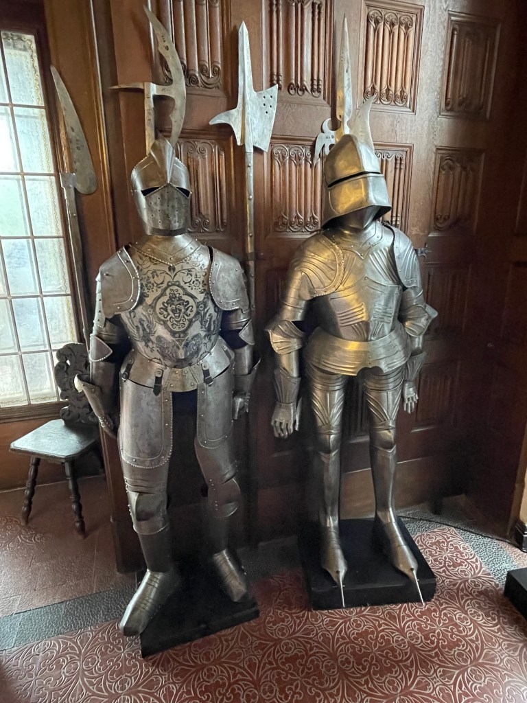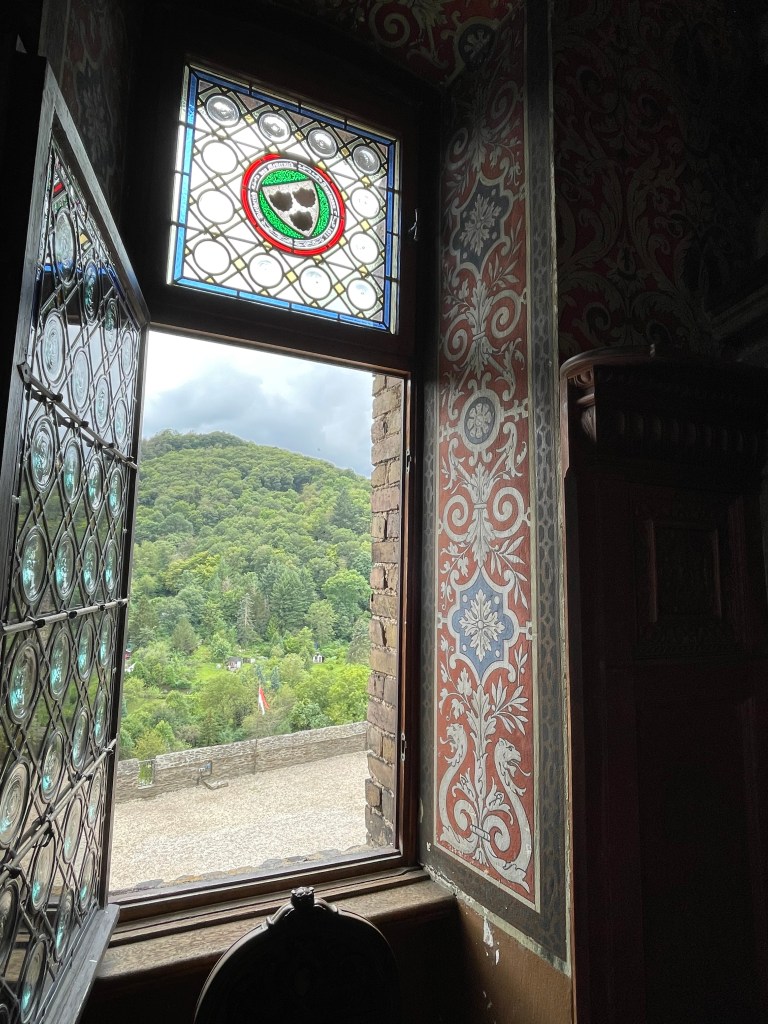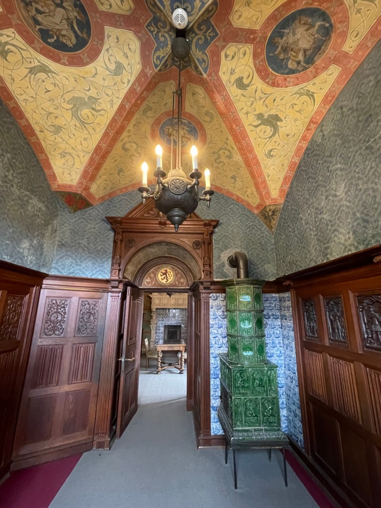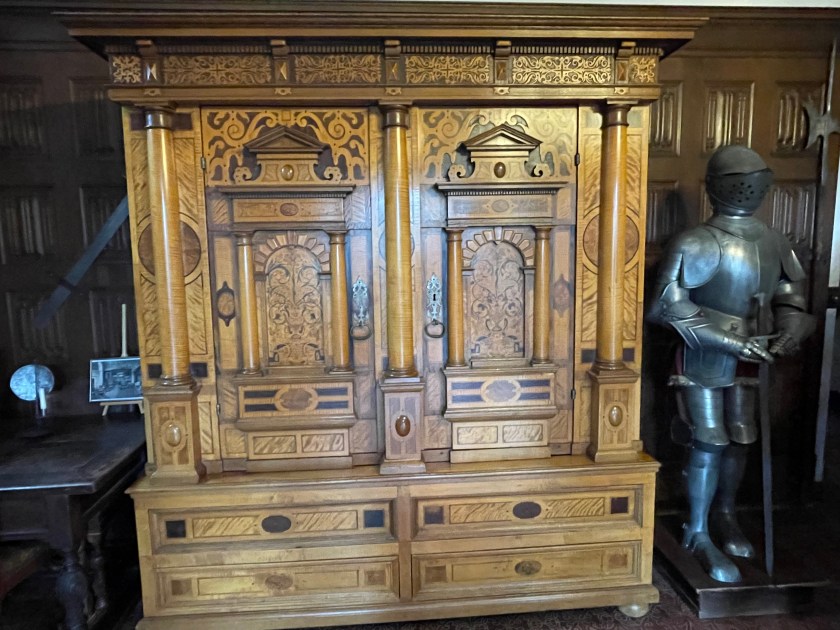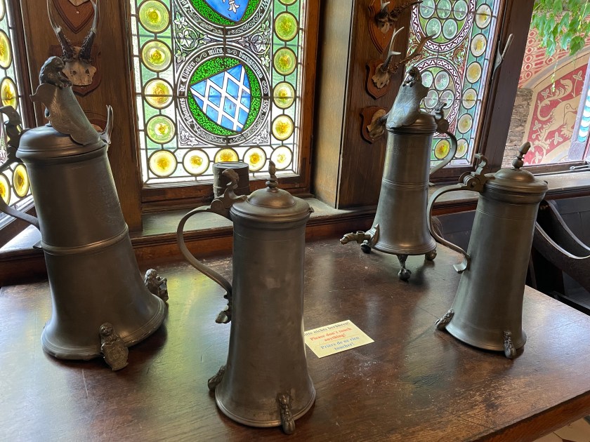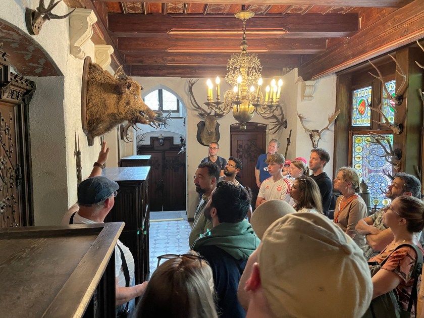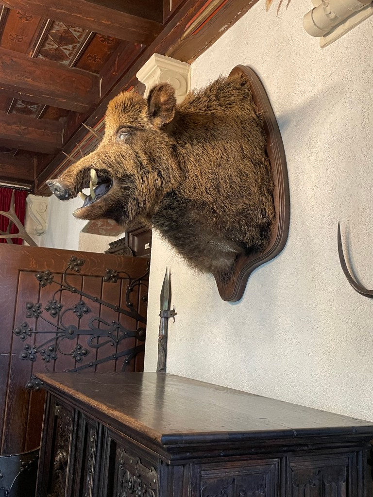 The exterior of the castle was really beautiful. Stone work, vines and flowers, attention to detail. Magical. Really amazing. Reminded us a bit of Berg Eltz. The rooms inside were small and intimate, some felt like a hunting lodge, with stuffed animals mounted on the walls, including the head of a huge boar. There were suits of armor and some hunting weapons.