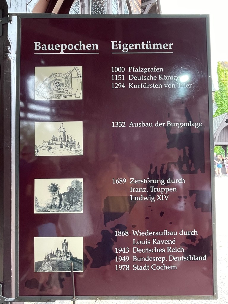 Once at the top, we waited for the next tour to begin. I Really Loved this castle, called Reichsburg. It’s ancient, originally built in the 11th century, later destroyed in the 17th century. In 1689, during the Nine Years’ War, the castle was besieged, taken and blown up by French troops.. The current castle seen today is a reconstruction from the 19th century. A rich merchant bought it in 1866 for 300 Marks and spent 2 years and millions restoring it to its original glory. He died 2 years later. That made me sad. He didn’t have long to enjoy it.