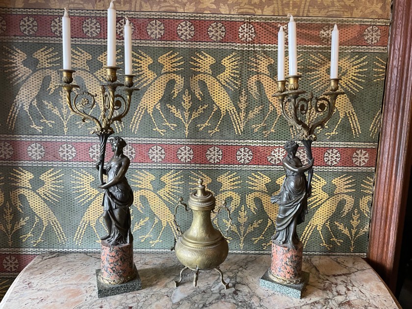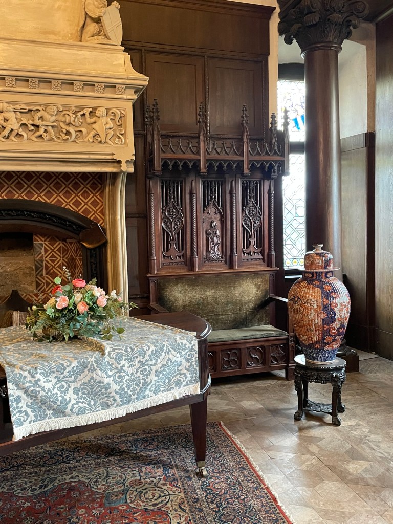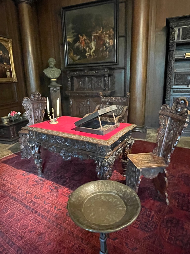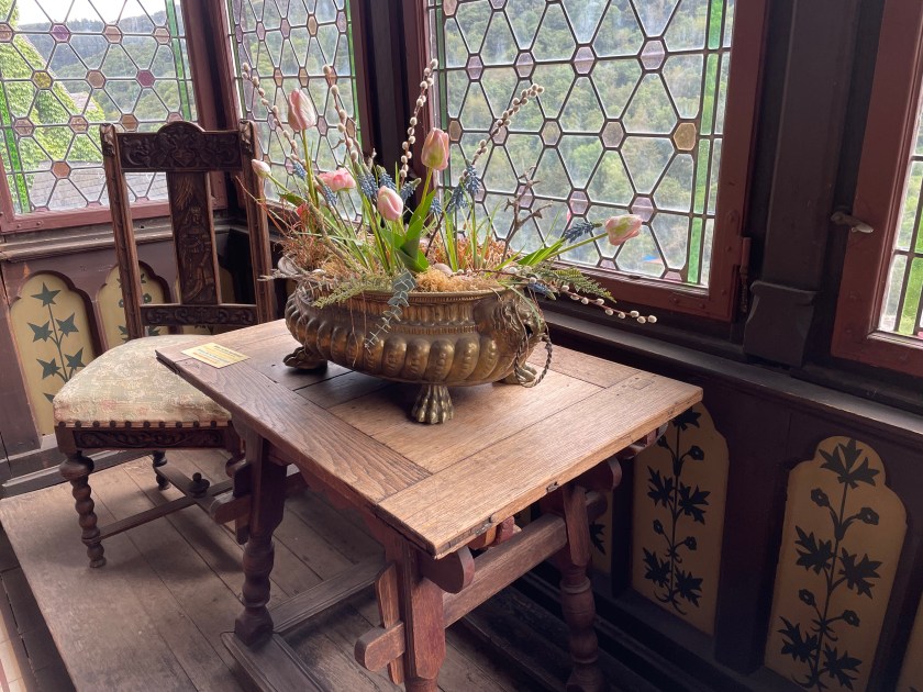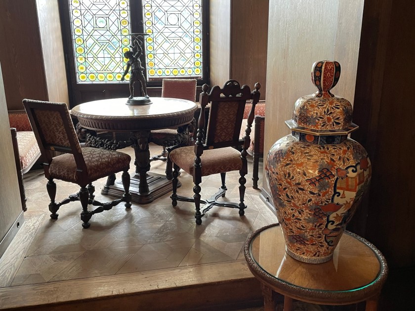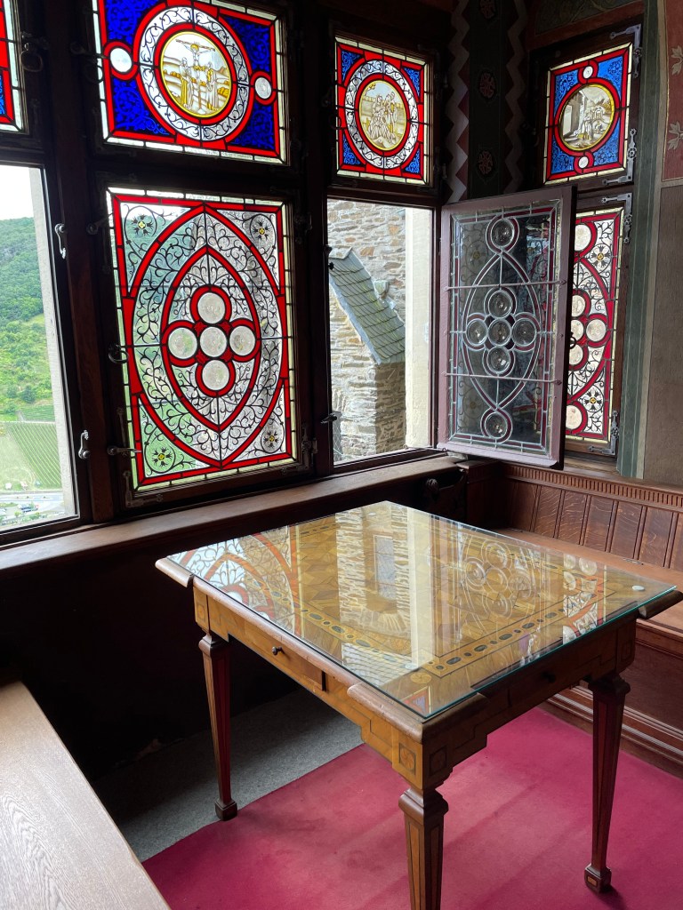 We walked through sitting rooms and a dining room and a music room where Handel’s Water Musik was playing. The details were beautiful. In one room, there was a writing table and chair in a small alcove with beautiful glasswork windows looking out over the mountain and vineyards below. That particular place made my heart beat, and I felt drawn to it, as if I had been there before.