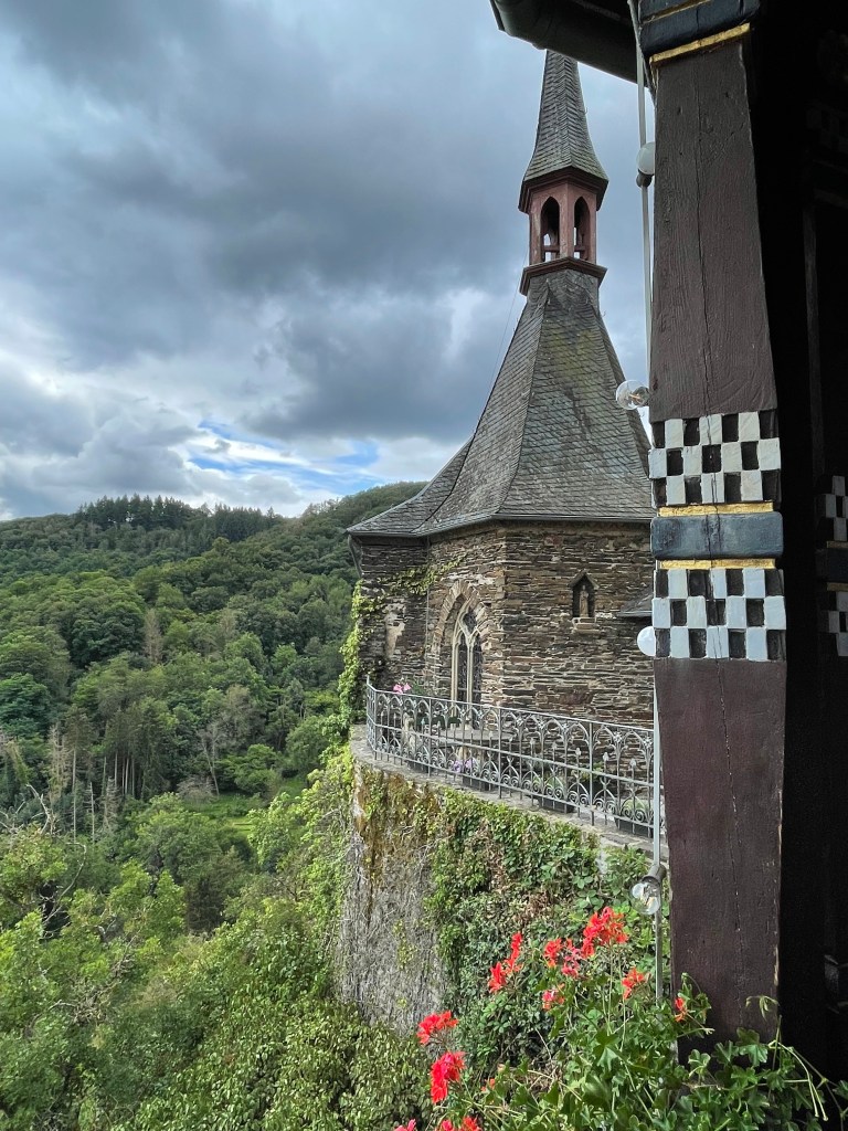 Cochem is located on the Moselle River (die Mosel in German), which is also one of the town’s many charms. Home to only about 5,200 residents (as of 2021), the small town punches above it weight with half-timbered houses, a riverside promenade, in-town vineyards, a scenic market square, charming restaurants and inns, and of course Cochem Castle.