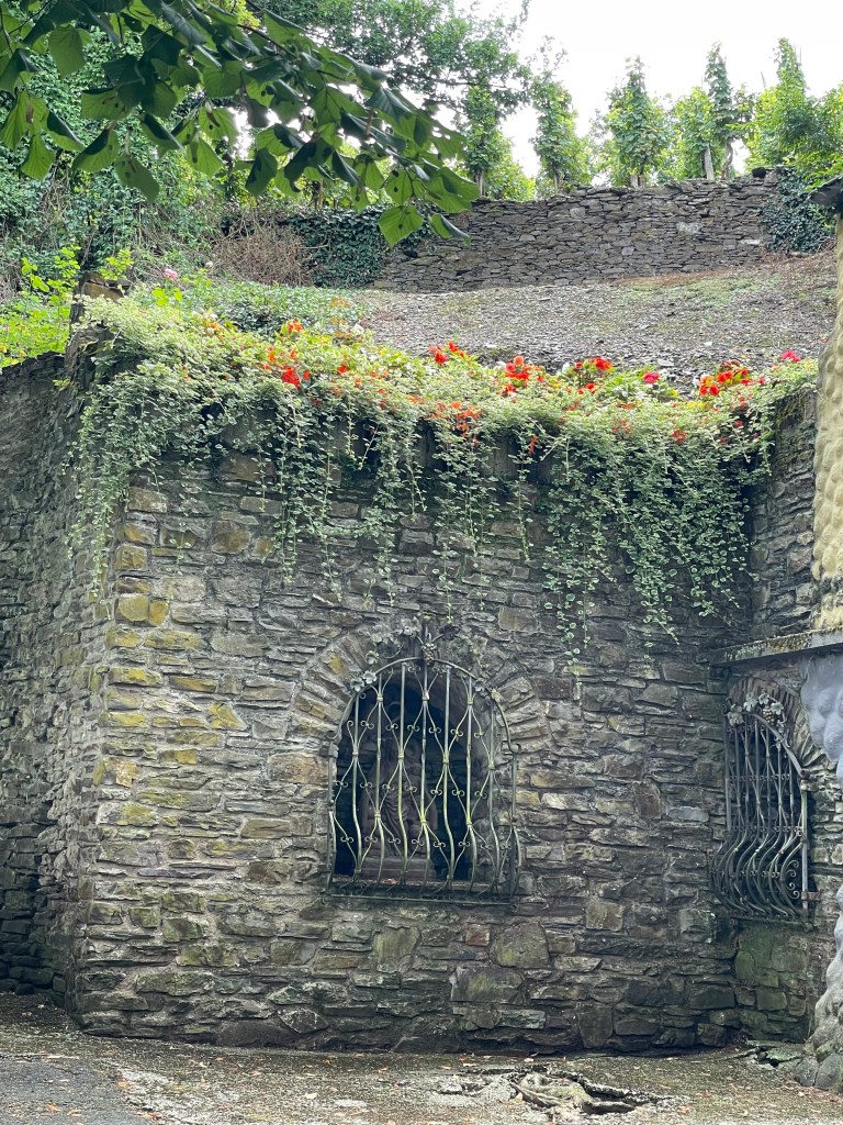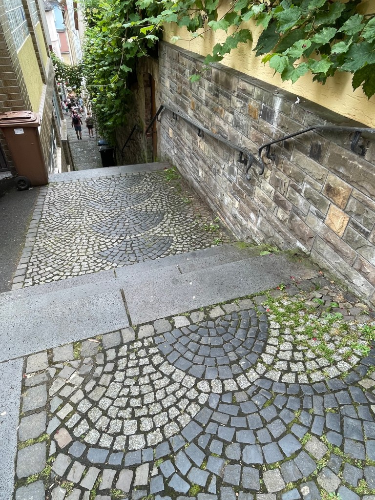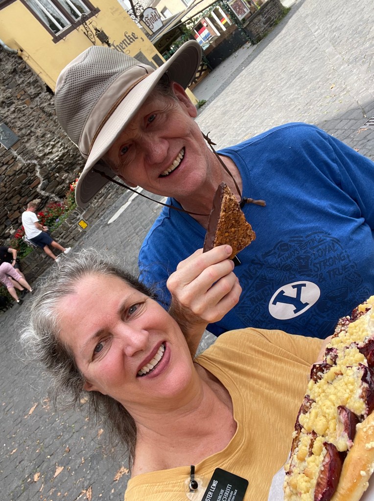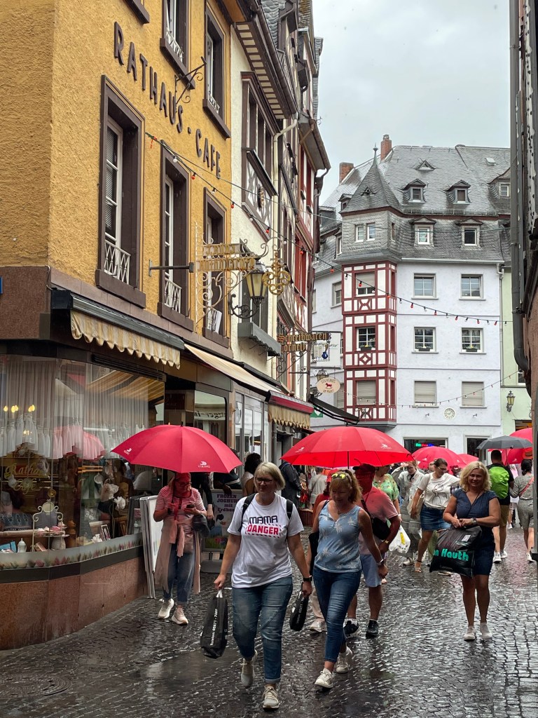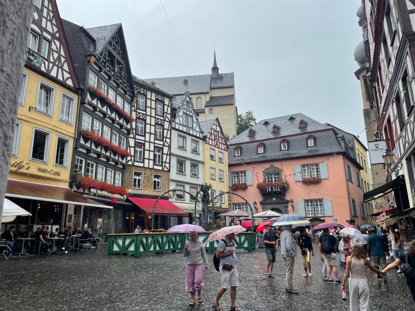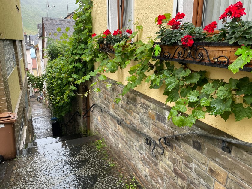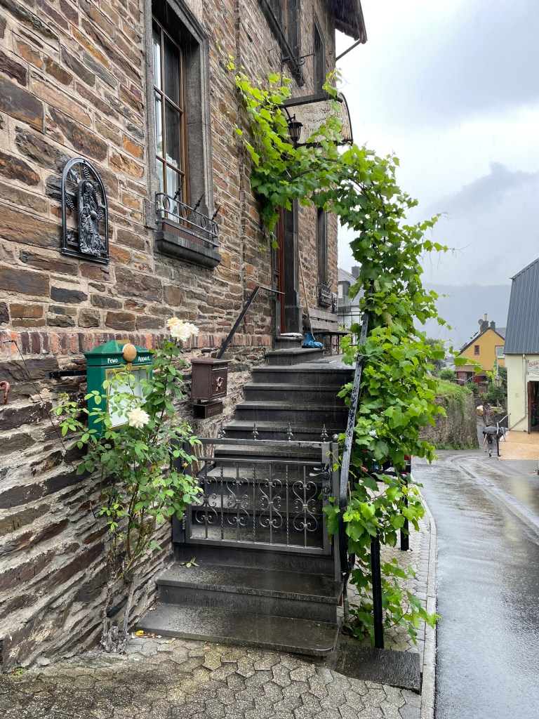 After enjoying the castle grounds, it was time to come down off the mount. We had beautiful views of the Mossel River, both directions and we could see a rain storm blowing in along the river valley. After about 5 minutes, it reached our mountain top and started to rain. We started down the mountain side, without jackets or umbrellas. We were pretty drenched by the time we got to the bottom, even after stopping a couple of times along the way under a tree or door arch. There were a few homes along the climb, but mostly vineyards. Wine country. It was beautiful. Others were still going up and coming down too.