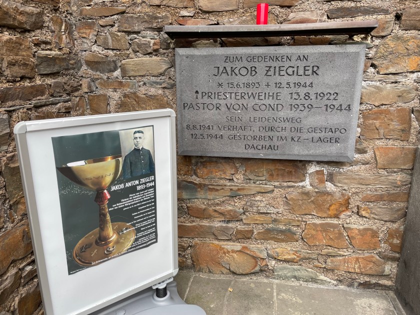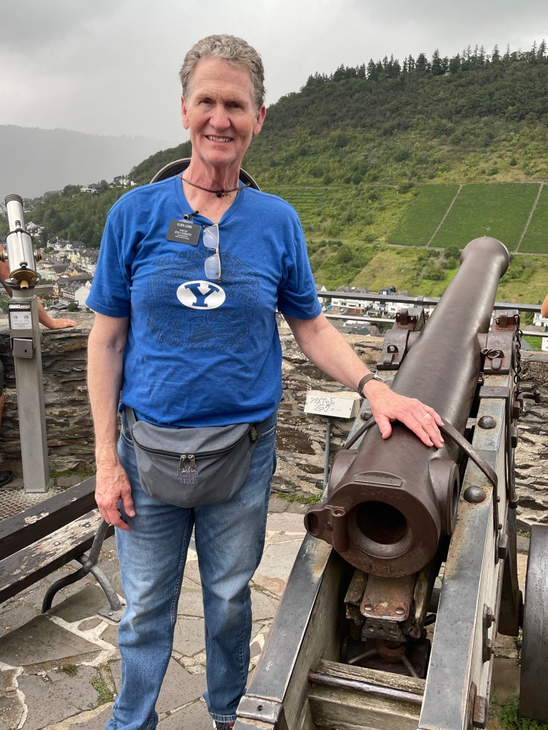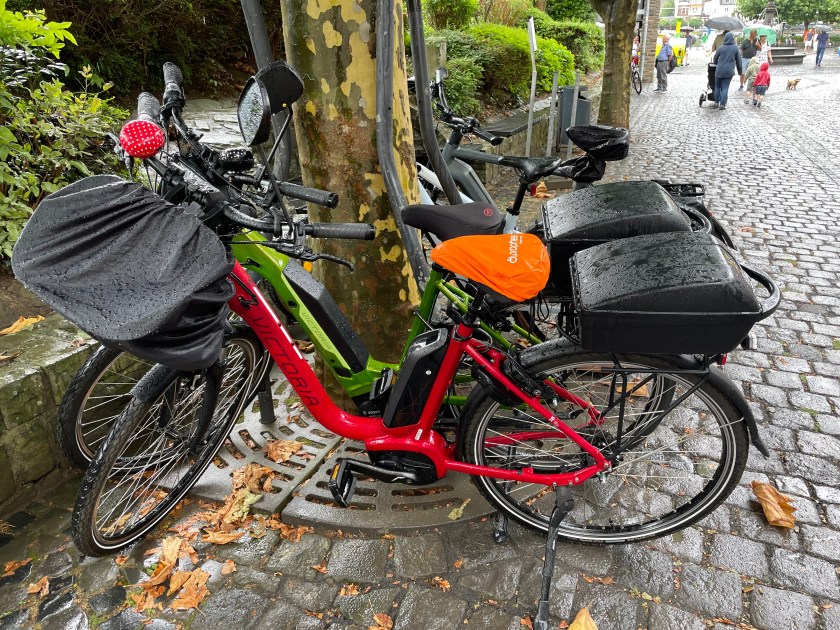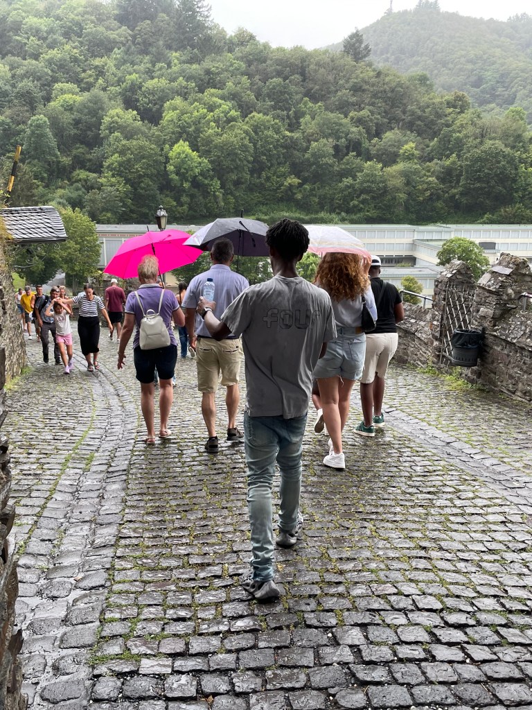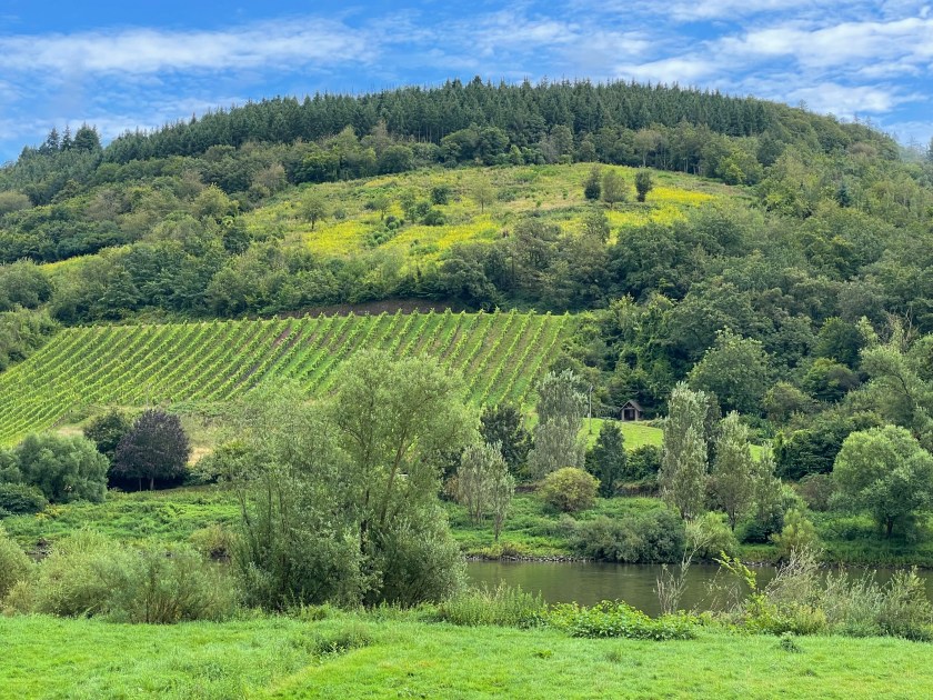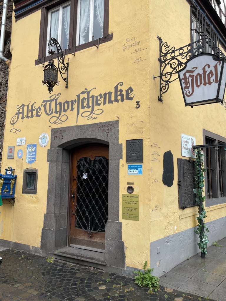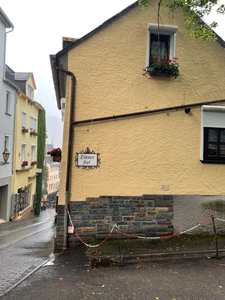 After enjoying the castle grounds, it was time to come down off the mount. We had beautiful views of the Mossel River, both directions and we could see a rain storm blowing in along the river valley. After about 5 minutes, it reached our mountain top and started to rain. We started down the mountain side, without jackets or umbrellas. We were pretty drenched by the time we got to the bottom, even after stopping a couple of times along the way under a tree or door arch. There were a few homes along the climb, but mostly vineyards. Wine country. It was beautiful. Others were still going up and coming down too.