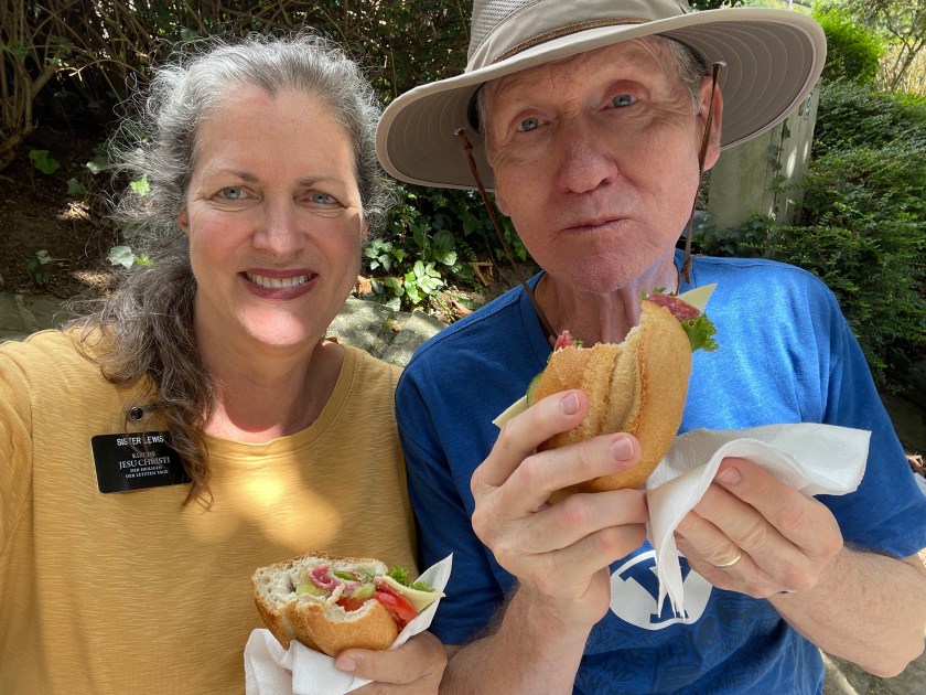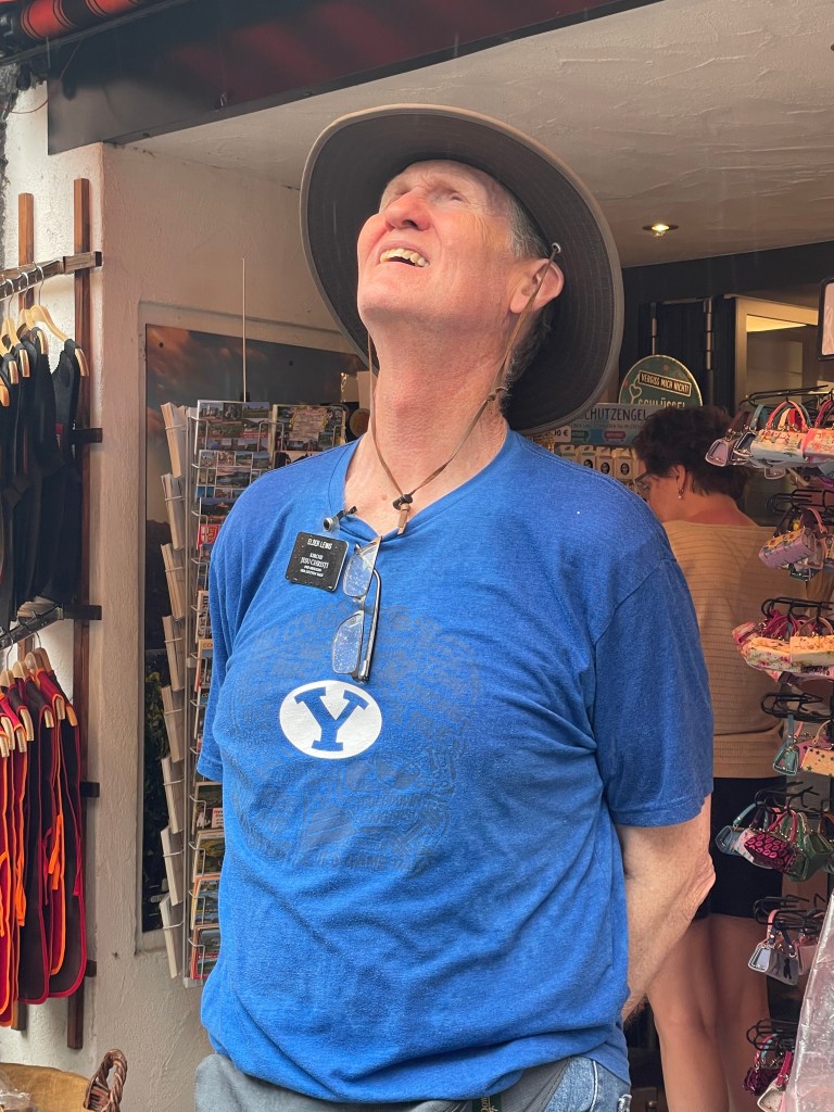 The path led us right into town and the fun streets, where people were taking cover and shop displays and clothing were pulled inside or under awnings. We were totally wet, so we wandered some more. It wasn’t cold–still in the mid-70s.