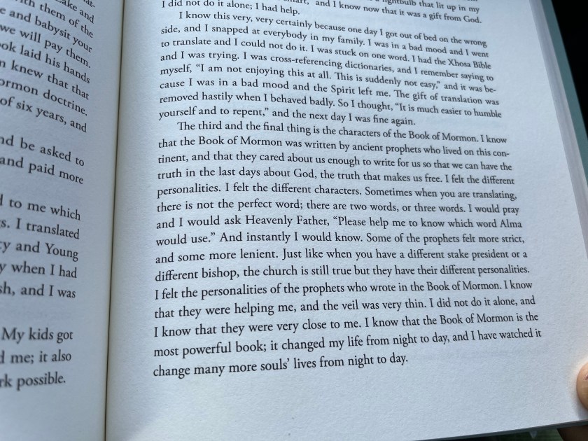 The second thing that happened to me: I was reading the English Book of Mormon and I understood it with a clarity that I cannot even explain to you. It was so clear. It was almost like I was there. I knew exactly what every word meant in English. So it was easy to translate into Xhosa, which does not happen to me now. I understood it with a clarity that I cannot explain, even the portions from Isaiah. I kept saying to myself, “I feel like there is a lightbulb that lit up in my brain. I am not usually this smart,” and I know now that it was a gift from God. I did not do it alone; I had help.