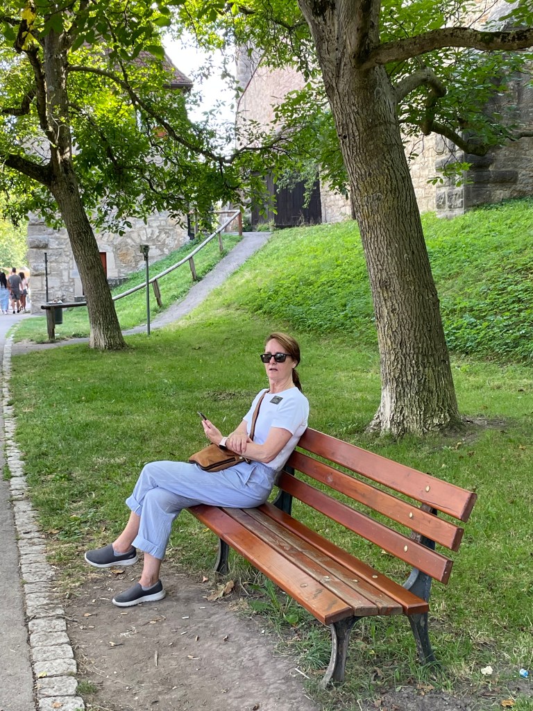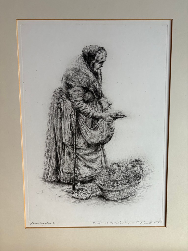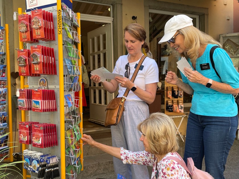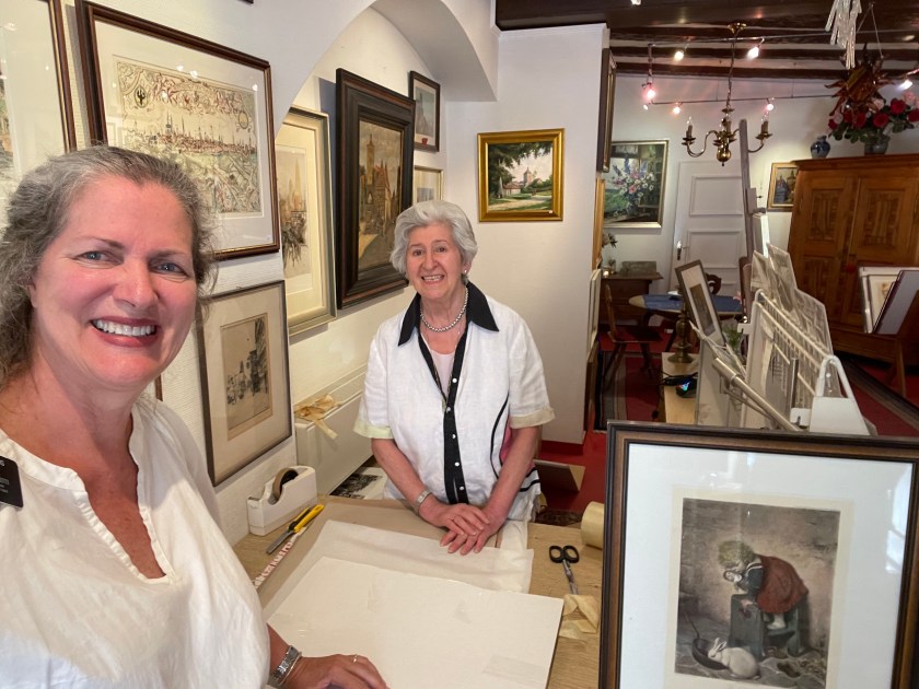We found a little shop with a delightful German shopkeeper. She was in her 70s, and she loved art and art prints. I enjoyed visiting with her while I made a purchase–a sketch of an older German woman with her harvested vegetables. It reminded me of my ancestor mothers.