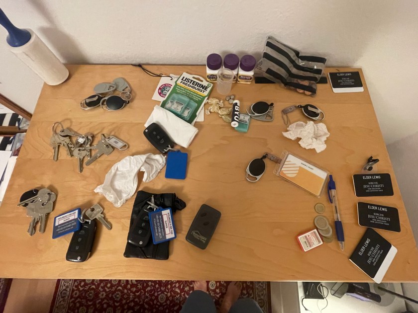 This is what John’s dresser looks like with all the comings and goings. Keys, so many keys. Apartments, cars, garages, mail, office–so many things to get into.