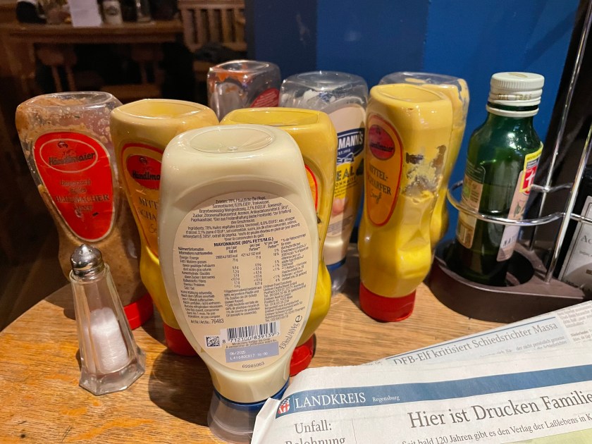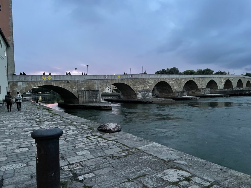 We walked to the old Stone Bridge. With construction beginning in 1135, the Stone Bridge is considered a masterpiece of medieval architecture and is the oldest preserved bridge in Germany. We walked out onto it, just to feel the strength and staying power. For 800 years, until the 1930s, it was the only bridge crossing the river here.