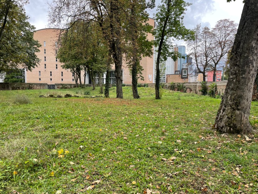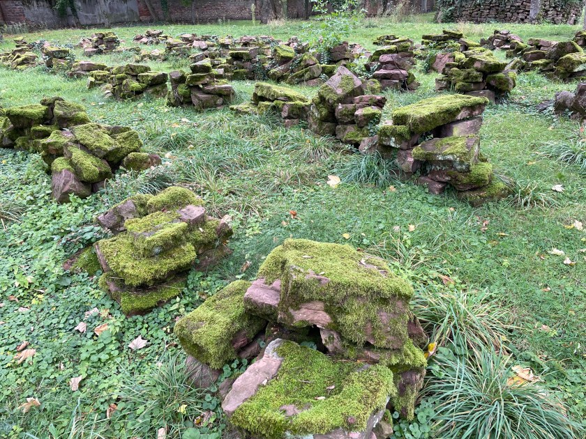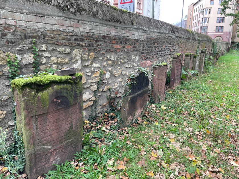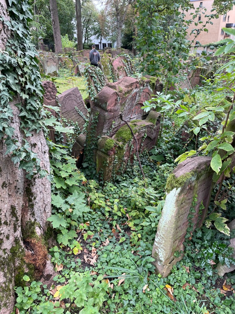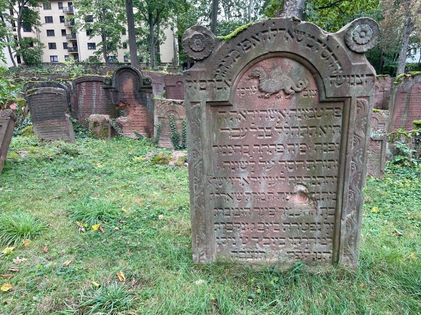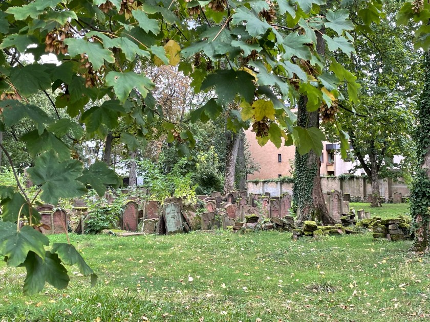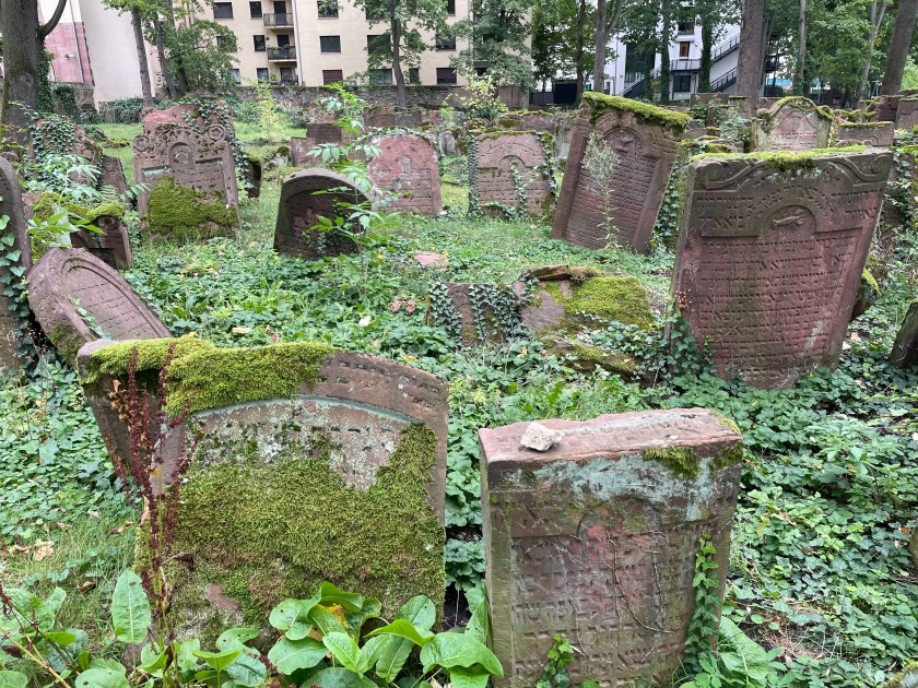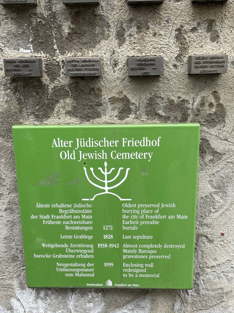The sign said this is the oldest preserved Jewish burying place of the city of Frankfurt, and the earliest provable burials. The oldest stone is for Hanna bat Alexander, died in 1272 and the last is 1828.