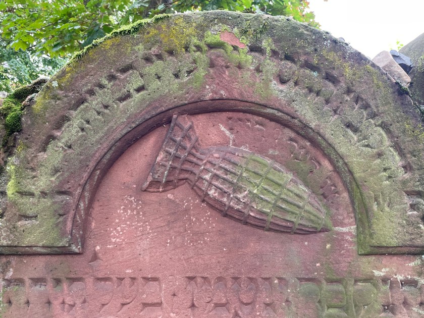 Many of the gravestones in the cemetery bear images such as a rabbit, a windmill, or a fish trap. The houses in the Judengasse didn’t have house numbers. The marks on the gravestones show in which house on the Judengasse the deceased lived.