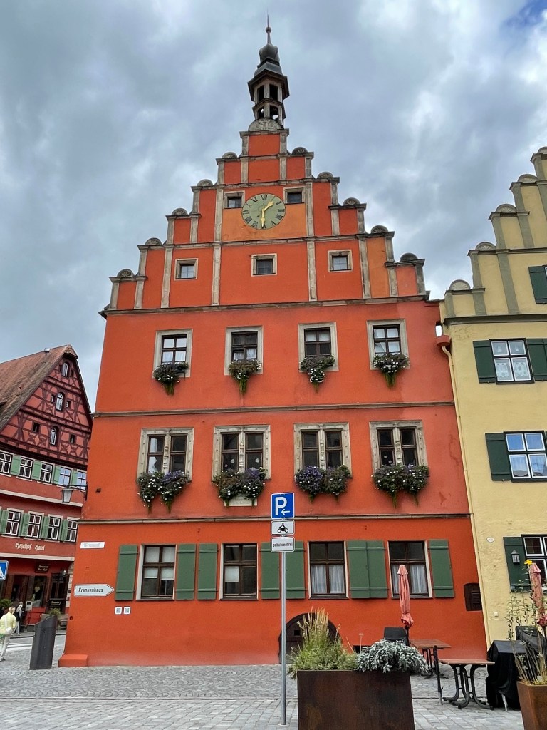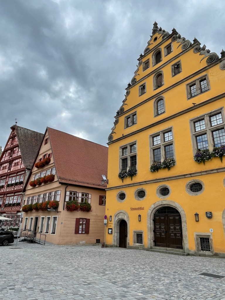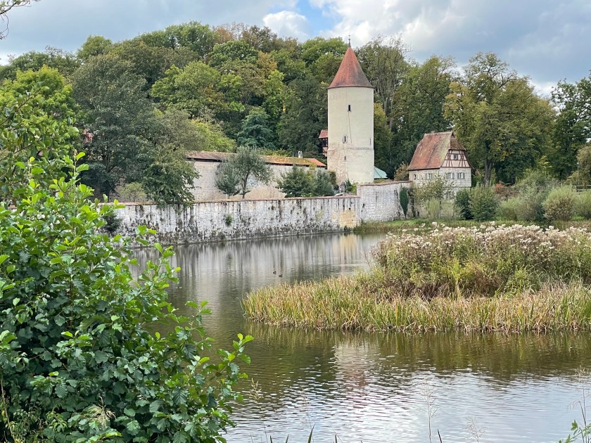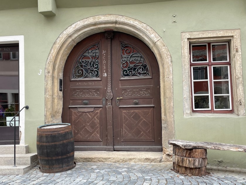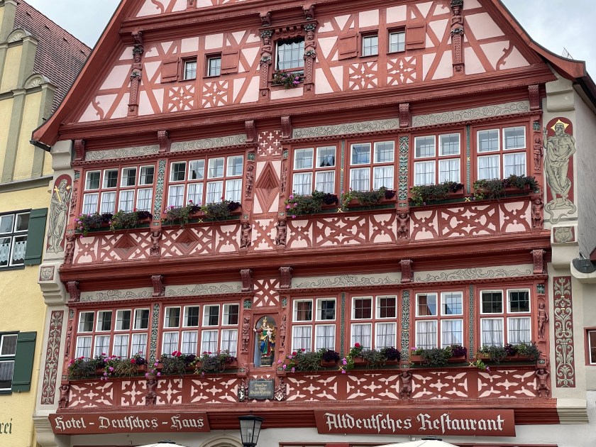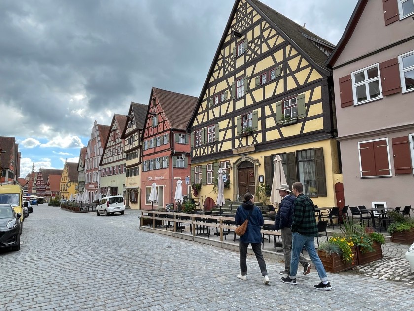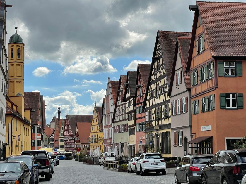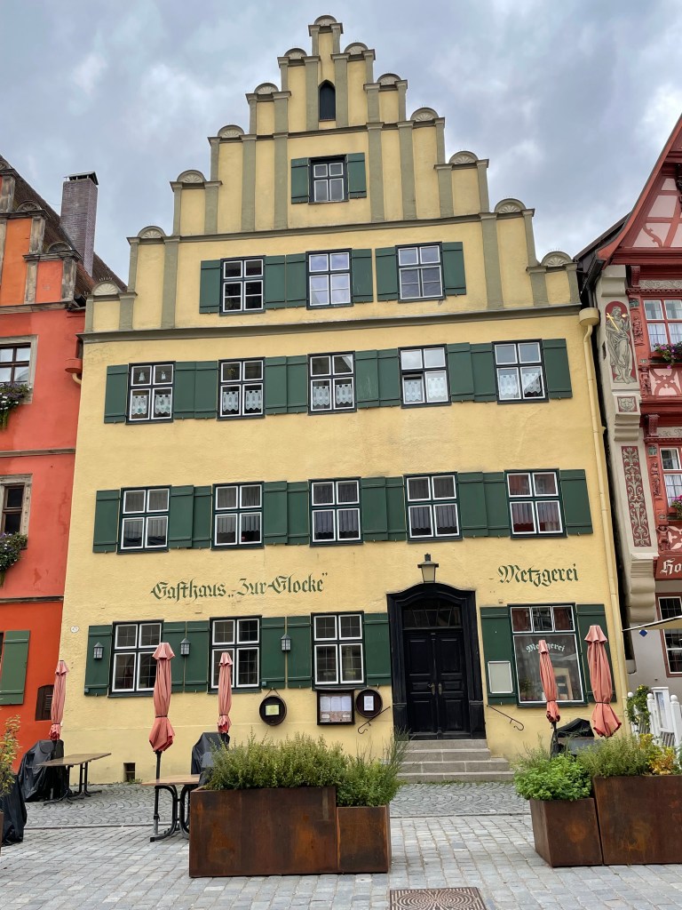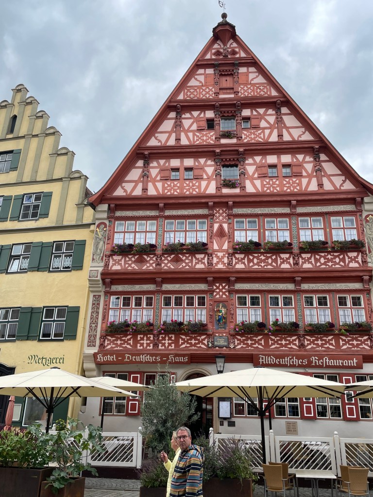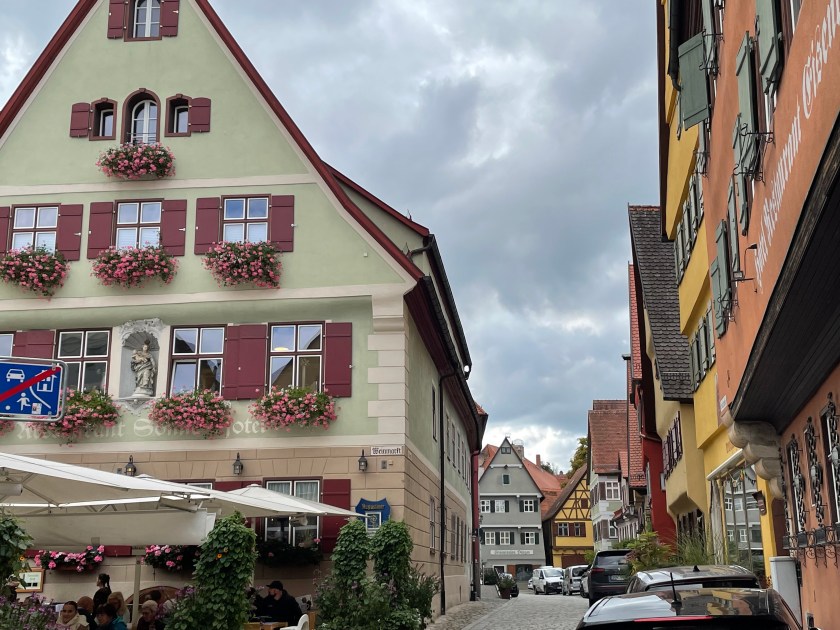 Dinkelsbühl is one of the most enchanting towns I’ve ever seen. It was like a fairytale, with every house and every building perfectly restored and colorful, with half-timber homes and businesses of every color and design. It was amazing. We really loved it all. There was a bakery stop for Aaron and an ice cream stop for John. We found a tourist info place for Abbey with a bathroom and we got a map and suggestions of where to walk to see the best parts of the old town. We went into the old churches and enjoyed the Fraktur word descriptions or names on each establishment. We walked along the old city wall. There was a creek/river and old towers and old trees and quiet cobblestone walkways. It really was absolutely enchanting.