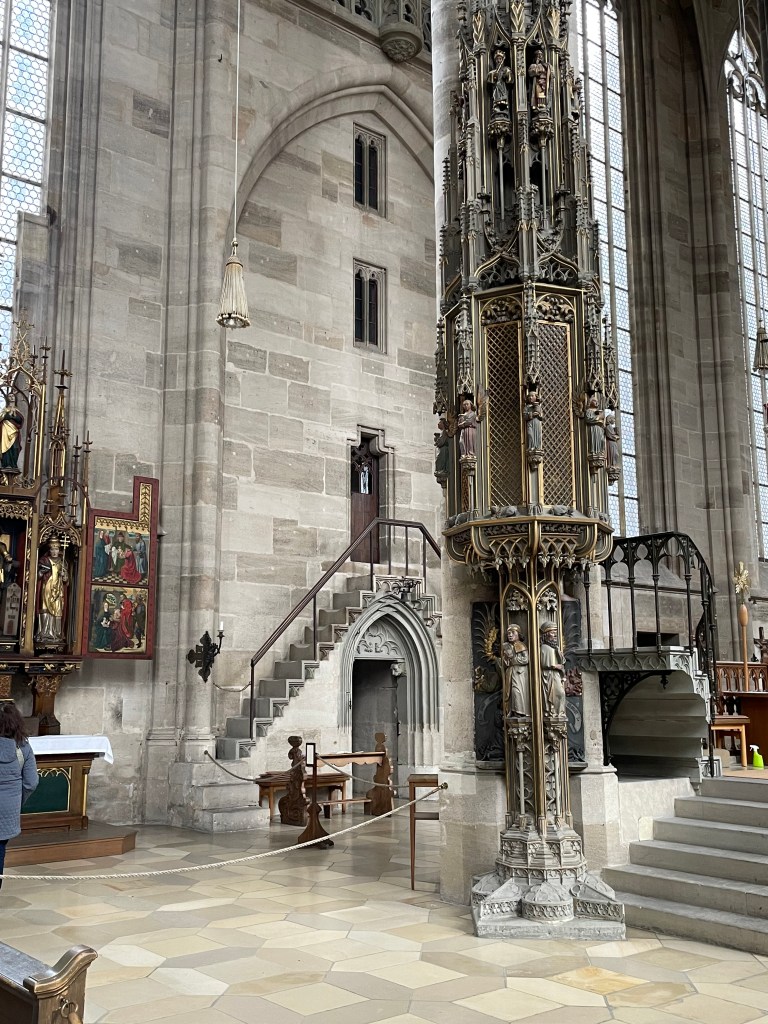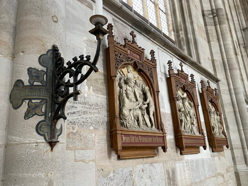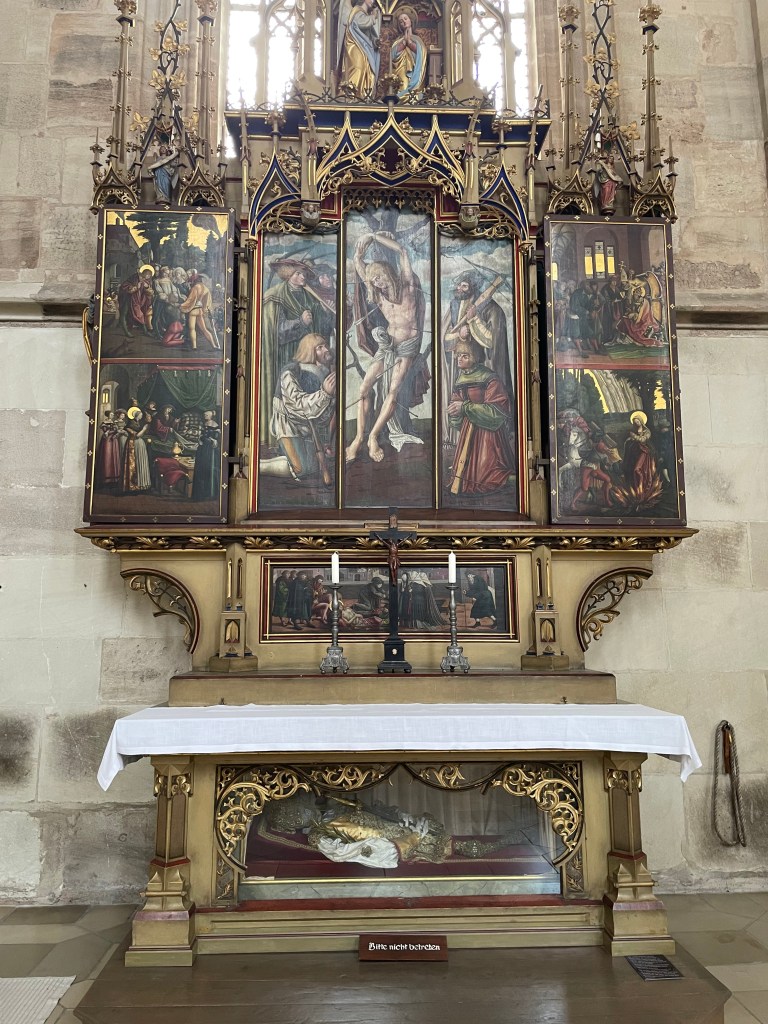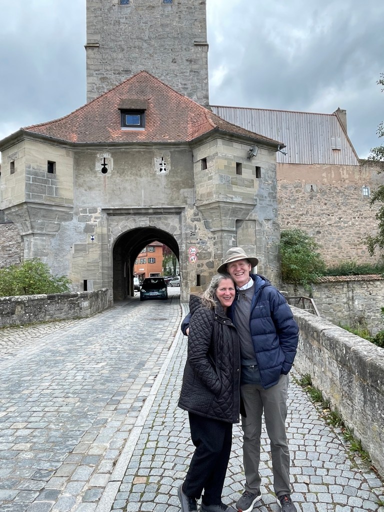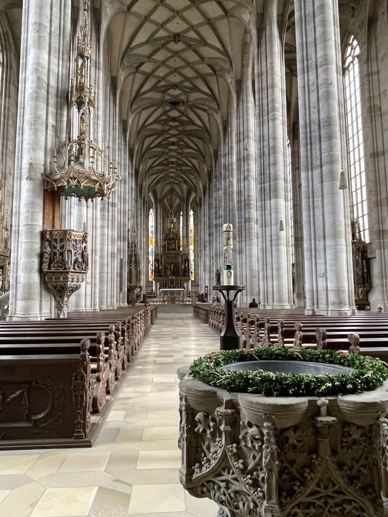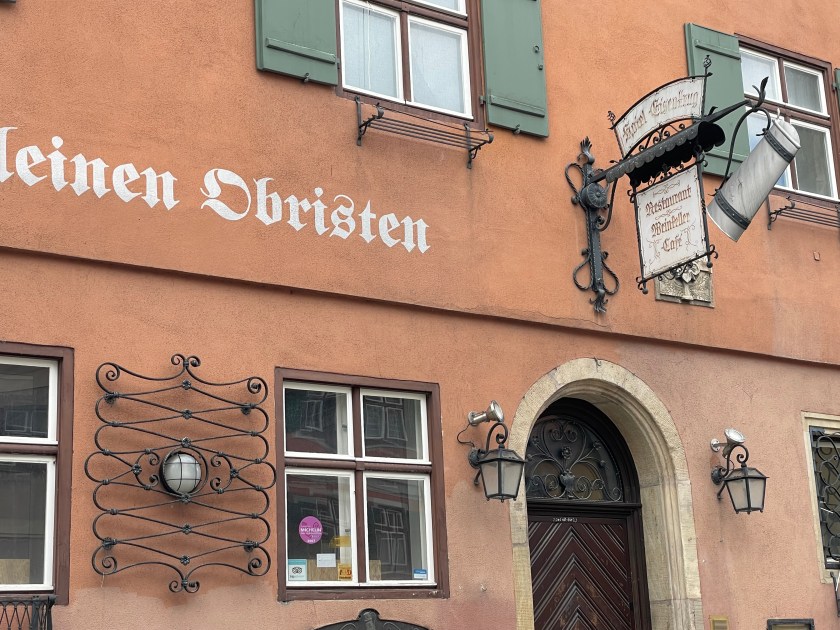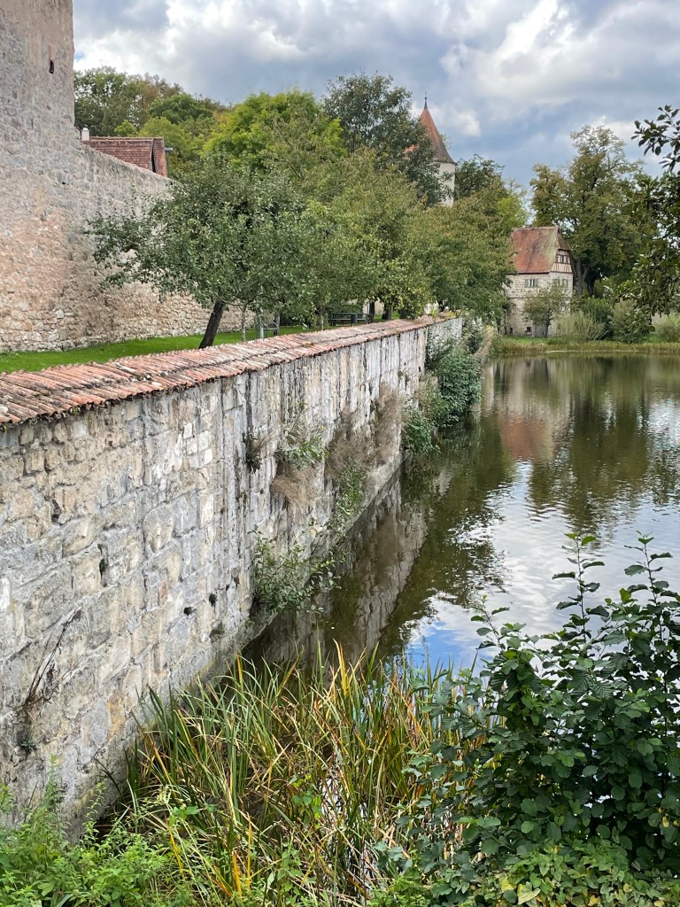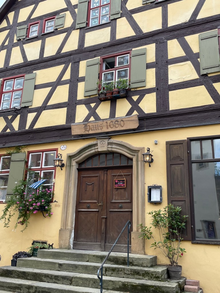 Dinkelsbühl is one of the most enchanting towns I’ve ever seen. It was like a fairytale, with every house and every building perfectly restored and colorful, with half-timber homes and businesses of every color and design. It was amazing. We really loved it all. There was a bakery stop for Aaron and an ice cream stop for John. We found a tourist info place for Abbey with a bathroom and we got a map and suggestions of where to walk to see the best parts of the old town. We went into the old churches and enjoyed the Fraktur word descriptions or names on each establishment. We walked along the old city wall. There was a creek/river and old towers and old trees and quiet cobblestone walkways. It really was absolutely enchanting.