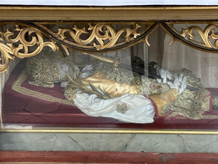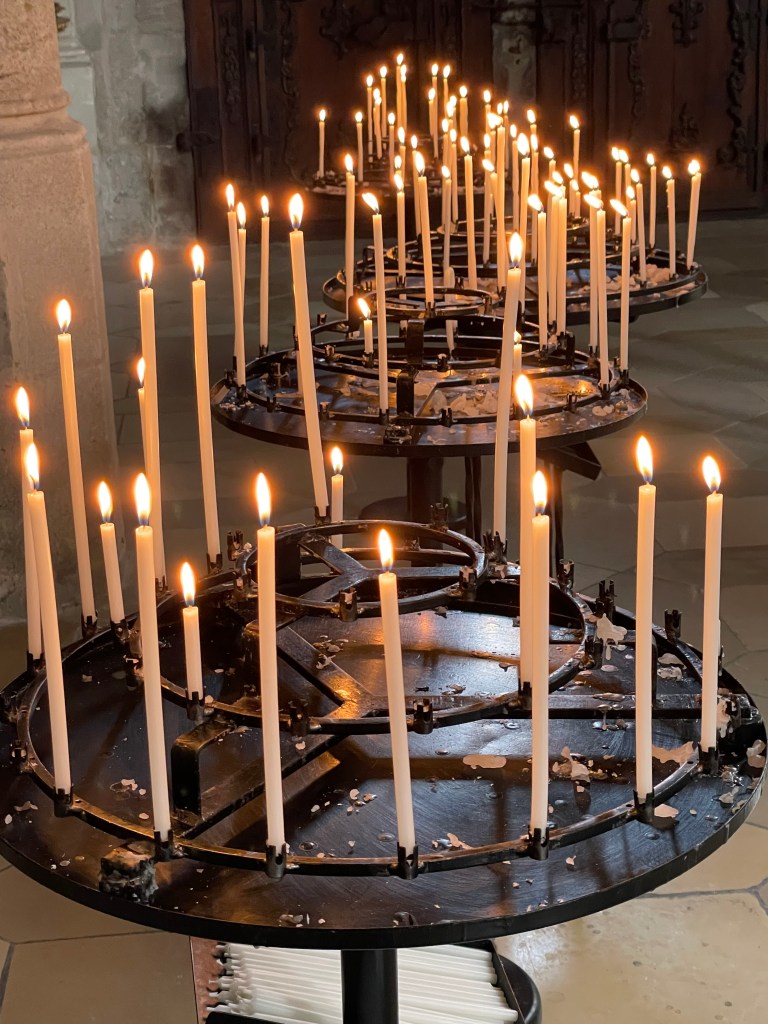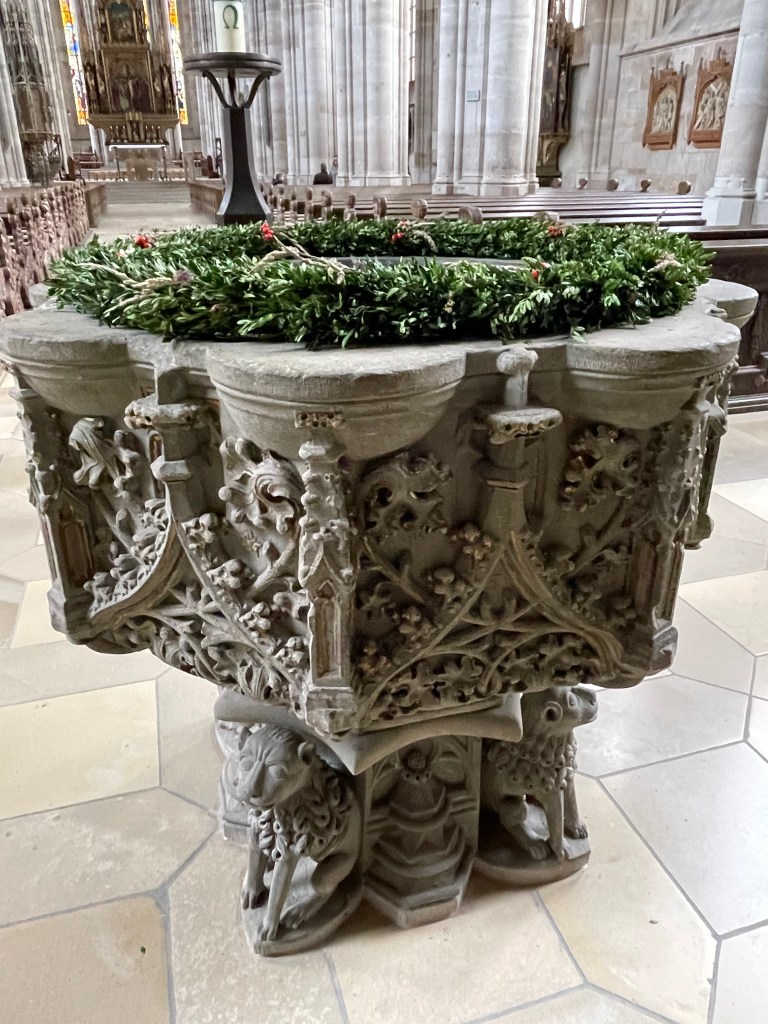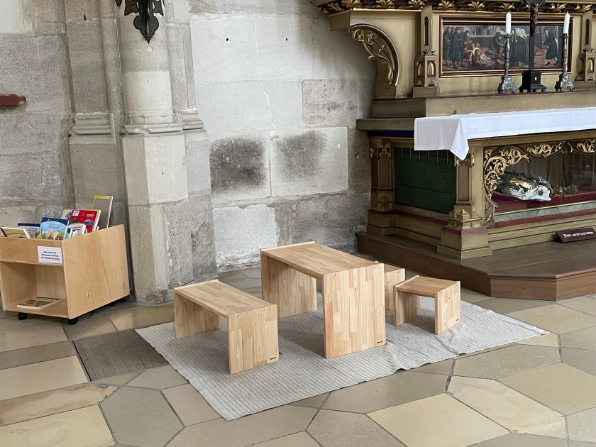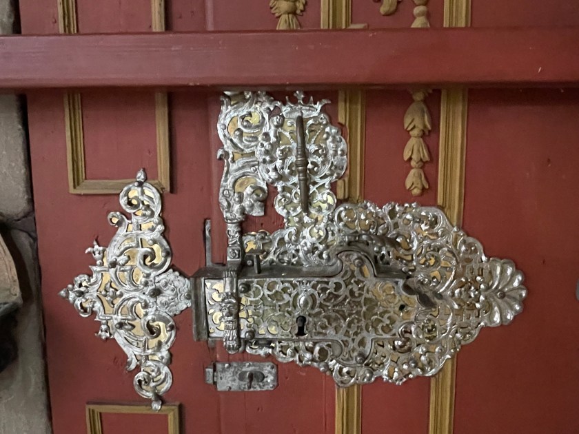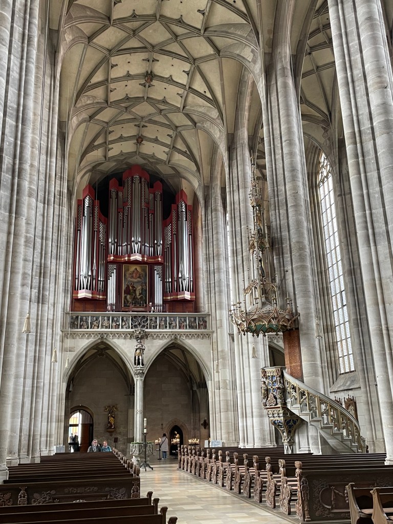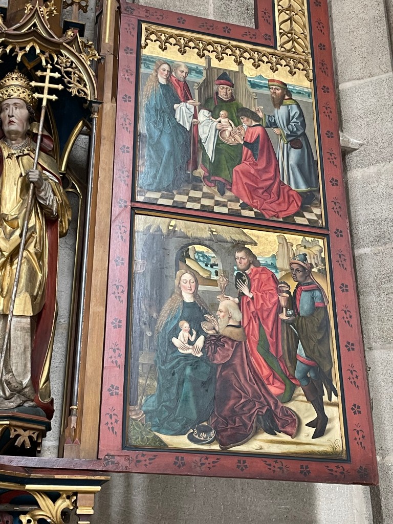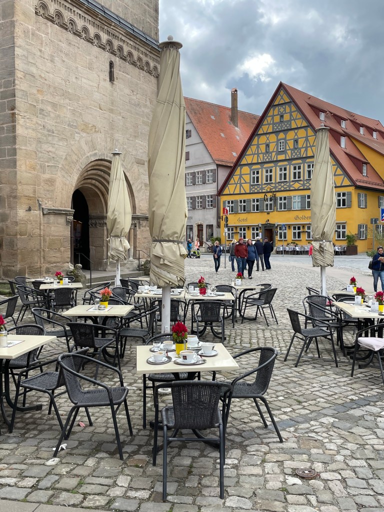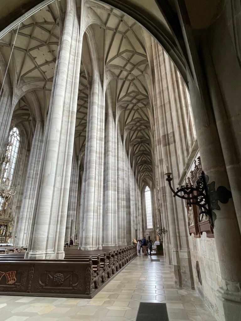 Dinkelsbühl is one of the most enchanting towns I’ve ever seen. It was like a fairytale, with every house and every building perfectly restored and colorful, with half-timber homes and businesses of every color and design. It was amazing. We really loved it all. There was a bakery stop for Aaron and an ice cream stop for John. We found a tourist info place for Abbey with a bathroom and we got a map and suggestions of where to walk to see the best parts of the old town. We went into the old churches and enjoyed the Fraktur word descriptions or names on each establishment. We walked along the old city wall. There was a creek/river and old towers and old trees and quiet cobblestone walkways. It really was absolutely enchanting.