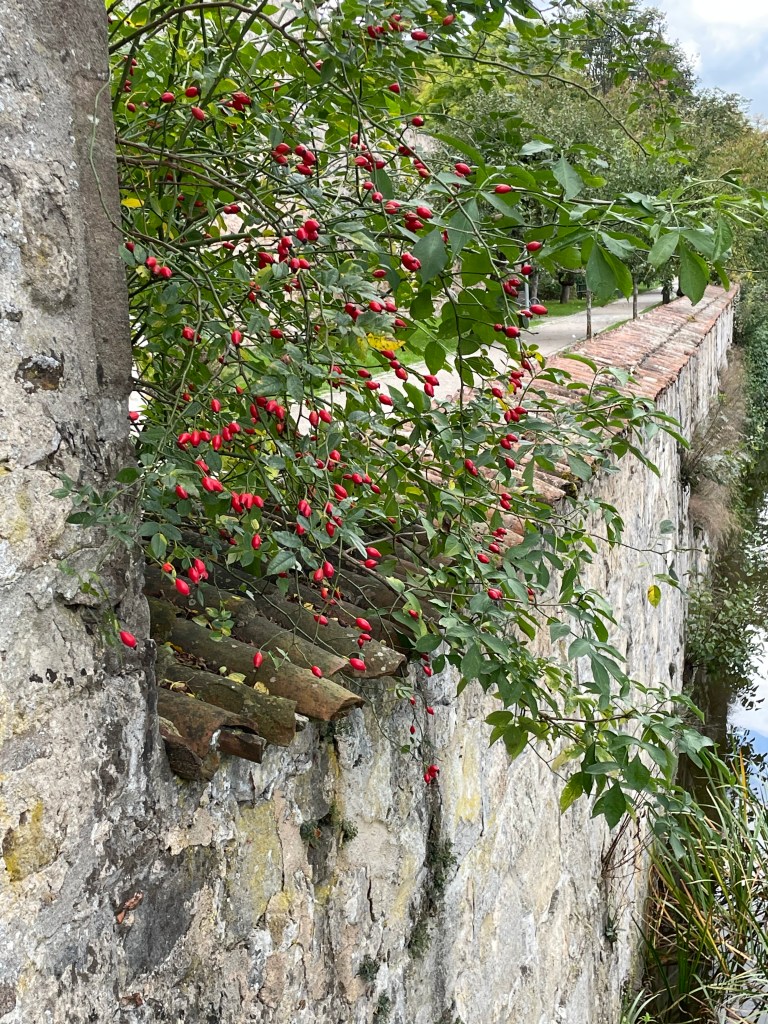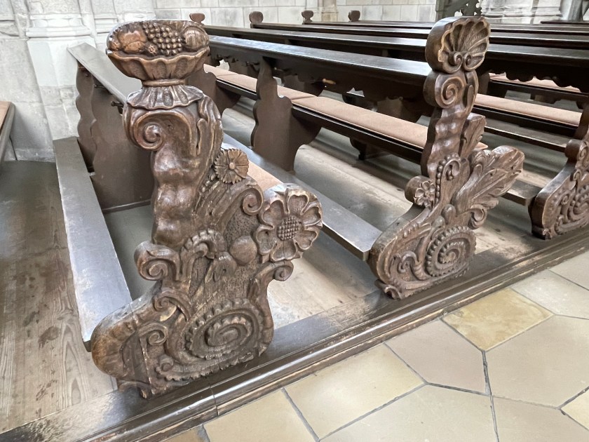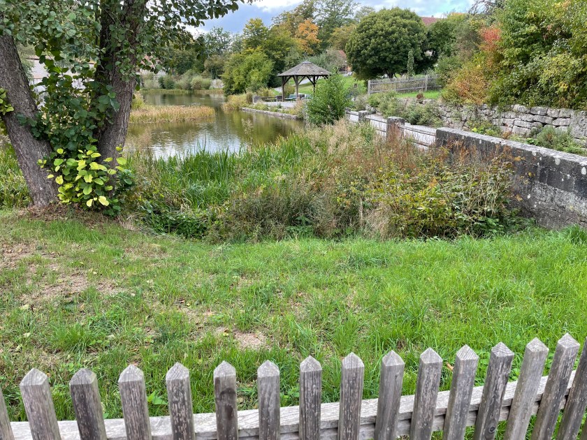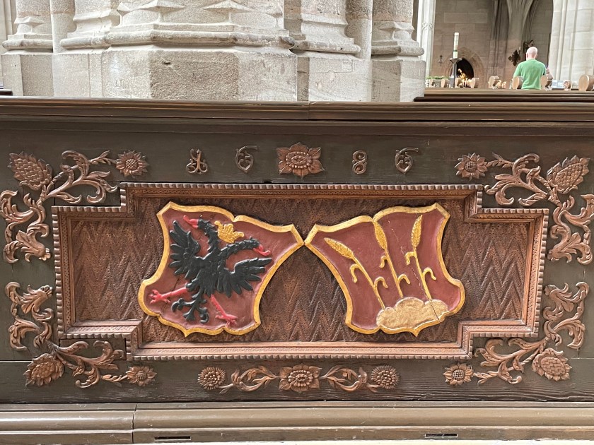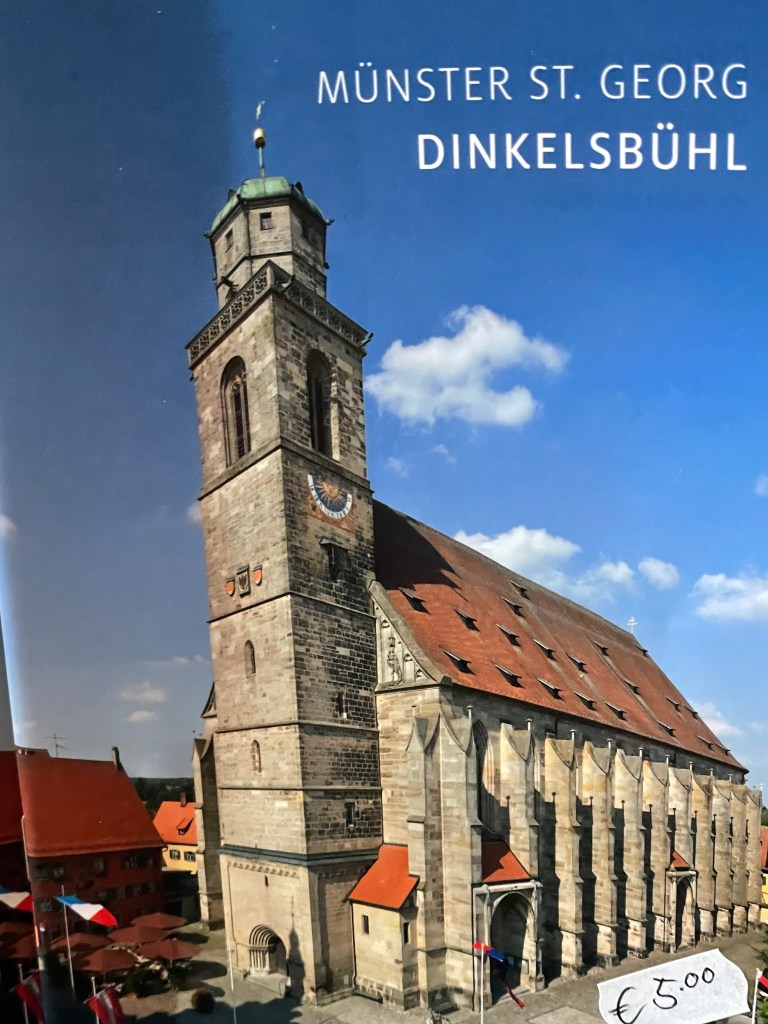 From Rothenburg, we drove about 45 minutes to Dinkelsbühl on the Romantisch Road. The route took us on narrow one-lane farm roads through the rolling countryside filled with tended fields and forests. The maize has been harvested. Saw new crops of rapeseed growing and a couple of spectacular fields of sunflowers–bright golden yellow, facing the sun. Mostly rolling fields, many freshly plowed.