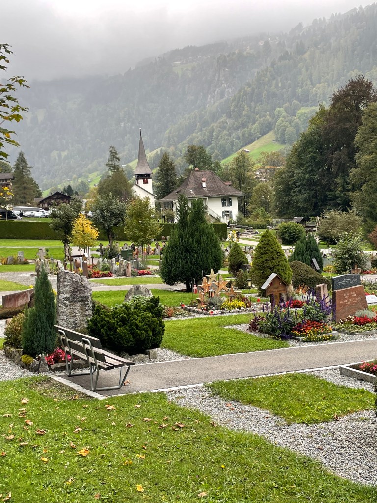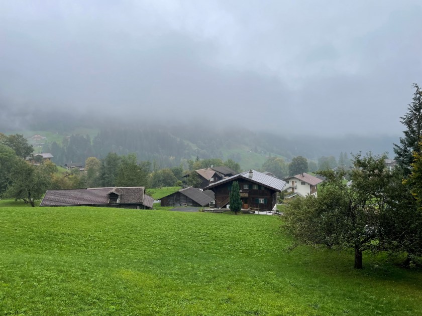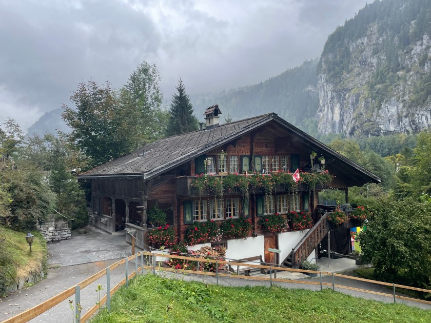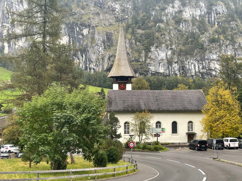 Today we had our most challenging weather day. After our hotel breakfast, we set off for Grindelwald and the cable car ride to Männlichen. It wasn’t raining but it was dark and cloudy. We had a nice drive to Grindelwald, then went into the cable car terminal to see if we could get a report on visibility up on Männlichen mountain. We found crowds of people waiting in line for the trip to Jungfraujoch. There were some mechanical difficulties up on top so everyone was delayed. We were told about the webcams up on the mountains and saw that Männlicen was totally socked in—no visibility of the surrounding mountains. So, we changed plans and after a nice drive the Grindelwald Zentrum, we drove down to Lauterbrunnen.