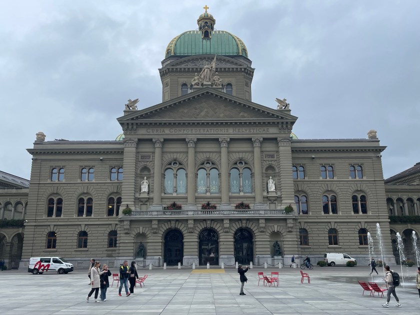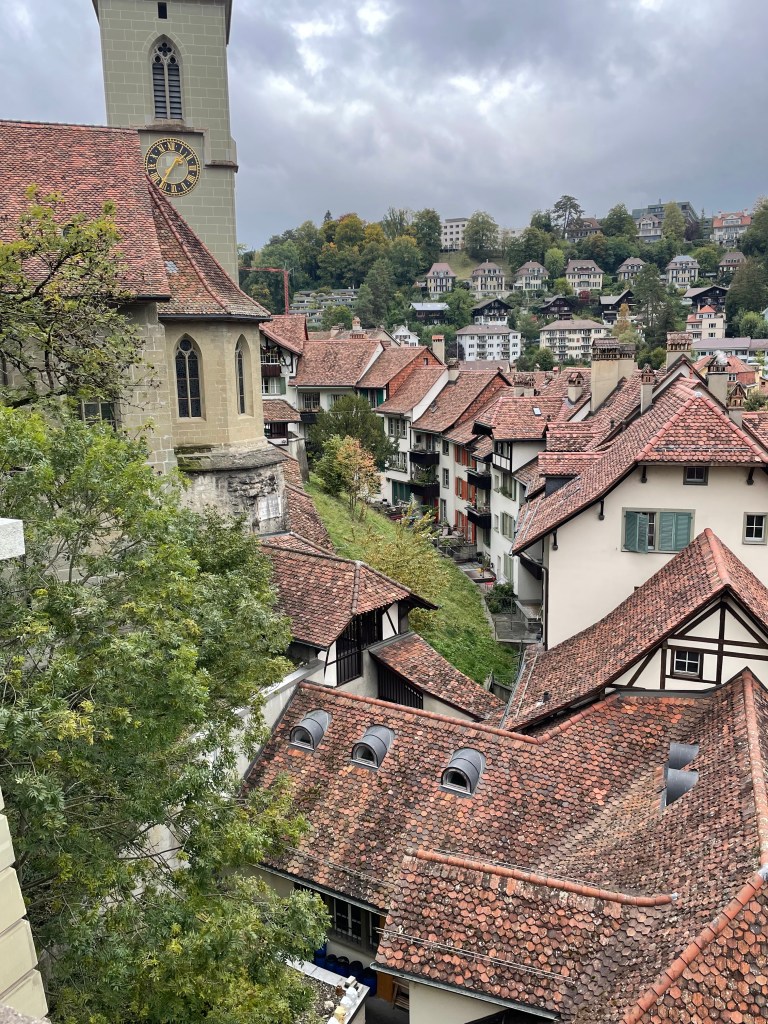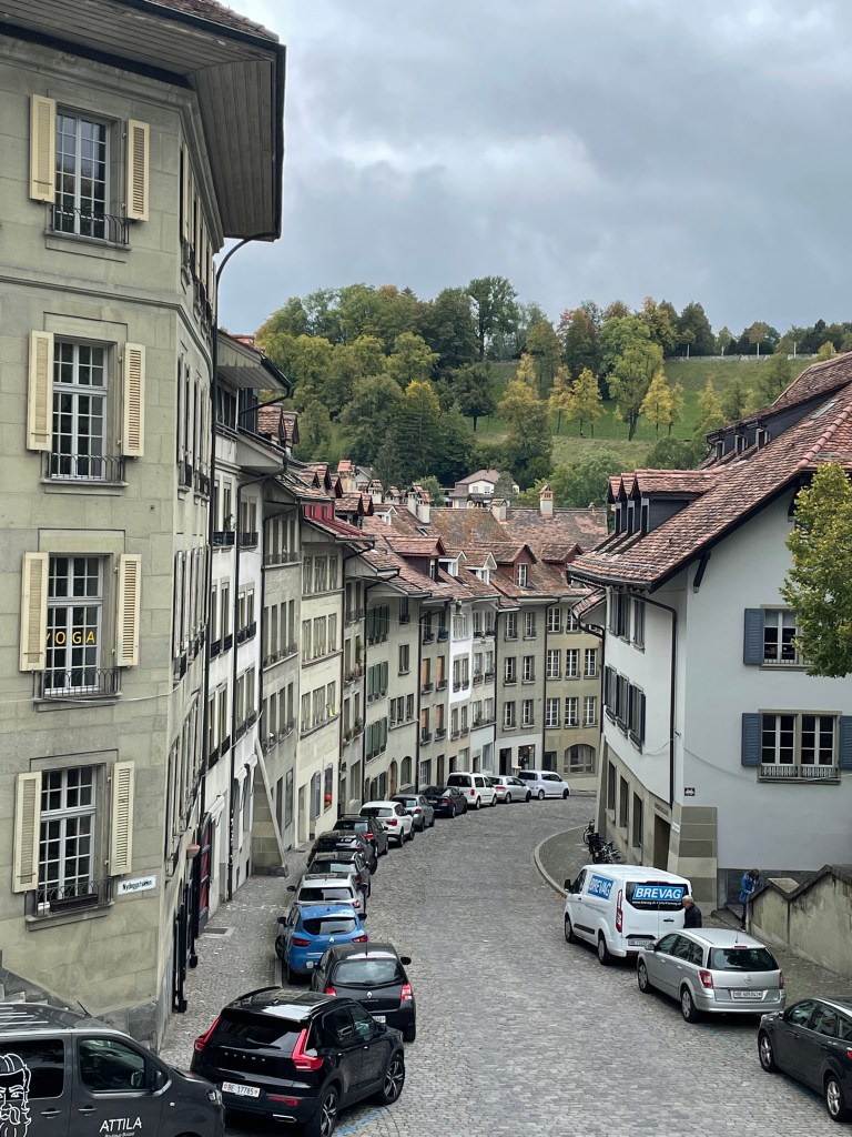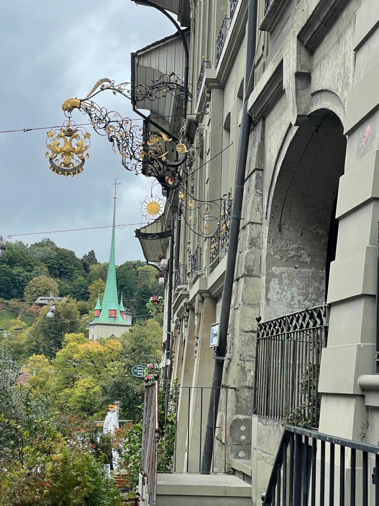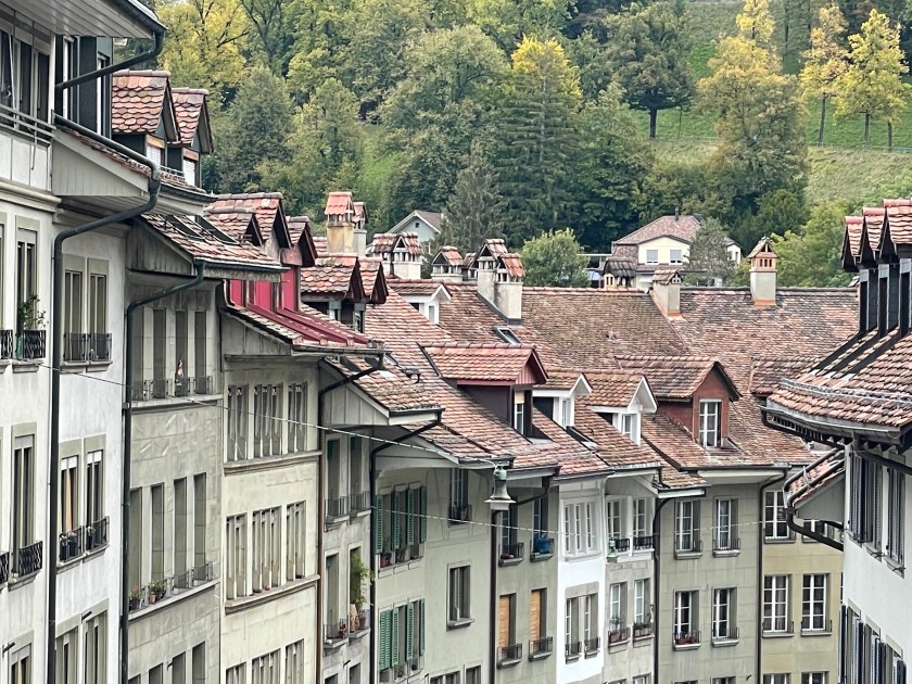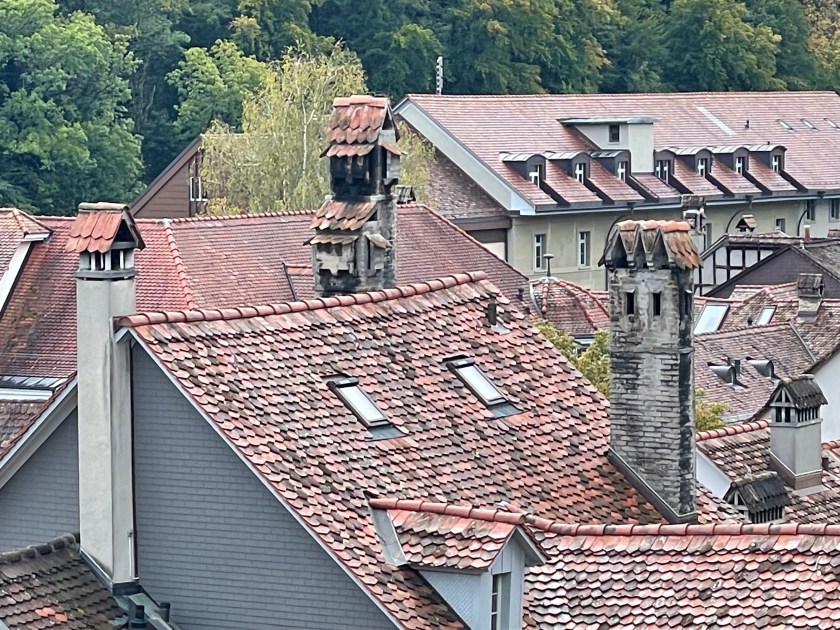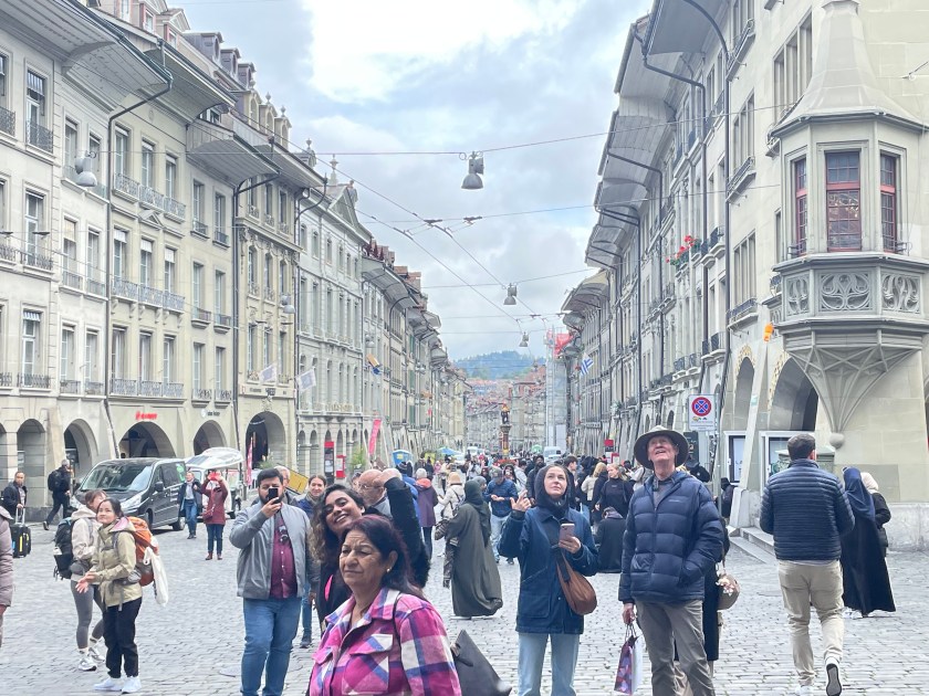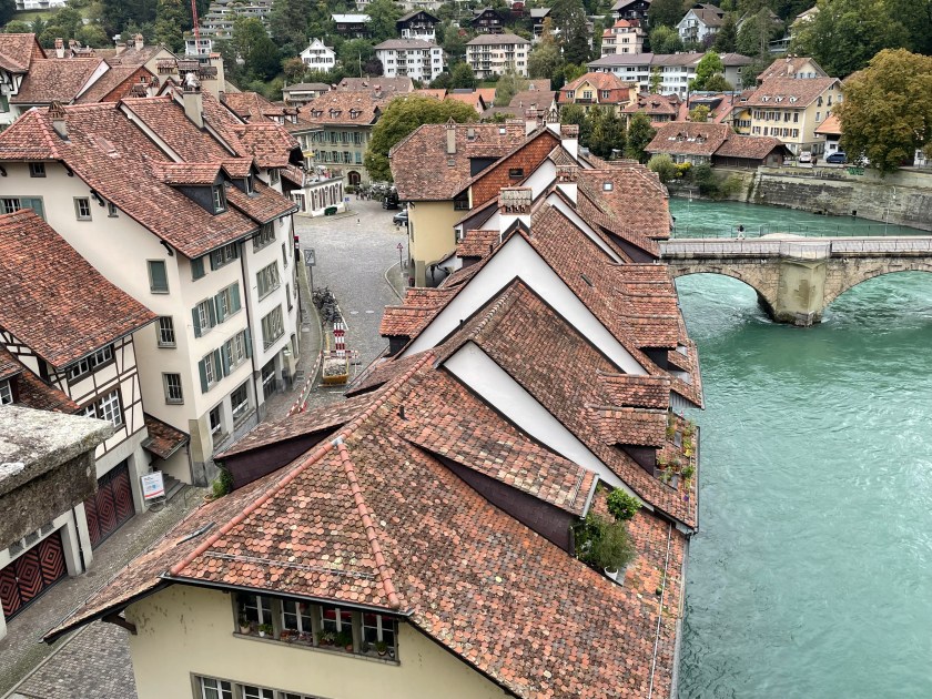 We left our cozy little Interlaken Hotel de la Paix this morning and started our trip to Bern, driving through beautiful countryside. Everything is such a luscious green, still. It looks like it could be spring’s first grass. We had an overcast day with rain off and on. We never got to see the Alps this time. Everything up there was hidden in the clouds. But everything down below is also spectacular.