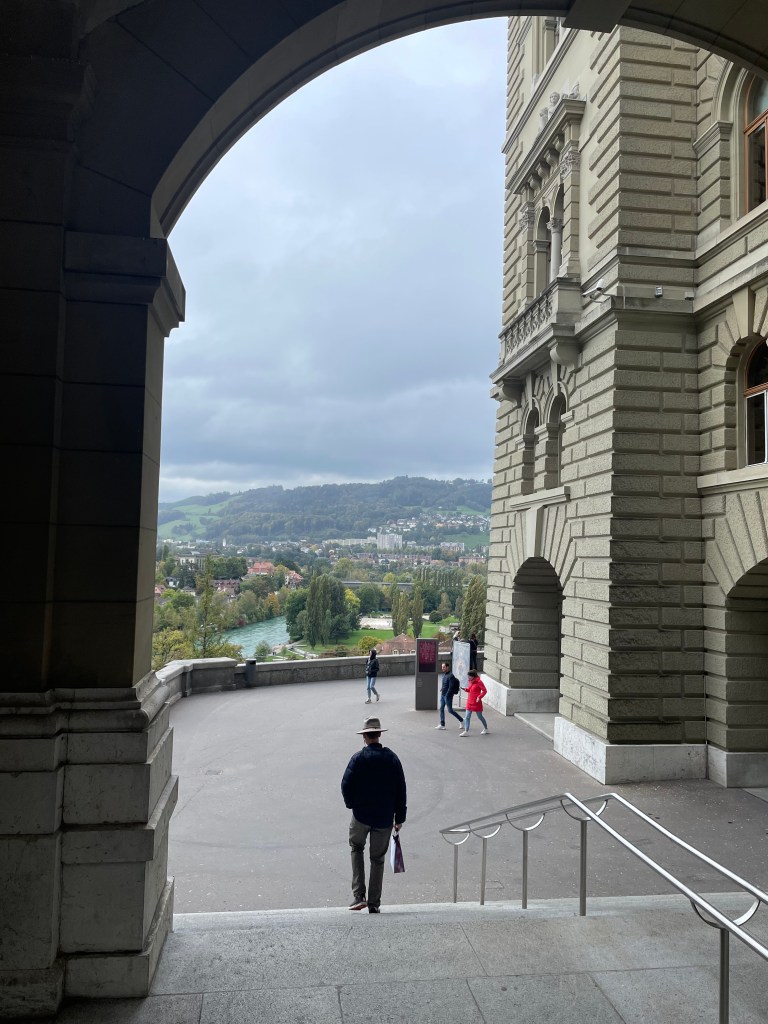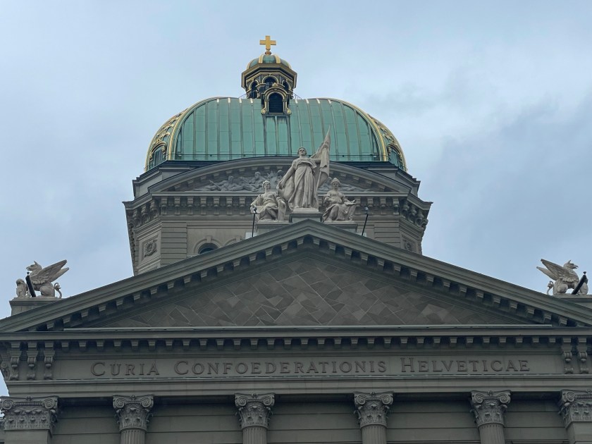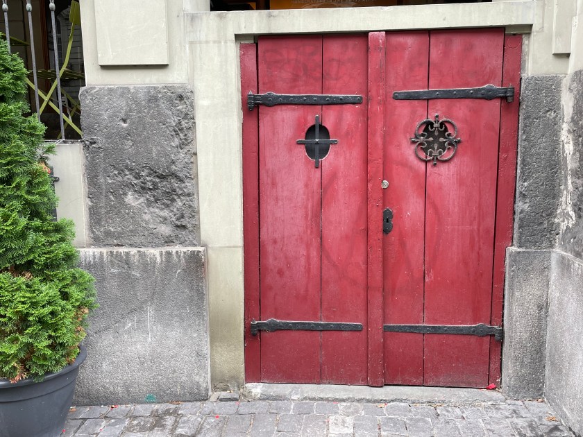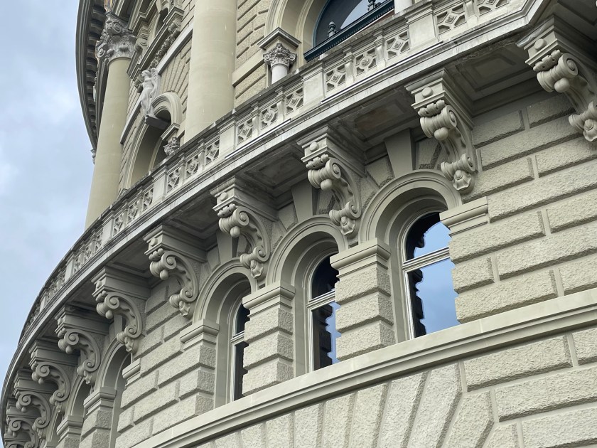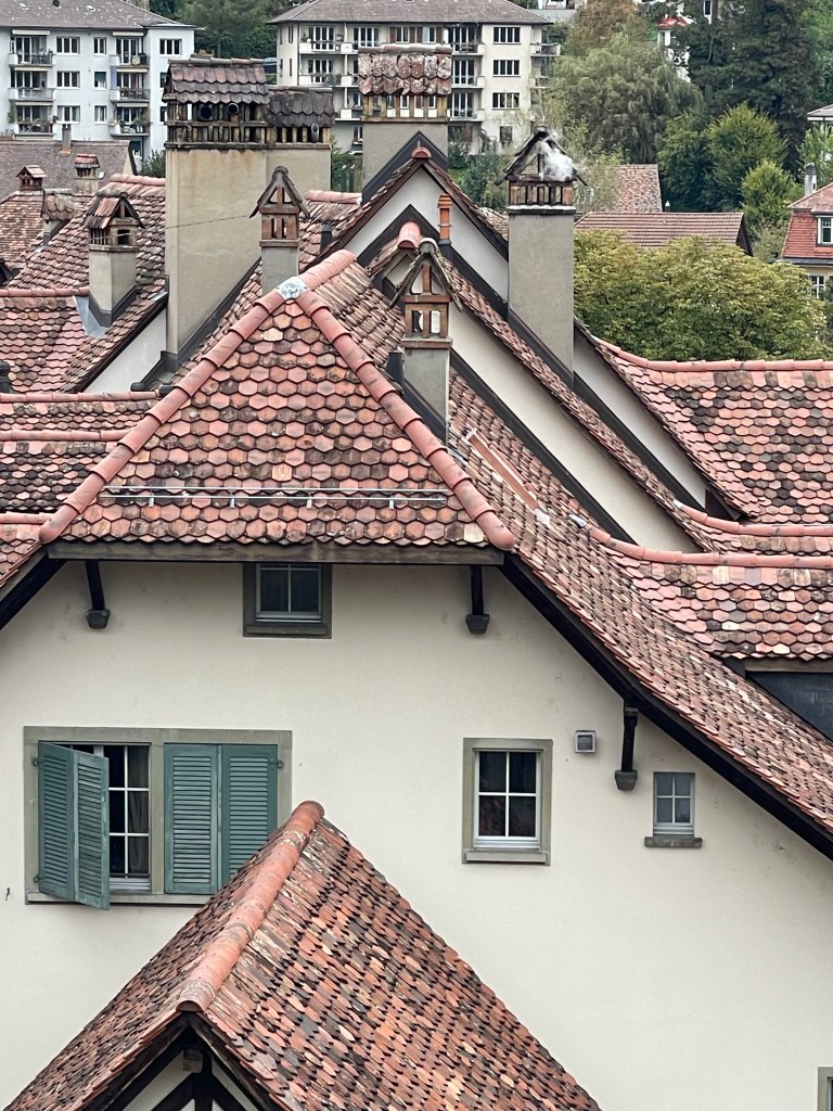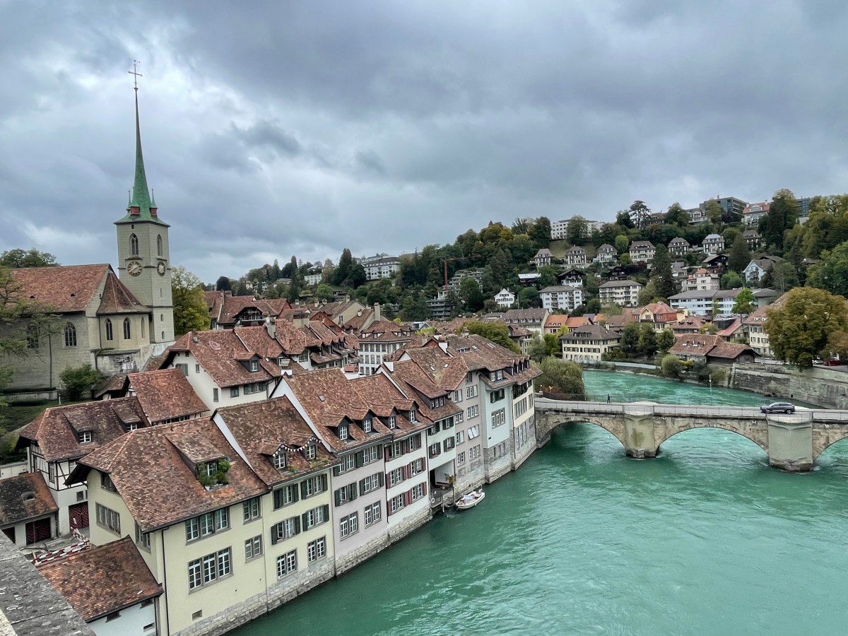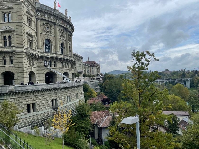 We left our cozy little Interlaken Hotel de la Paix this morning and started our trip to Bern, driving through beautiful countryside. Everything is such a luscious green, still. It looks like it could be spring’s first grass. We had an overcast day with rain off and on. We never got to see the Alps this time. Everything up there was hidden in the clouds. But everything down below is also spectacular.
