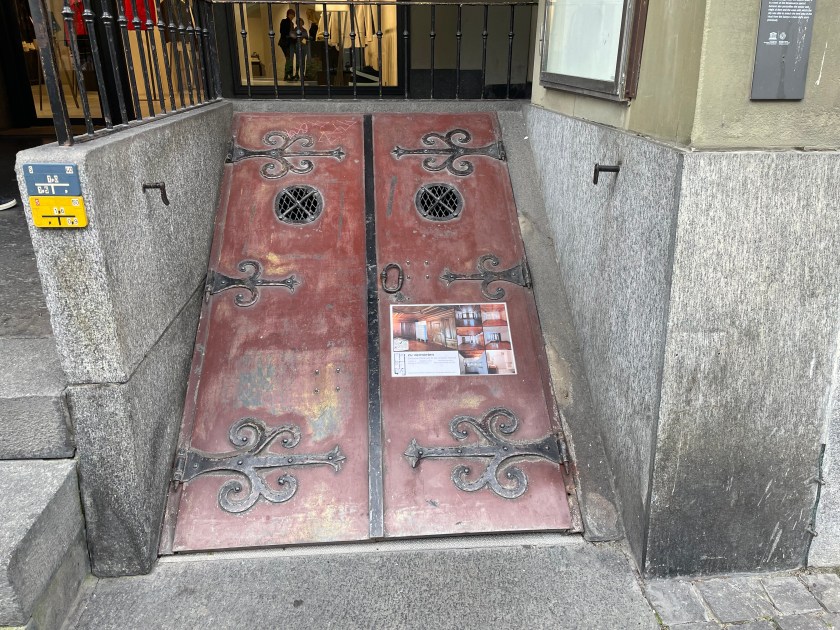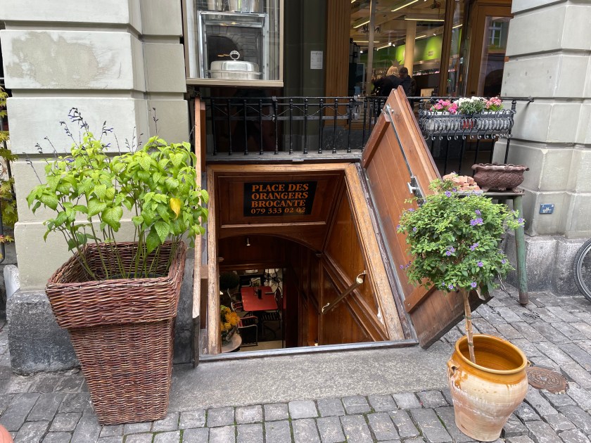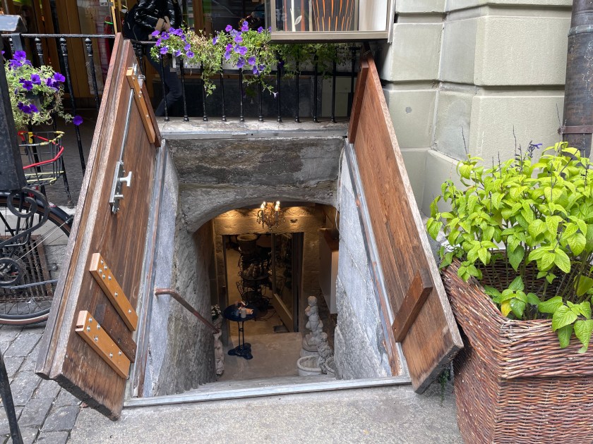 As we walked along this main boulevard in Bern, I started noticing that Bern has a whole layer of shops underground, entered through these trap doors. I enjoyed looking down into the underworld!