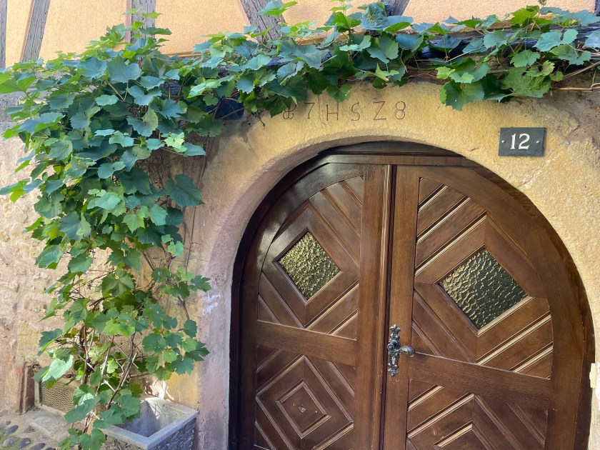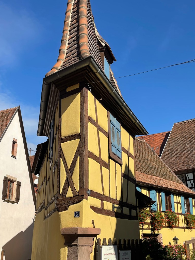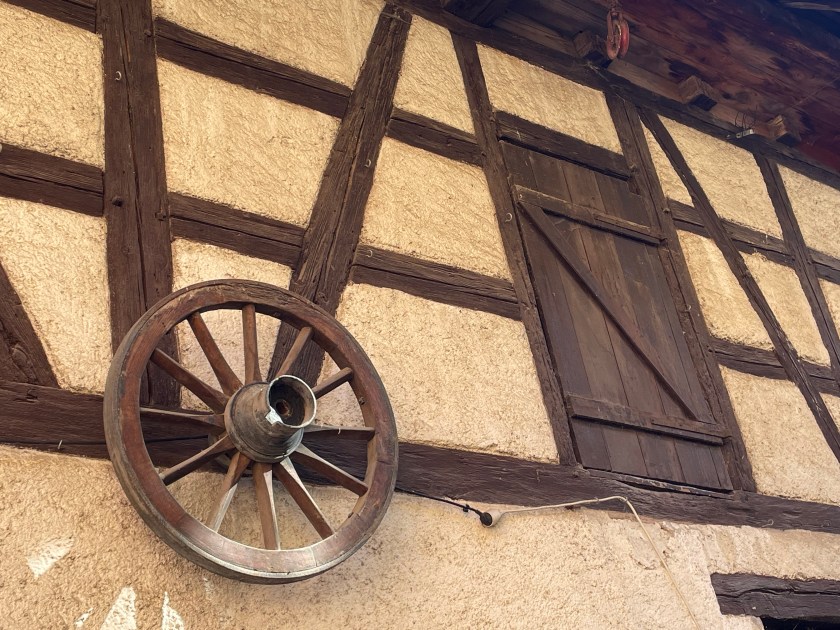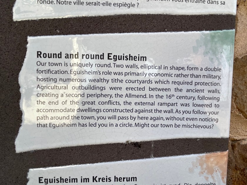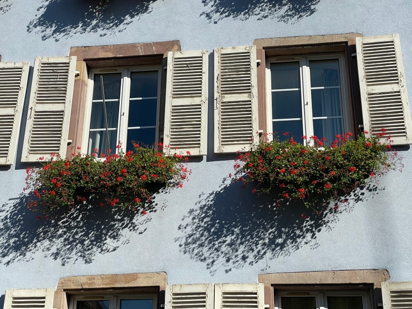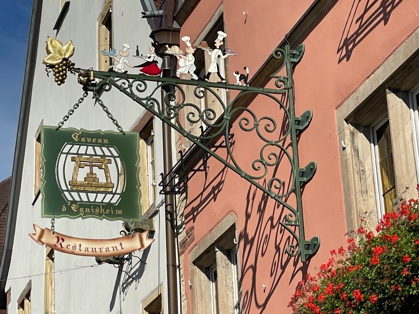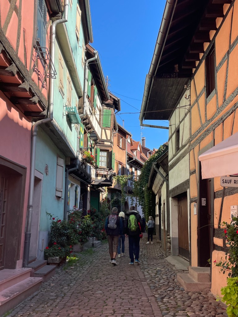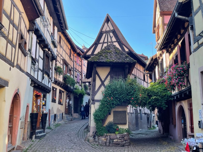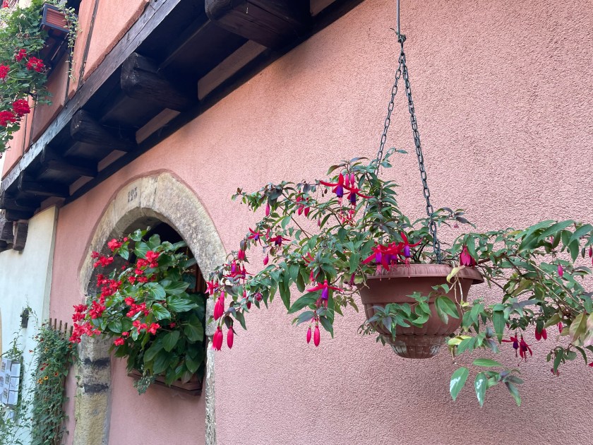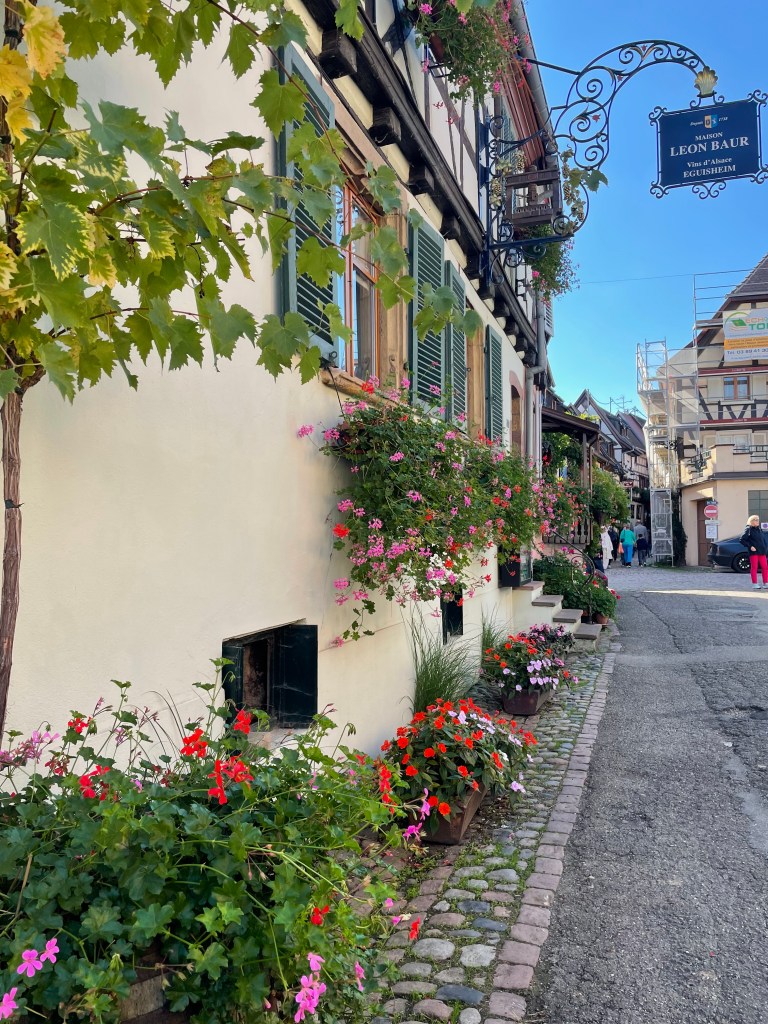 Today we drove into France to drive the Wine Route from the south end to the north. We started in Eguisheim, a town dating back to the 1500s in the shape of an oval with 2 walls, forming a double fortification. It’s a magical place we visited last year at Christmas time. It was so fun to see it this time of year with all the colorful interesting half-timber homes and flower boxes. There were lots of visitors who came to spend the day here.