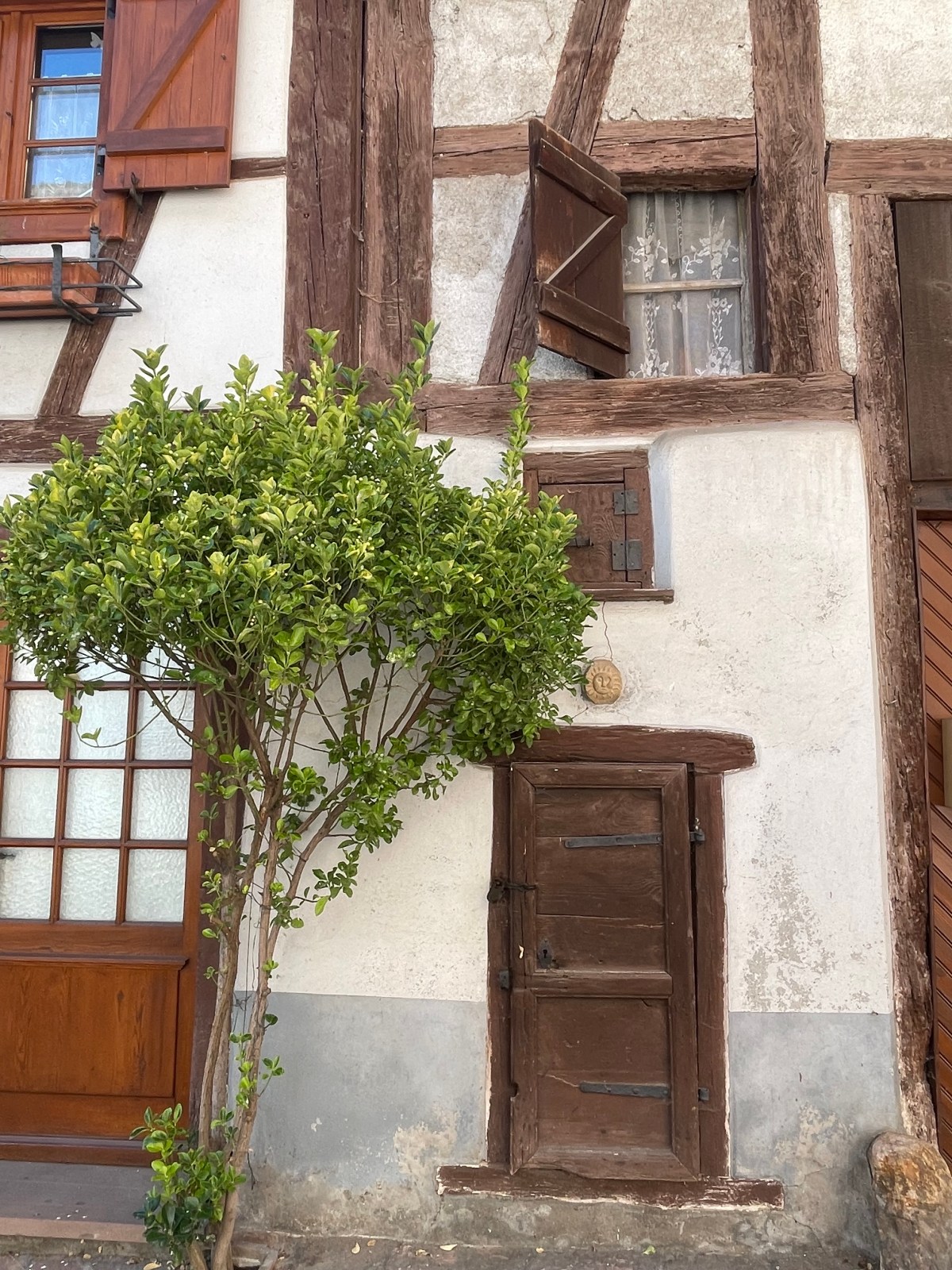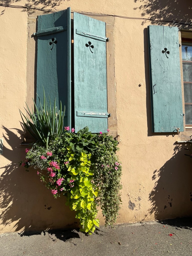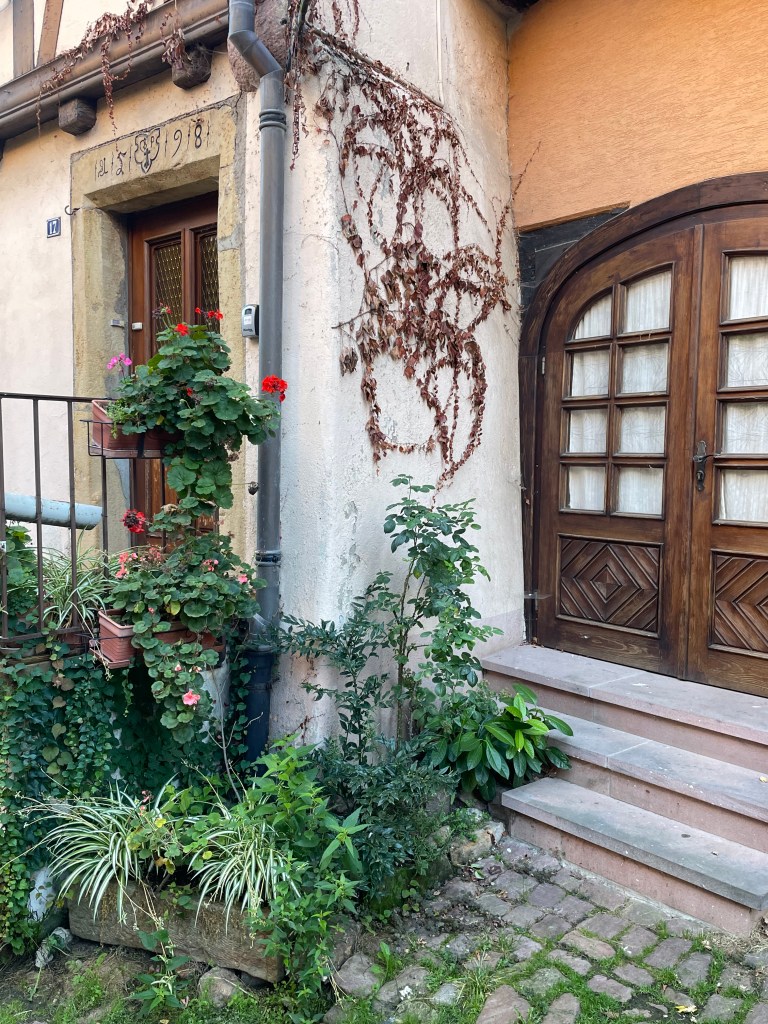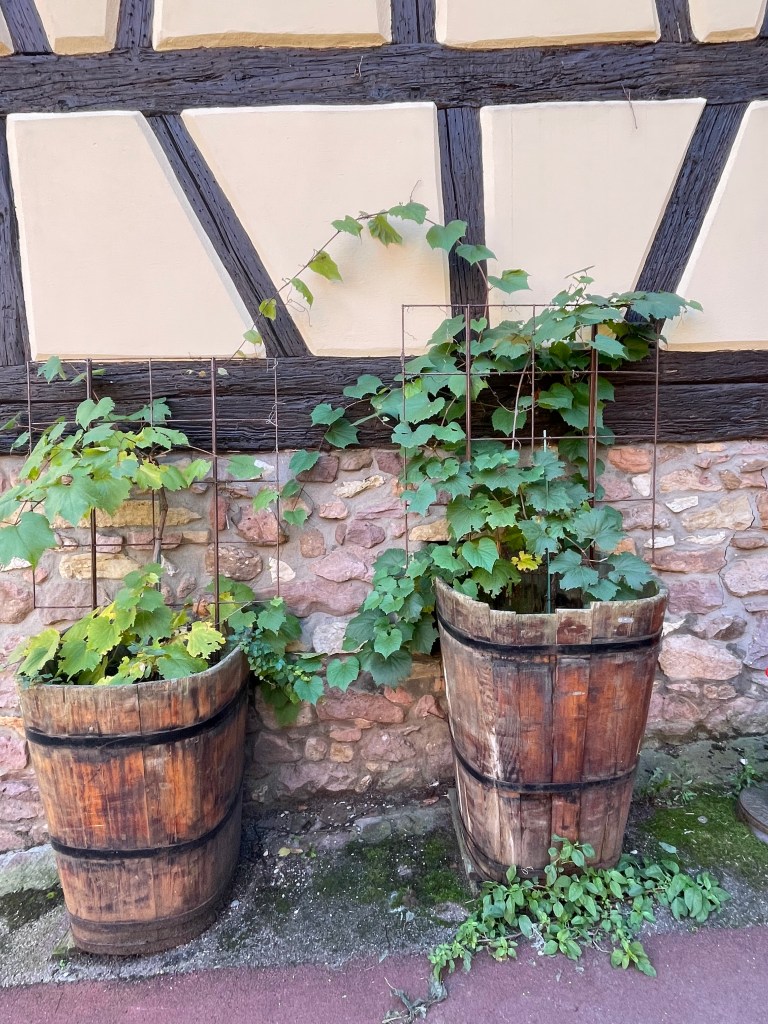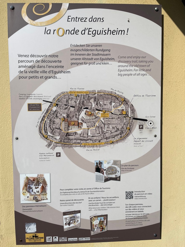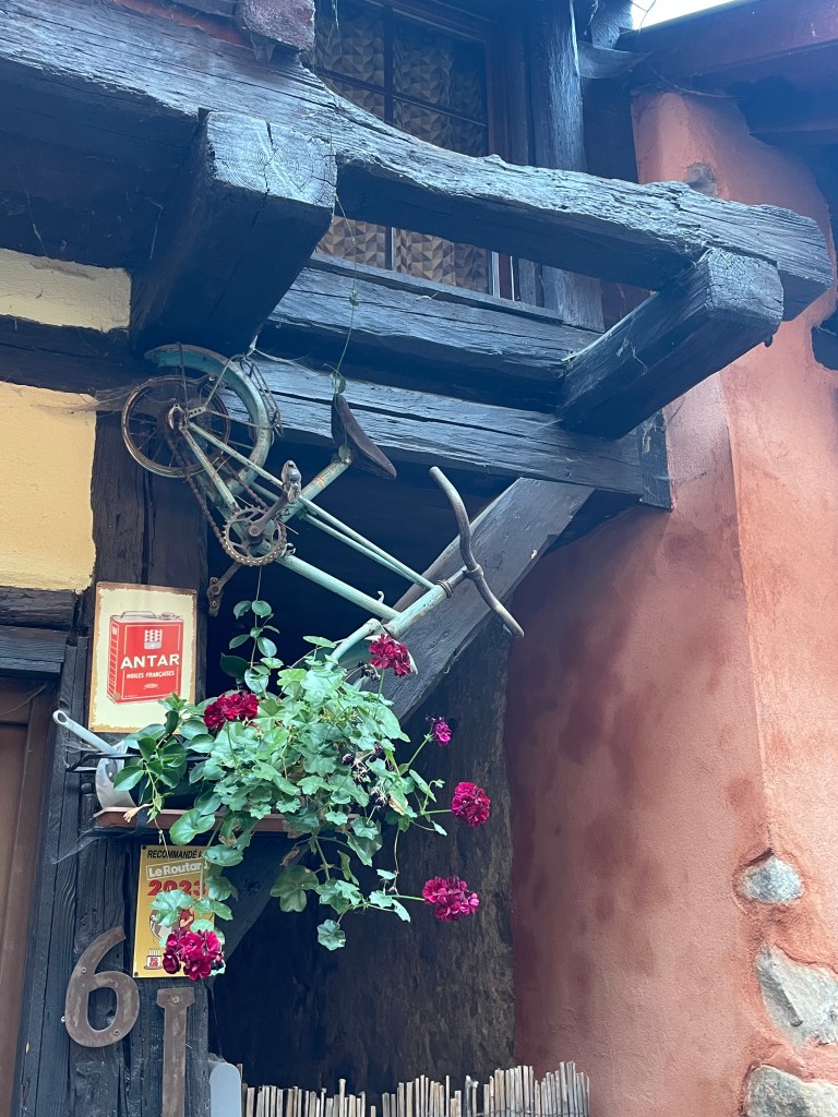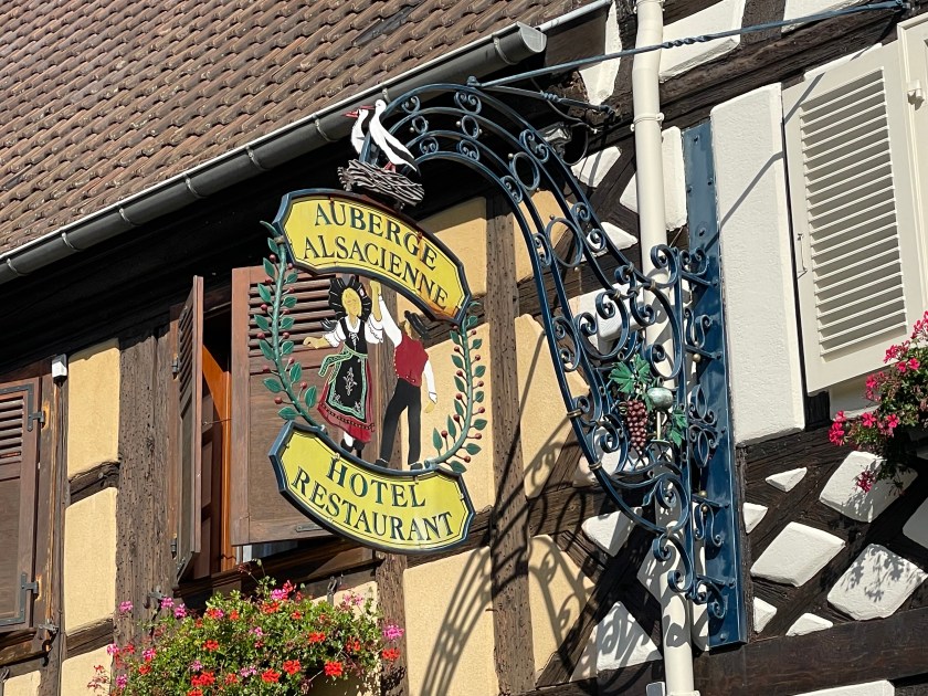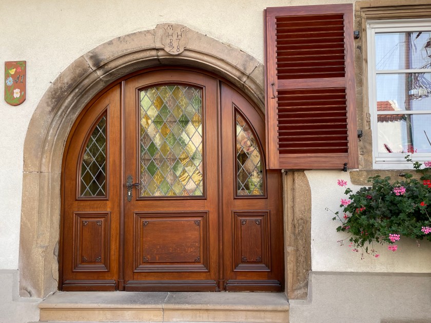 Today we drove into France to drive the Wine Route from the south end to the north. We started in Eguisheim, a town dating back to the 1500s in the shape of an oval with 2 walls, forming a double fortification. It’s a magical place we visited last year at Christmas time. It was so fun to see it this time of year with all the colorful interesting half-timber homes and flower boxes. There were lots of visitors who came to spend the day here.