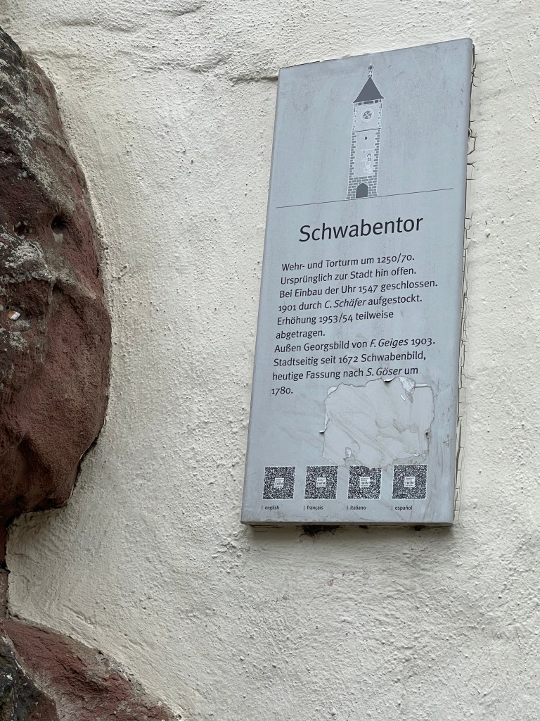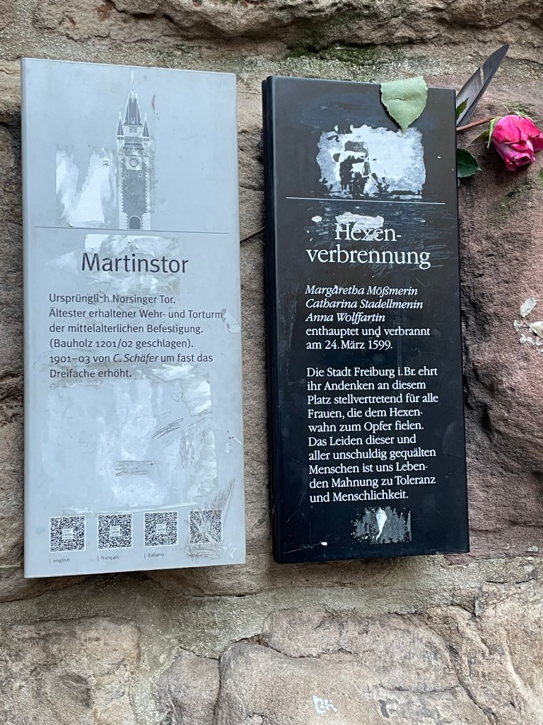 A plaque in memorial of the victims of the witch hunt is located on the inner side of Martinstor. Three widows of city councilors, Anna Wohlffartin, Catharina Stadelmennin and Margaretha Mößmerin, were beheaded and burnt during the first wave of persecutions from 1599 onwards. They are remembered in honor of all victims from the 16th and 17th centuries. Although Martinstor was chosen as the memorial for the witch hunts, it was mostly a prison for debtors rather than witches, giving rise to an expression that translates to: “they dressed him with the Martin’s coat.”