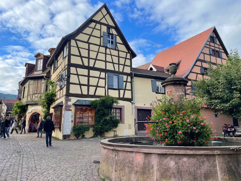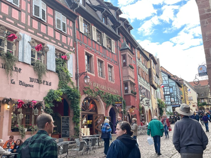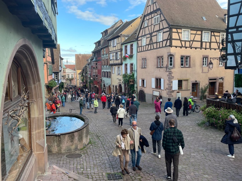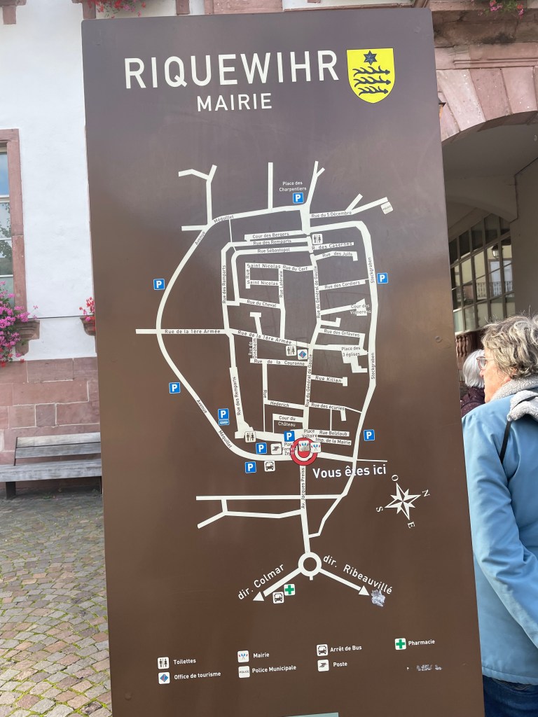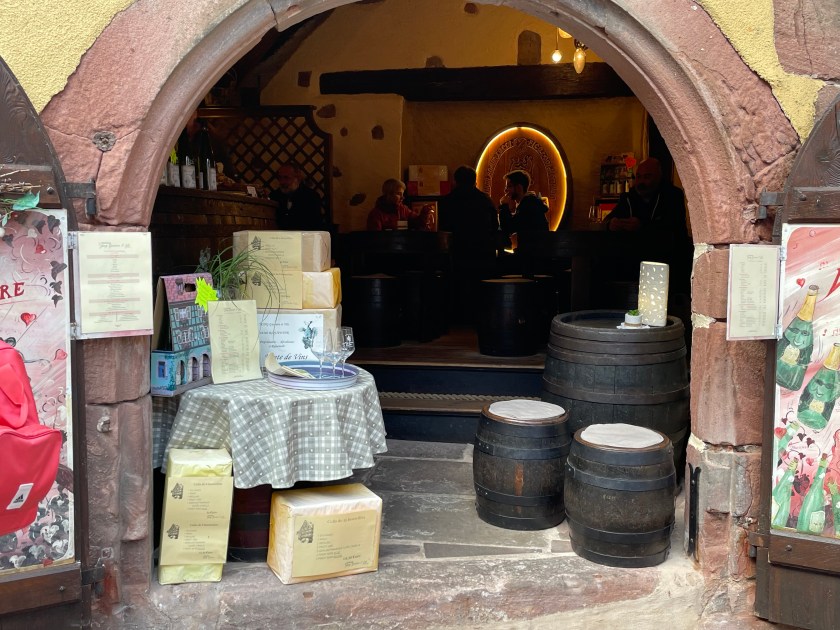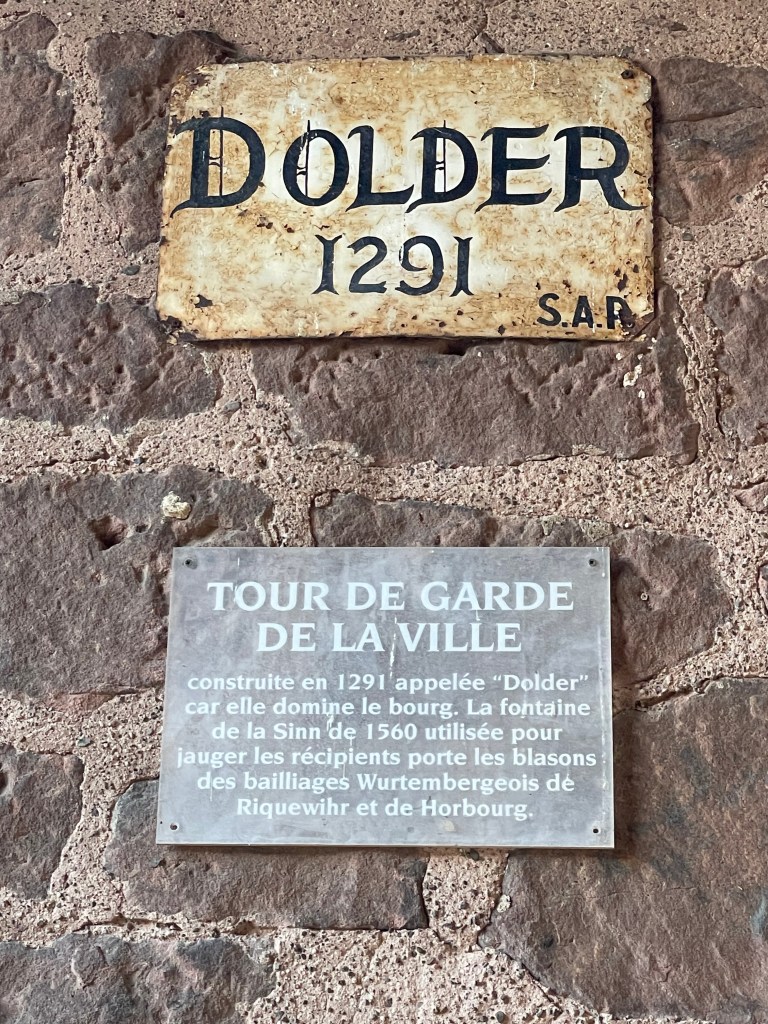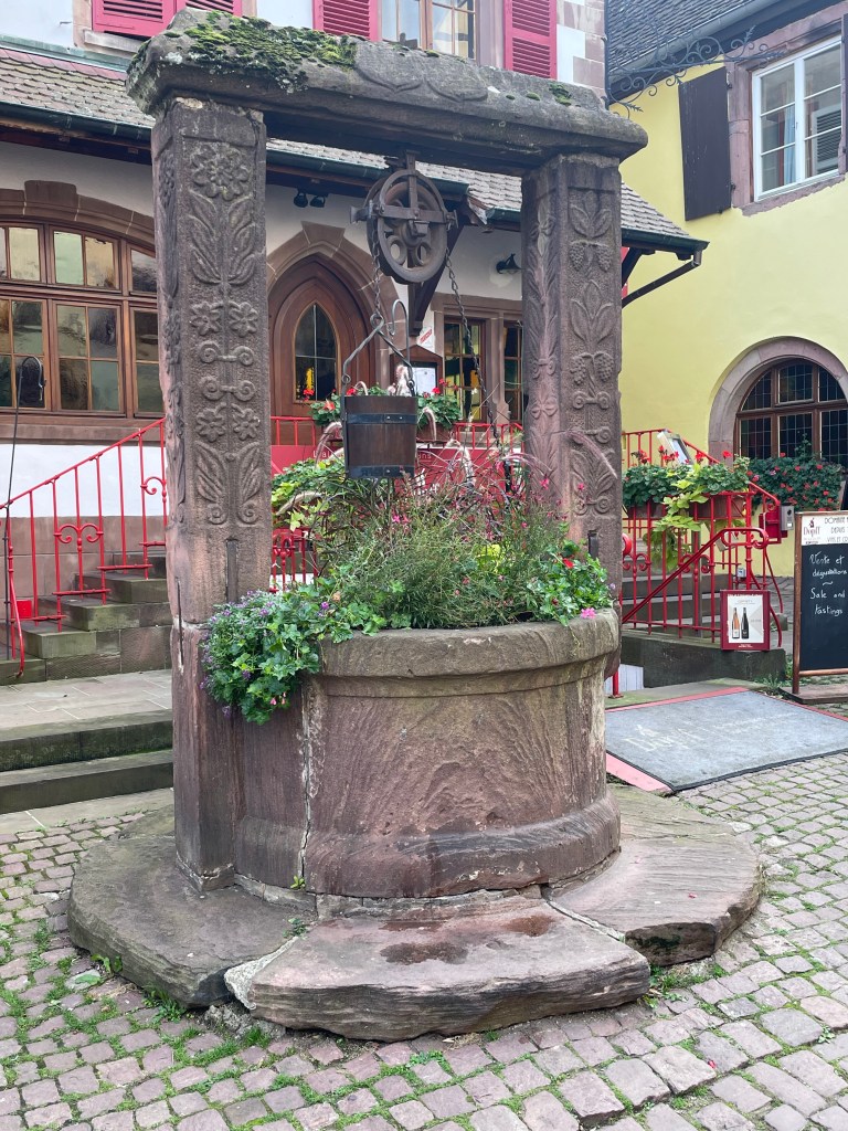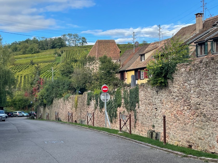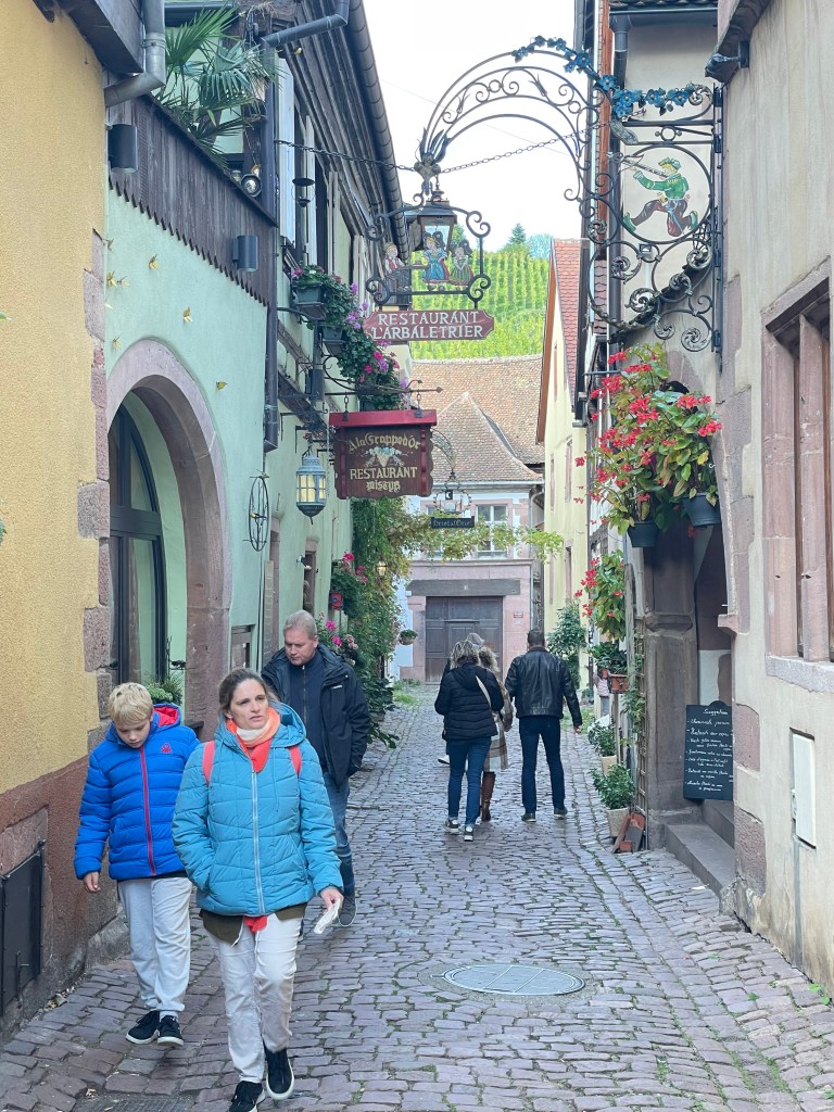 We walked through the main street in the center of Riquewihr, then circled inside the walls on the narrow cobblestone street. Last time we were here was in the dark at the end of a cold December day. It was lovely and charming and delightful to see today in the daylight.