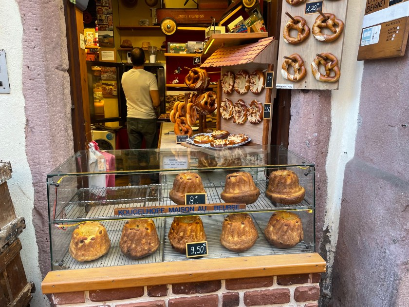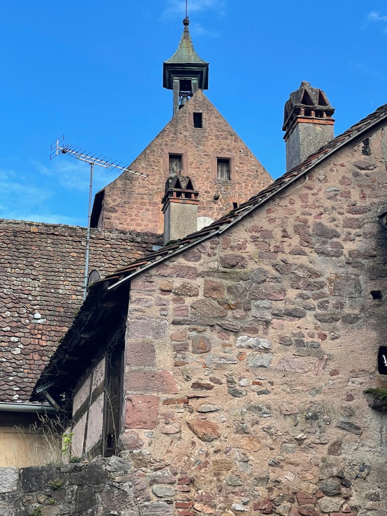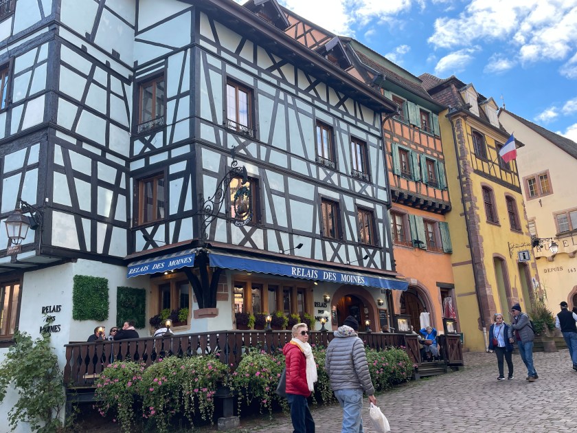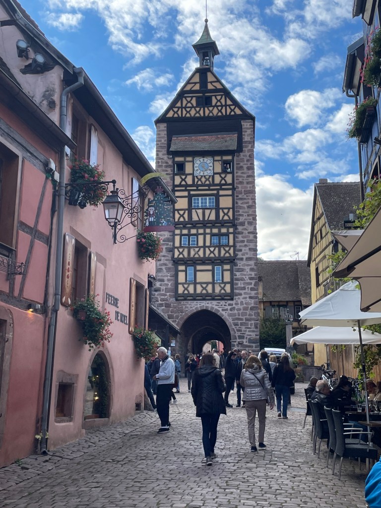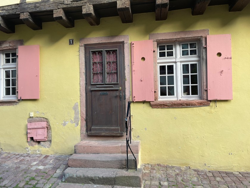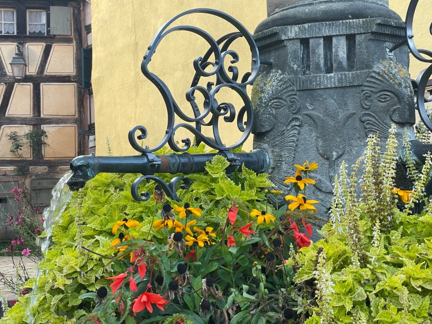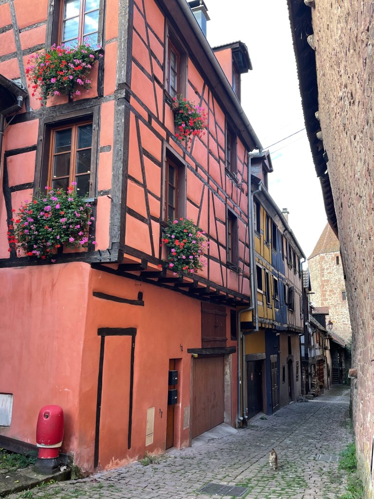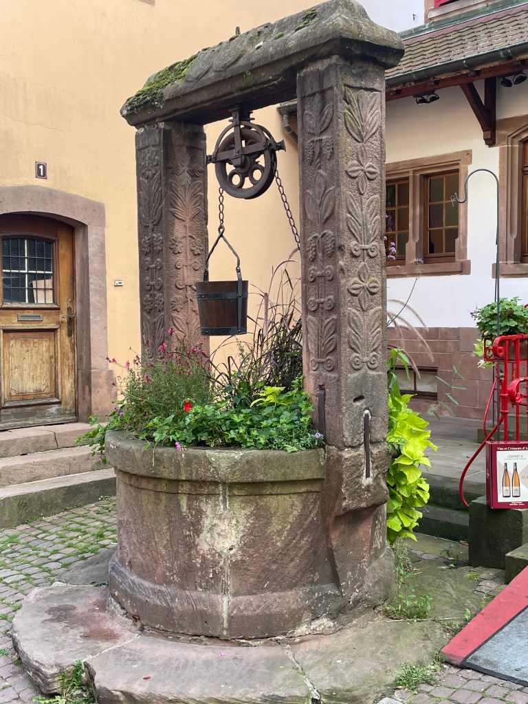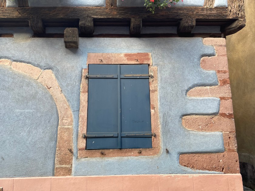 We walked through the main street in the center of Riquewihr, then circled inside the walls on the narrow cobblestone street. Last time we were here was in the dark at the end of a cold December day. It was lovely and charming and delightful to see today in the daylight.