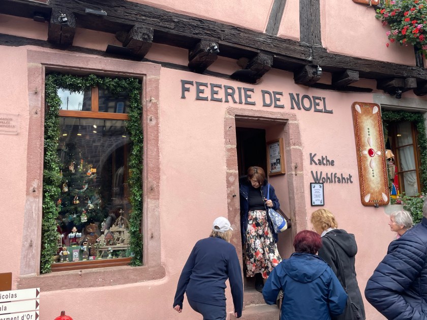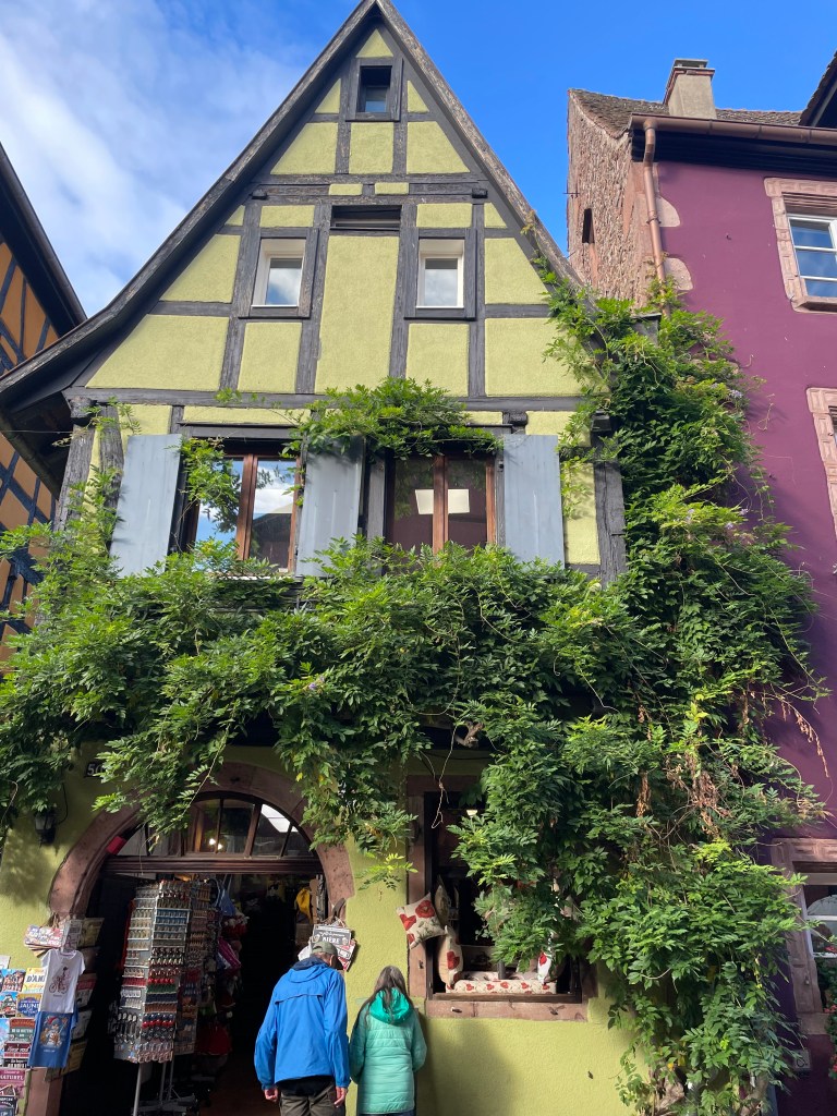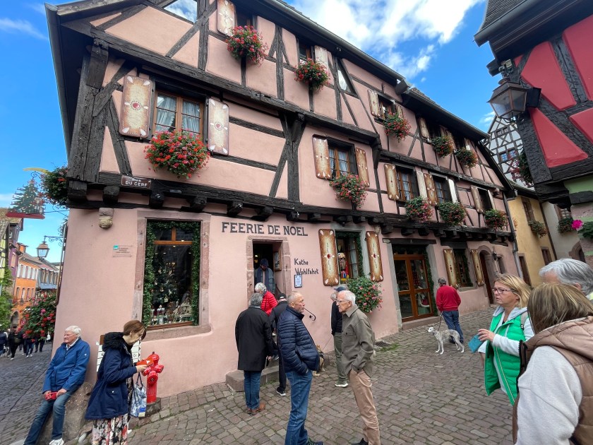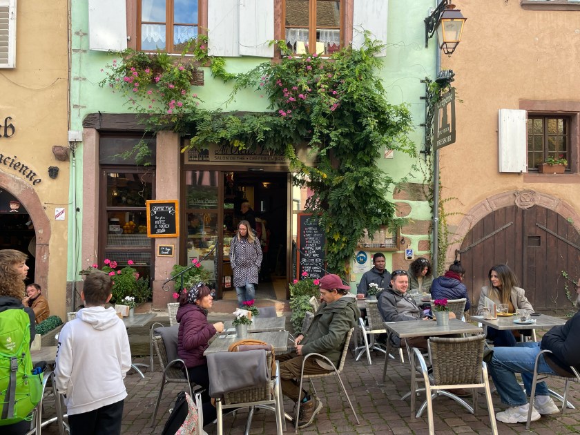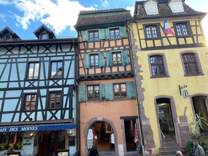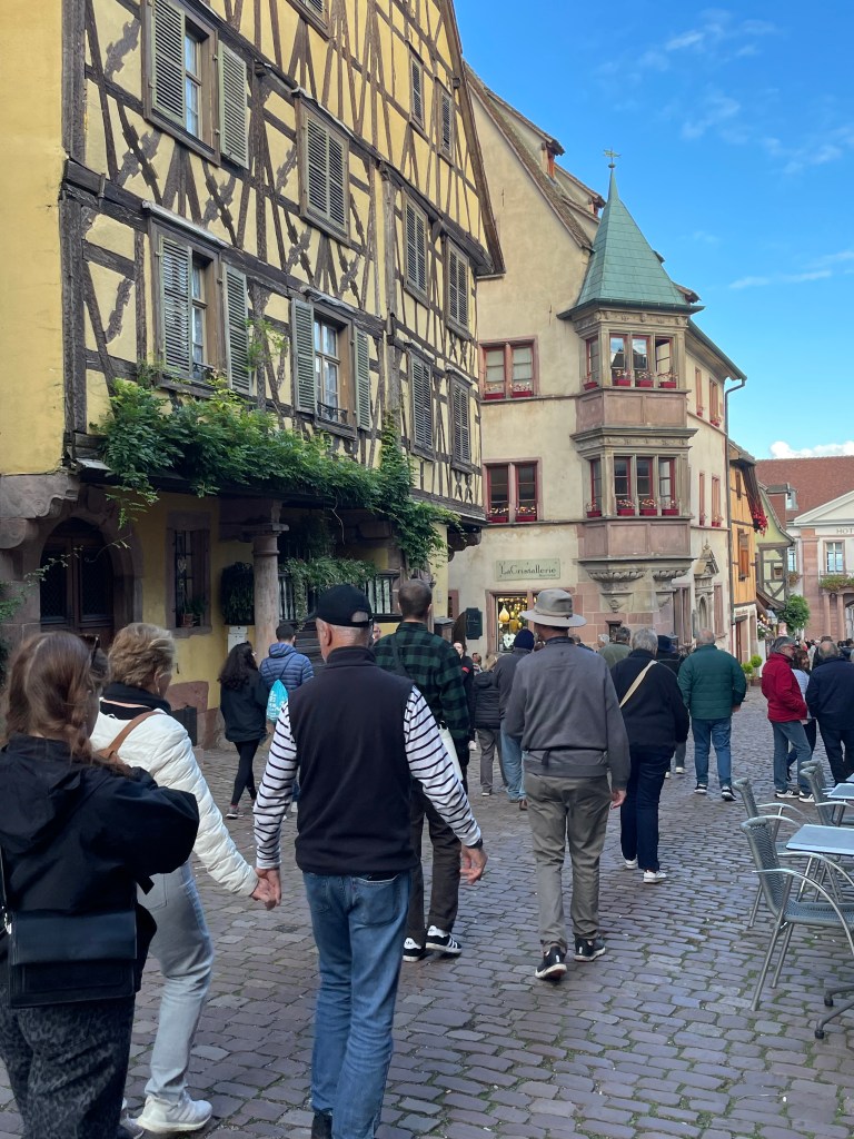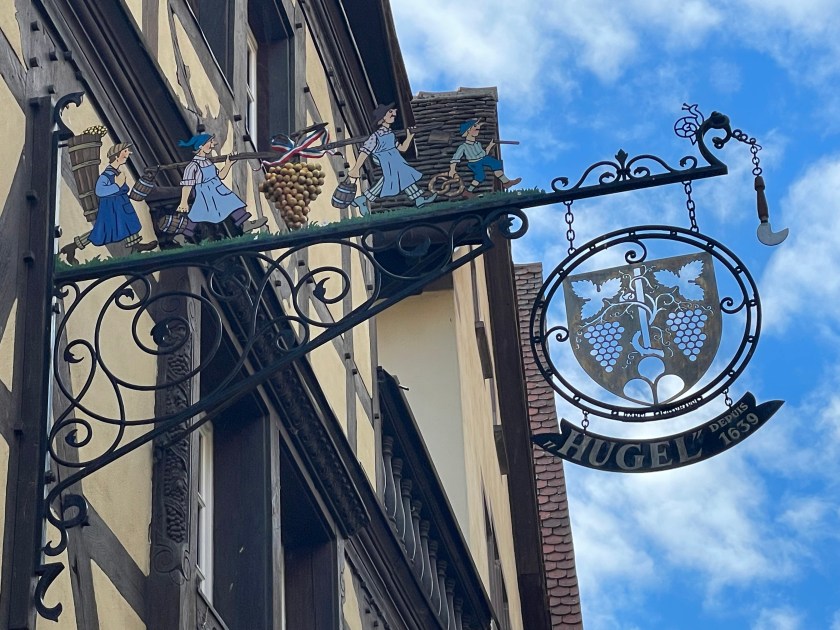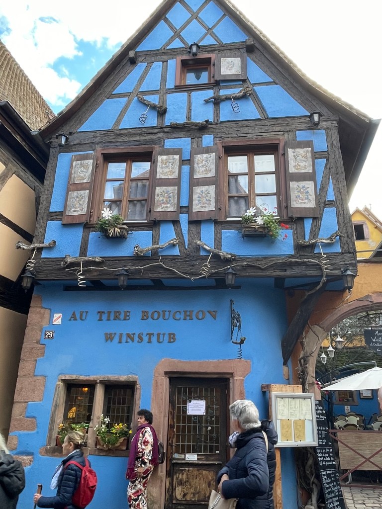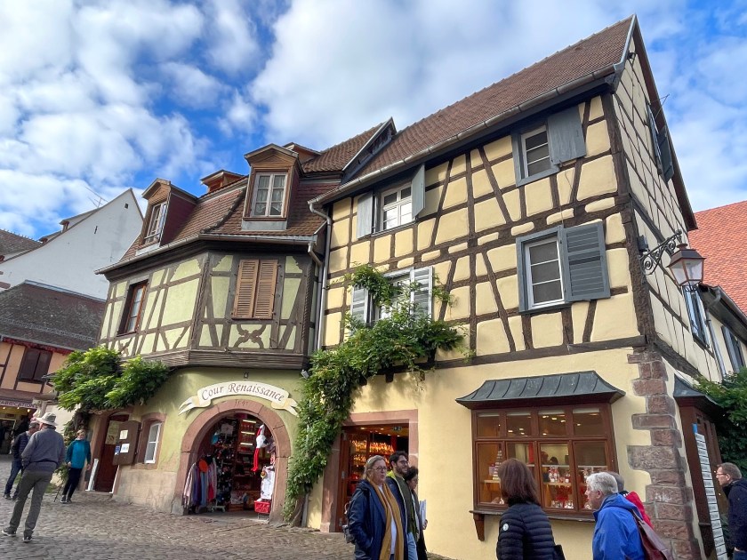 We walked through the main street in the center of Riquewihr, then circled inside the walls on the narrow cobblestone street. Last time we were here was in the dark at the end of a cold December day. It was lovely and charming and delightful to see today in the daylight.